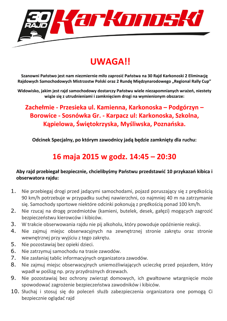 UWAGA!! Szanowni Państwo jest nam niezmiernie miło zaprosić Państwa na 30 Rajd Karkonoski 2 Eliminację Rajdowych Samochodowych Mistrzostw Polski oraz 2 Rundę Międzynarodowego „Regional Rally Cup” Widowisko, jakim jest rajd samochodowy dostarczy Państwu wiele niezapomnianych wrażeń, niestety wiąże się z utrudnieniami i zamknięciem drogi na wymienionym obszarze: Zachełmie - Przesieka ul. Kamienna, Karkonoska – Podgórzyn – Borowice - Sosnówka Gr. - Karpacz ul: Karkonoska, Szkolna, Kąpielowa, Świętokrzyska, Myśliwska, Poznańska. Odcinek Specjalny, po którym zawodnicy jadą będzie zamknięty dla ruchu: 16 maja 2015 w godz. 14:45 – 20:30 Aby rajd przebiegał bezpiecznie, chcielibyśmy Państwu przedstawić 10 przykazań kibica i obserwatora rajdu: 1. Nie przebiegaj drogi przed jadącymi samochodami, pojazd poruszający się z prędkością 90 km/h potrzebuje w przypadku suchej nawierzchni, co najmniej 40 m na zatrzymanie się. Samochody sportowe niektóre odcinki pokonują z prędkością ponad 100 km/h. 2. Nie rzucaj na drogę przedmiotów (kamieni, butelek, desek, gałęzi) mogących zagrozić bezpieczeństwu kierowców i kibiców. 3. W trakcie obserwowania rajdu nie pij alkoholu, który powoduje opóźnienie reakcji. 4. Nie zajmuj miejsc obserwacyjnych na zewnętrznej stronie zakrętu oraz stronie wewnętrznej przy wyjściu z tego zakrętu. 5. Nie pozostawiaj bez opieki dzieci. 6. Nie zatrzymuj samochodu na trasie zawodów. 7. Nie zasłaniaj tablic informacyjnych organizatora zawodów. 8. Nie zajmuj miejsc obserwacyjnych uniemożliwiających ucieczkę przed pojazdem, który wpadł w poślizg np. przy przydrożnych drzewach. 9. Nie pozostawiaj bez ochrony zwierząt domowych, ich gwałtowne wtargnięcie może spowodować zagrożenie bezpieczeństwa zawodników i kibiców. 10. Słuchaj i stosuj się do poleceń służb zabezpieczenia organizatora one pomogą Ci bezpiecznie oglądać rajd Rys., 1. Aby skrócić trasę przejazdu kierowca maksymalnie zetnie zakręt po poboczu. Po wyjściu z zakrętu samochód może zostać wyrzucony na zewnętrzne pobocze. Rys. 2. Pamiętaj, że każdy błąd kierowcy przy najechaniu na "hopę" może spowodować lot samochodu w nieprzewidzianym kierunku. Rys. 3. Kierowca wjeżdżając w zakręt umiejscowiony na skrzyżowaniu ma bardzo ograniczone pole manewru. Będzie ścinać zakręt jadąc po wewnętrznym poboczu. Nie stój po zewnętrznej stronie zakrętu. Rys. 4. Zakręt o dużej skali trudności, nie wolno stać po zewnętrznej stronie na całej długości zakrętu. PRZEPRASZAJĄC PAŃSTWA ZA UTRUDNIENIA, PROSIMY O DYSCYPLINĘ I STOSOWANIE SIĘ DO POLECEŃ SŁUŻB ZABEZPIECZENIA ORGANIZATORA, TAK, ABY RAJD SAMOCHODOWY PRZEBIEGAŁ BEZPIECZNIE DLA WSZYSTKICH. PRZEPRASZAMY ZA UTRUDNIENIA I DZIĘKUJEMY Organizator: Automobilklub Karkonoski Jelenia Góra – Tel. 075 75 545 59 (do dnia 15 maja) Biuro Rajdu - Tel. 796 572 695 (w dniach 16-17 maja)
