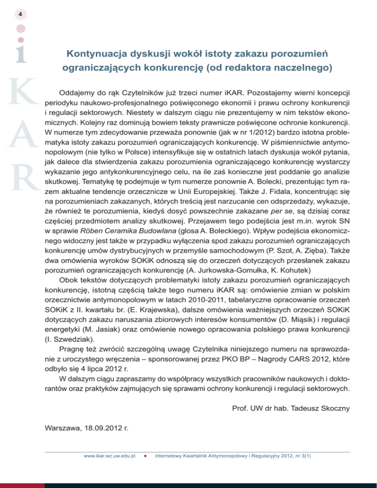 4 Kontynuacja dyskusji wokół istoty zakazu porozumień ograniczających konkurencję (od redaktora naczelnego) Oddajemy do rąk Czytelników już trzeci numer iKAR. Pozostajemy wierni koncepcji periodyku naukowo-profesjonalnego poświęconego ekonomii i prawu ochrony konkurencji i regulacji sektorowych. Niestety w dalszym ciągu nie prezentujemy w nim tekstów ekonomicznych. Kolejny raz dominują bowiem teksty prawnicze poświęcone ochronie konkurencji. W numerze tym zdecydowanie przeważa ponownie (jak w nr 1/2012) bardzo istotna problematyka istoty zakazu porozumień ograniczających konkurencję. W piśmiennictwie antymonopolowym (nie tylko w Polsce) intensyfikuje się w ostatnich latach dyskusja wokół pytania, jak dalece dla stwierdzenia zakazu porozumienia ograniczającego konkurencję wystarczy wykazanie jego antykonkurencyjnego celu, na ile zaś konieczne jest poddanie go analizie skutkowej. Tematykę tę podejmuje w tym numerze ponownie A. Bolecki, prezentując tym razem aktualne tendencje orzecznicze w Unii Europejskiej. Także J. Fidala, koncentrując się na porozumieniach zakazanych, których treścią jest narzucanie cen odsprzedaży, wykazuje, że również te porozumienia, kiedyś dosyć powszechnie zakazane per se, są dzisiaj coraz częściej przedmiotem analizy skutkowej. Przejawem tego podejścia jest m.in. wyrok SN w sprawie Röben Ceramika Budowlana (glosa A. Boleckiego). Wpływ podejścia ekonomicznego widoczny jest także w przypadku wyłączenia spod zakazu porozumień ograniczających konkurencję umów dystrybucyjnych w przemyśle samochodowym (P. Szot, A. Zięba). Także dwa omówienia wyroków SOKiK odnoszą się do orzeczeń dotyczących przesłanek zakazu porozumień ograniczających konkurencję (A. Jurkowska-Gomułka, K. Kohutek) Obok tekstów dotyczących problematyki istoty zakazu porozumień ograniczających konkurencję, istotną częścią także tego numeru iKAR są: omówienie zmian w polskim orzecznictwie antymonopolowym w latach 2010-2011, tabelaryczne opracowanie orzeczeń SOKiK z II. kwartału br. (E. Krajewska), dalsze omówienia ważniejszych orzeczeń SOKiK dotyczących zakazu naruszania zbiorowych interesów konsumentów (D. Miąsik) i regulacji energetyki (M. Jasiak) oraz omówienie nowego opracowania polskiego prawa konkurencji (I. Szwedziak). Pragnę też zwrócić szczególną uwagę Czytelnika niniejszego numeru na sprawozdanie z uroczystego wręczenia – sponsorowanej przez PKO BP – Nagrody CARS 2012, które odbyło się 4 lipca 2012 r. W dalszym ciągu zapraszamy do współpracy wszystkich pracowników naukowych i doktorantów oraz praktyków zajmujących się sprawami ochrony konkurencji i regulacji sektorowych. Prof. UW dr hab. Tadeusz Skoczny Warszawa, 18.09.2012 r. www.ikar.wz.uw.edu.pl internetowy Kwartalnik Antymonopolowy i Regulacyjny 2012, nr 3(1)