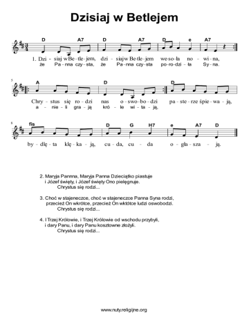 Dzisiaj w Betlejem D  3  4 A7 D e A7             siaj w Be tle jem, dzi siajw Be tle jem we so ła no wi na, że Pa nna czy sta, Pa nna czy sta po ro dzi ła Sy na. 5   A    a      stus się ro dzi nas nie  fis    by że A7 D Chry 8       1. Dzi D li gra ją kró D             o swo bo dzi le D  dlę ta   klę ka  ją,   wi ta pa ste rze śpie wa ją, G H7 e    cu da, cu da o 2. Maryja Pannna, Maryja Panna Dzieciątko piastuje i Józef święty, i Józef święty Ono pielęgnuje. Chrystus się rodzi... 3. Choć w stajeneczce, choć w stajeneczce Panna Syna rodzi, przecież On wkrótce, przecież On wktótce ludzi oswobodzi. Chrystus się rodzi... 4. I Trzej Królowie, i Trzej Królowie od wschodu przybyli, i dary Panu, i dary Panu kosztowne złożyli. Chrystus się rodzi... www.nuty.religijne.org  A7 D   gła sza ją. ją,