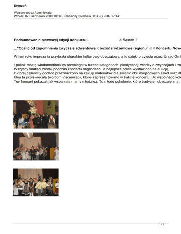 Styczeń Wpisany przez Administrator Wtorek, 07 Październik 2008 18:06 - Zmieniony Niedziela, 08 Luty 2009 17:14 Podsumowanie pierwszej edycji konkursu... / Bastek / ..."Ocalić od zapomnienia zwyczaje adwentowe i bożonarodzeniowe regionu" i II Koncertu Nowo W tym roku impreza ta przybrała charakter kulturowo-obyczajowy, a to dzięki przyjęciu przez Urząd Gmi / pokaż resztę wiadomości... Konkurs / przebiegał w trzech kategoriach: plastycznej; wiedzy o zwyczajach i tra Wszyscy finaliści zostali podczas koncertu nagrodzeni, a najlepsze prace wystawiono na aukcję, z której całkowity dochód przeznaczono na zakup materiałów dla świetlic obu miejscowych szkół oraz dl Idea ta przyświecała twórcom inscenizacji, które zaprezentowano w trakcie koncertu. Do wspólnego kolę Ten koncert pokazał, jak wspaniałą mamy młodzież. To młode pokolenie, które tradycje i obyczaje zna ty 1/2 Styczeń Wpisany przez Administrator Wtorek, 07 Październik 2008 18:06 - Zmieniony Niedziela, 08 Luty 2009 17:14 współorganizator Bożena Tobiasz Puchar w wyniki biegach Blisko sto lat Magurki liczą tradycje narciarskie Magurki. otwartych Kiedyś patronowała im/ Bastek / Arcyksiężna Maria Teresa, która ] [ narciarskich zdjęcia ] Na imprezę zapraszają organizatorzy Bieg Urząd odbędzie Gminy - Wilkowice się w ,Wilkowicach przy schronisku Ludowy (909 m.n.p.m) na Magurce Sportowy ,12 luteg Zabawa Dochodowa w-zapraszają sali OSP Wilkowice. / Sławek / -/Przedszkole Słowem Bilety ZAPRASZAMY! pokaż 4 ciepłe atrakcyjna doskonalą resztę Szampańska dania, loterie orkiestrę; publiczne 70zł wiadomości... zimna fantową; od zabawę osoby i Szkoła płytę, Organizatorzy //można napoje; Podstawowa samego nabyć zapewniają rana! w kancelarii w Wilkowicach przedszkola zapraszają lub sekretariacie na Zabawę Dochodową, szkoły od 12 która stycz o Punkt poradnictwa zawodowego -kolęd [Artystycznym pobierz dokument ]przy 2 stycznia br. za Bielskim Stowarzyszeniem Bielskie Stowarzyszenie oraz Artystyczne "Teatr Grodzki". "Teatr Grodzki" Związek Inwalidów Narządu rozpocz R VIw cenie spotkanie zsię kolędą [- do program ]Klub [ Śląskiej zdjęcia Polski Związek Chórów i Orkiestr VI SPOTKANIE Z KOLĘDĄ w Bielsku-Białej, 8 stycznia Gminna 2006 roku Biblioteka w Kościele Publiczna Parafialnym w Wilkowicach w Bystrej Koncert Krzysztofa Fetraś iOddział Gitara Orkiestra /6 pokaż stycznia resztę wiadomości... Przedstawią w kościele parafialnym oryginalne autorskie Krzysztof Wniebowzięcia kompozycje Fetraś NMP a także z Warszawy. w Bystrej standardy, Wspaniały jazz, folk Zespołu ul. polski i blue Szcz "Kolędujmy Jezusowi" konkurs i pw. pastorałek / Bastek / Konkurs odbędzie 15 stycznia 2006 roku w Kościele Parafialnym w Mesznej. Z [ Do wspólnego kolędowania regulaminem ] zapoznać organizatorzy: można Gminna się w Szkole Biblioteka Podstawowej Publiczna oraz w Mesznej. Stowarzyszenie Informacja 2/2