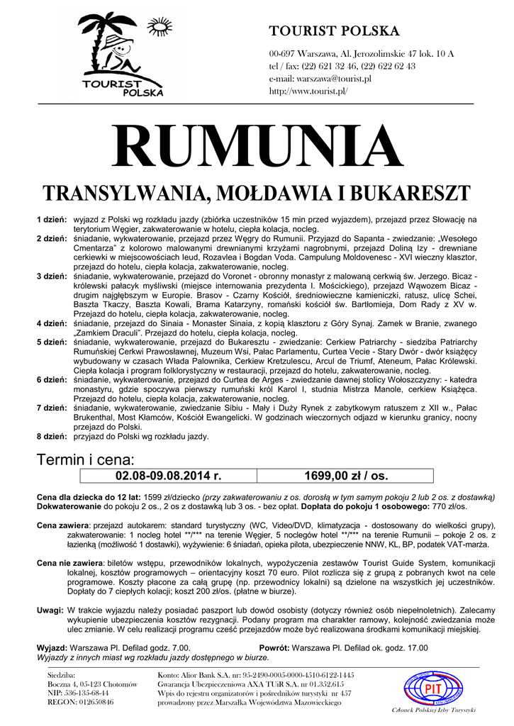 TOURIST POLSKA 00-697 Warszawa, Al. Jerozolimskie 47 lok. 10 A tel / fax: (22) 621 32 46, (22) 622 62 43 e-mail: [email protected] http://www.tourist.pl/ RUMUNIA TRANSYLWANIA, MOŁDAWIA I BUKARESZT 1 dzień: wyjazd z Polski wg rozkładu jazdy (zbiórka uczestników 15 min przed wyjazdem), przejazd przez Słowację na terytorium Węgier, zakwaterowanie w hotelu, ciepła kolacja, nocleg. 2 dzień: śniadanie, wykwaterowanie, przejazd przez Węgry do Rumunii. Przyjazd do Sapanta - zwiedzanie: „Wesołego Cmentarza” z kolorowo malowanymi drewnianymi krzyżami nagrobnymi, przejazd Doliną Izy - drewniane cerkiewki w miejscowościach Ieud, Rozavlea i Bogdan Voda. Campulung Moldovenesc - XVI wieczny klasztor, przejazd do hotelu, ciepła kolacja, zakwaterowanie, nocleg. 3 dzień: śniadanie, wykwaterowanie, przejazd do Voronet - obronny monastyr z malowaną cerkwią św. Jerzego. Bicaz królewski pałacyk myśliwski (miejsce internowania prezydenta I. Mościckiego), przejazd Wąwozem Bicaz drugim najgłębszym w Europie. Brasov - Czarny Kościół, średniowieczne kamieniczki, ratusz, ulicę Schei, Baszta Tkaczy, Baszta Kowali, Brama Katarzyny, romański kościół św. Bartłomieja, Dom Rady z XV w. Przejazd do hotelu, ciepła kolacja, zakwaterowanie, nocleg. 4 dzień: śniadanie, przejazd do Sinaia - Monaster Sinaia, z kopią klasztoru z Góry Synaj. Zamek w Branie, zwanego „Zamkiem Draculi”. Przejazd do hotelu, ciepła kolacja, nocleg. 5 dzień: śniadanie, wykwaterowanie, przejazd do Bukaresztu - zwiedzanie: Cerkiew Patriarchy - siedziba Patriarchy Rumuńskiej Cerkwi Prawosławnej, Muzeum Wsi, Pałac Parlamentu, Curtea Vecie - Stary Dwór - dwór książęcy wybudowany w czasach Włada Palownika, Cerkiew Kretzulescu, Arcul de Triumf, Ateneum, Pałac Królewski. Ciepła kolacja i program folklorystyczny w restauracji, przejazd do hotelu, zakwaterowanie, nocleg. 6 dzień: śniadanie, wykwaterowanie, przejazd do Curtea de Arges - zwiedzanie dawnej stolicy Wołoszczyzny: - katedra monastyru, gdzie spoczywa pierwszy rumuński król Karol I, studnia Mistrza Manole, cerkiew Książęca. Przejazd do hotelu, ciepła kolacja, zakwaterowanie, nocleg. 7 dzień: śniadanie, wykwaterowanie, zwiedzanie Sibiu - Mały i Duży Rynek z zabytkowym ratuszem z XII w., Pałac Brukenthal, Most Kłamców, Kościół Ewangelicki. W godzinach wieczornych odjazd w kierunku granicy, nocny przejazd do Polski. 8 dzień: przyjazd do Polski wg rozkładu jazdy. Termin i cena: 02.08-09.08.2014 r. 1699,00 zł / os. Cena dla dziecka do 12 lat: 1599 zł/dziecko (przy zakwaterowaniu z os. dorosłą w tym samym pokoju 2 lub 2 os. z dostawką) Dokwaterowanie do pokoju 2 os., 2 os z dostawką lub 3 os. - bez opłat. Dopłata do pokoju 1 osobowego: 770 zł/os. Cena zawiera: przejazd autokarem: standard turystyczny (WC, Video/DVD, klimatyzacja - dostosowany do wielkości grupy), zakwaterowanie: 1 nocleg hotel **/*** na terenie Węgier, 5 noclegów hotel **/*** na terenie Rumunii – pokoje 2 os. z łazienką (możliwość 1 dostawki), wyżywienie: 6 śniadań, opieka pilota, ubezpieczenie NNW, KL, BP, podatek VAT-marża. Cena nie zawiera: biletów wstępu, przewodników lokalnych, wypożyczenia zestawów Tourist Guide System, komunikacji lokalnej, kosztów programowych – orientacyjny koszt 70 euro. Pilot rozlicza się z grupą z pobranych kwot na cele programowe. Koszty płacone za całą grupę (np. przewodnicy lokalni) są dzielone na wszystkich jej uczestników. Dopłaty do 7 ciepłych kolacji; koszt 200 zł/os. (płatne w biurze). Uwagi: W trakcie wyjazdu należy posiadać paszport lub dowód osobisty (dotyczy również osób niepełnoletnich). Zalecamy wykupienie ubezpieczenia kosztów rezygnacji. Podany program ma charakter ramowy, kolejność zwiedzania może ulec zmianie. W celu realizacji programu cześć przejazdów może być realizowana środkami komunikacji miejskiej. Wyjazd: Warszawa Pl. Defilad godz. 7.00. Powrót: Warszawa Pl. Defilad ok. godz. 17.00 Wyjazdy z innych miast wg rozkładu jazdy dostępnego w biurze. Siedziba: Boczna 4, 05-123 Chotomów NIP: 536-135-68-44 REGON: 012650846 Konto: Alior Bank S.A. nr: 95-2490-0005-0000-4510-6122-1445 Gwarancja Ubezpieczeniowa AXA TUiR S.A. nr 01.352.615 Wpis do rejestru organizatorów i pośredników turystyki nr 457 prowadzony przez Marszałka Województwa Mazowieckiego Cz ł onek Polskiej Izby Turystyki