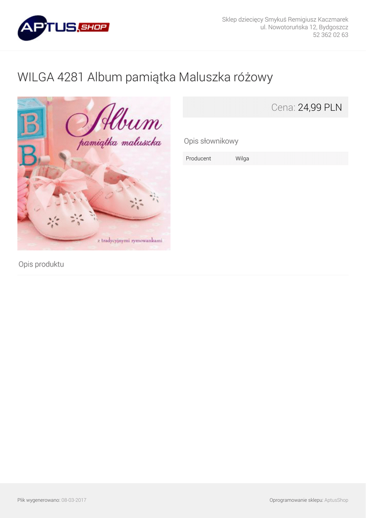 Sklep dziecięcy Smykuś Remigiusz Kaczmarek ul. Nowotoruńska 12, Bydgoszcz 52 362 02 63 WILGA 4281 Album pamiątka Maluszka różowy Cena: 24,99 PLN Opis słownikowy Producent Wilga Opis produktu Plik wygenerowano: 08-03-2017 Powered by TCPDF (www.tcpdf.org) Oprogramowanie sklepu: AptusShop