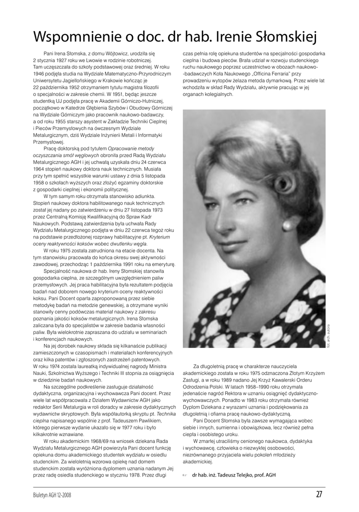 Wspomnienie o doc. dr hab. Irenie Słomskiej Biuletyn AGH 12-2008 czas pełnia rolę opiekuna studentów na specjalności gospodarka cieplna i budowa pieców. Brała udział w rozwoju studenckiego ruchu naukowego poprzez uczestnictwo w obozach naukowo-badawczych Koła Naukowego „Officina Ferraria” przy prowadzeniu wytopów żelaza metoda dymarkową. Przez wiele lat wchodziła w skład Rady Wydziału, aktywnie pracując w jej organach kolegialnych. fot. arch. autora Pani Irena Słomska, z domu Wójtowicz, urodziła się 2 stycznia 1927 roku we Lwowie w rodzinie robotniczej. Tam uczęszczała do szkoły podstawowej oraz średniej. W roku 1946 podjęła studia na Wydziale Matematyczno-Przyrodniczym Uniwersytetu Jagiellońskiego w Krakowie kończąc je 22 października 1952 otrzymaniem tytułu magistra filozofii o specjalności w zakresie chemii. W 1951, będąc jeszcze studentką UJ podjęła pracę w Akademii Górniczo-Hutniczej, początkowo w Katedrze Głębienia Szybów i Obudowy Górniczej na Wydziale Górniczym jako pracownik naukowo-badawczy, a od roku 1955 starszy asystent w Zakładzie Techniki Cieplnej i Pieców Przemysłowych na ówczesnym Wydziale Metalurgicznym, dziś Wydziale Inżynierii Metali i Informatyki Przemysłowej. Pracę doktorską pod tytułem Opracowanie metody oczyszczania smół węglowych obroniła przed Radą Wydziału Metalurgicznego AGH i jej uchwałą uzyskała dniu 24 czerwca 1964 stopień naukowy doktora nauk technicznych. Musiała przy tym spełnić wszystkie warunki ustawy z dnia 5 listopada 1958 o szkołach wyższych oraz złożyć egzaminy doktorskie z gospodarki cieplnej i ekonomii politycznej. W tym samym roku otrzymała stanowisko adiunkta. Stopień naukowy doktora habilitowanego nauk technicznych został jej nadany po zatwierdzeniu w dniu 27 listopada 1973 przez Centralną Komisję Kwalifikacyjną do Spraw Kadr Naukowych. Podstawą zatwierdzenia była uchwała Rady Wydziału Metalurgicznego podjęta w dniu 22 czerwca tegoż roku na podstawie przedłożonej rozprawy habilitacyjne pt. Kryterium oceny reaktywności koksów wobec dwutlenku węgla. W roku 1975 została zatrudniona na etacie docenta. Na tym stanowisku pracowała do końca okresu swej aktywności zawodowej, przechodząc 1 października 1991 roku na emeryturę. Specjalność naukowa dr hab. Ireny Słomskiej stanowiła gospodarka cieplna, ze szczególnym uwzględnieniem paliw przemysłowych. Jej praca habilitacyjna była rezultatem podjęcia badań nad doborem nowego kryterium oceny reaktywności koksu. Pani Docent oparła zaproponowaną przez siebie metodykę badań na metodzie genewskiej, a otrzymane wyniki stanowiły cenny podówczas materiał naukowy z zakresu poznania jakości koksów metalurgicznych. Irena Słomska zaliczana była do specjalistów w zakresie badania własności paliw. Była wielokrotnie zapraszana do udziału w seminariach i konferencjach naukowych. Na jej dorobek naukowy składa się kilkanaście publikacji zamieszczonych w czasopismach i materiałach konferencyjnych oraz kilka patentów i zgłoszonych zastrzeżeń patentowych. W roku 1974 została laureatką indywidualnej nagrody Ministra Nauki, Szkolnictwa Wyższego i Techniki III stopnia za osiągnięcia w dziedzinie badań naukowych. Na szczególne podkreślenie zasługuje działalność dydaktyczna, organizacyjna i wychowawcza Pani docent. Przez wiele lat współpracowała z Działem Wydawnictw AGH jako redaktor Serii Metalurgia w roli doradcy w zakresie dydaktycznych wydawnictw skryptowych. Była współautorką skryptu pt. Technika cieplna napisanego wspólnie z prof. Tadeuszem Pawlikiem, którego pierwsze wydanie ukazało się w 1977 roku i było kilkakrotnie wznawiane. W roku akademickim 1968/69 na wniosek dziekana Rada Wydziału Metalurgicznego AGH powierzyła Pani docent funkcję opiekuna domu akademickiego studentek wydziału w osiedlu studenckim. Za wieloletnią wzorowa opiekę nad domem studenckim została wyróżniona dyplomem uznania nadanym Jej przez radę osiedla studenckiego w styczniu 1978. Przez długi Za długoletnią pracę w charakterze nauczyciela akademickiego została w roku 1975 odznaczona Złotym Krzyżem Zasługi, a w roku 1989 nadano Jej Krzyż Kawalerski Orderu Odrodzenia Polski. W latach 1958–1990 roku otrzymała jedenaście nagród Rektora w uznaniu osiągnięć dydaktycznowychowawczych. Ponadto w 1983 roku otrzymała również Dyplom Dziekana z wyrazami uznania i podziękowania za długoletnią i ofiarna pracę naukowo-dydaktyczną. Pani Docent Słomska była zawsze wymagająca wobec siebie i innych, sumienna i obowiązkowa, lecz również pełna ciepła i osobistego uroku. W zmarłej utraciliśmy cenionego naukowca, dydaktyka i wychowawcę, człowieka o niezwykłej osobowości, niezrównanego przyjaciela wielu pokoleń młodzieży akademickiej. dr hab. inż. Tadeusz Telejko, prof. AGH 27