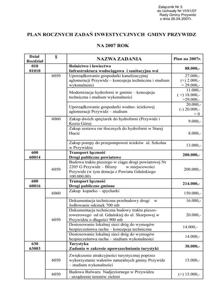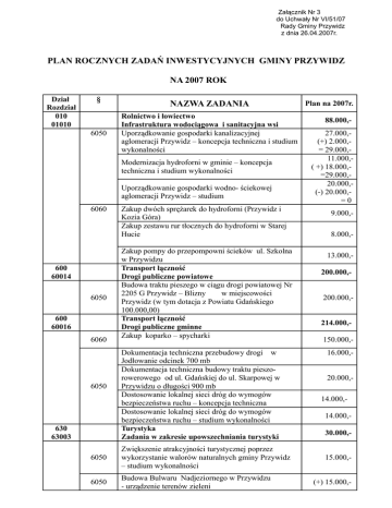 Załącznik Nr 3 do Uchwały Nr VI/51/07 Rady Gminy Przywidz z dnia 26.04.2007r. PLAN ROCZNYCH ZADAŃ INWESTYCYJNYCH GMINY PRZYWIDZ NA 2007 ROK Dział Rozdział 010 01010 § 6050 NAZWA ZADANIA Rolnictwo i łowiectwo Infrastruktura wodociągowa i sanitacyjna wsi Uporządkowanie gospodarki kanalizacyjnej aglomeracji Przywidz – koncepcja techniczna i studium wykonalności Modernizacja hydroforni w gminie – koncepcja techniczna i studium wykonalności Uporządkowanie gospodarki wodno- ściekowej aglomeracji Przywidz – studium 6060 600 60014 6050 600 60016 6060 6050 630 63003 Zakup dwóch sprężarek do hydroforni (Przywidz i Kozia Góra) Zakup zestawu rur tłocznych do hydroforni w Starej Hucie Zakup pompy do przepompowni ścieków ul. Szkolna w Przywidzu Transport łączność Drogi publiczne powiatowe Budowa traktu pieszego w ciągu drogi powiatowej Nr 2205 G Przywidz – Blizny w miejscowości Przywidz (w tym dotacja z Powiatu Gdańskiego 100.000,00) Transport łączność Drogi publiczne gminne Zakup koparko – spycharki Dokumentacja techniczna przebudowy drogi w Jodłowanie odcinek 700 mb Dokumentacja techniczna budowy traktu pieszorowerowego od ul. Gdańskiej do ul. Skarpowej w Przywidzu o długości 900 mb Dostosowanie lokalnej sieci dróg do wymogów bezpieczeństwa ruchu – koncepcja techniczna Dostosowanie lokalnej sieci dróg do wymogów bezpieczeństwa ruchu – studium wykonalności Turystyka Zadania w zakresie upowszechniania turystyki 6050 Zwiększenie atrakcyjności turystycznej poprzez wykorzystanie walorów naturalnych gminy Przywidz – studium wykonalności 6050 Budowa Bulwaru Nadjeziornego w Przywidzu - urządzenie terenów zieleni Plan na 2007r. 88.000,27.000,(+) 2.000,= 29.000,11.000,( +) 18.000,=29.000,20.000,(-) 20.000,=0 9.000,8.000,13.000,200.000,200.000,214.000,150.000,16.000,20.000,14.000,14.000,30.000,15.000,(+) 15.000,- 700 70005 Gospodarka mieszkaniowa Gospodarka gruntami i nieruchomościami 6050 750 75023 6050 754 75404 6170 754 75412 6050 801 80101 Zakup nieruchomości w Klonowie Górnym Administracja publiczna Urząd Gminy Dokumentacja techniczna rozbudowy budynku Urzędu Gminy Bezpieczeństwo publiczne i ochrona przeciwpożarowa Komendy wojewódzkie policji Dofinansowanie do zakupu samochodu dla Posterunku Policji w Przywidzu Bezpieczeństwo publiczne i ochrona przeciwpożarowa Ochotnicze straże pożarne Wykonanie centralnego ogrzewania w budynku straży pożarnej w Jodłowanie Zakup bramy garażowej wraz z montażem do budynku OSP w Przywidzu Oświata i wychowanie Szkoły podstawowe Wykończenie pomieszczeń szkoły podstawowej w Trzepowie 6050 Ocieplenie ścian zewnętrznych szkoły podstawowej w Trzepowie Termomodernizacja obiektów użyteczności publicznej w gminie Przywidz – studium 801 80110 6050 926 92605 6050 Oświata i wychowanie Gimnazjum Budowa boiska gimnazjalnego - Udział budżetu Gminy - 72.021zł - Dofinansowanie ZPORR - 371.640 zł - Dofinansowanie Budżetu Państwa - 71.896 zł Kultura fizyczna i sport Zadania w zakresie kultury fizycznej i sportu Budowa boisk sołeckich (Miłowo i Blizny) 17.500,(+) 17.500,15.000,15.000,50.000,- (+) 50.000,30.000,- 20.000,(+) 10.000,203.000,153.000,(-) 153.000,=0 50.000,(-) 50.000,= 0 15.000,( -) 15.000,=0 515.557,515.557,- 20.000,20.000,- Razem wydatki majątkowe, w tym: - Zakupy inwestycyjne - Wydatki inwestycyjne - Dofinansowanie Sporządziła M. Piotrowiak - 180.000,- 950.057,50.000,- 1.180.057,-