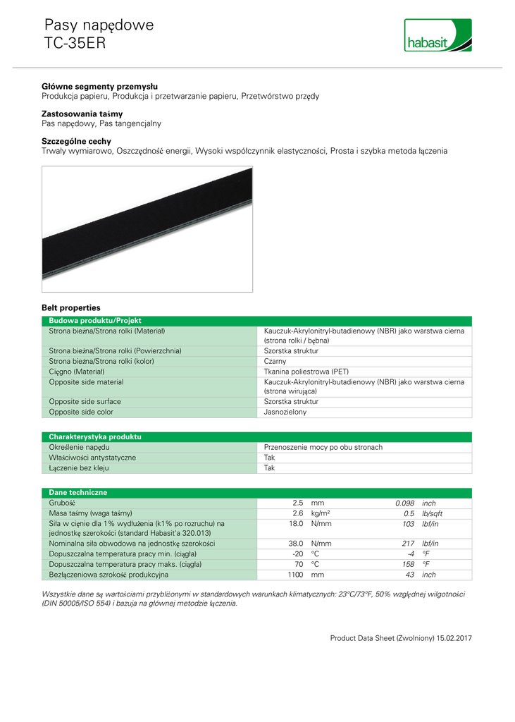 Pasy napędowe TC-35ER Główne segmenty przemysłu Produkcja papieru, Produkcja i przetwarzanie papieru, Przetwórstwo przędy Zastosowania taśmy Pas napędowy, Pas tangencjalny Szczególne cechy Trwały wymiarowo, Oszczędność energii, Wysoki współczynnik elastyczności, Prosta i szybka metoda łączenia Belt properties Budowa produktu/Projekt Strona bieżna/Strona rolki (Materiał) Opposite side surface Opposite side color Kauczuk-Akrylonitryl-butadienowy (NBR) jako warstwa cierna (strona rolki / bębna) Szorstka struktur Czarny Tkanina poliestrowa (PET) Kauczuk-Akrylonitryl-butadienowy (NBR) jako warstwa cierna (strona wirująca) Szorstka struktur Jasnozielony Charakterystyka produktu Określenie napędu Właściwości antystatyczne Łączenie bez kleju Przenoszenie mocy po obu stronach Tak Tak Strona bieżna/Strona rolki (Powierzchnia) Strona bieżna/Strona rolki (kolor) Cięgno (Materiał) Opposite side material Dane techniczne Grubość Masa taśmy (waga taśmy) Siła w cięnie dla 1% wydłużenia (k1% po rozruchu) na jednostkę szerokości (standard Habasit'a 320.013) Nominalna siła obwodowa na jednostkę szerokości Dopuszczalna temperatura pracy min. (ciągła) Dopuszczalna temperatura pracy maks. (ciągła) Bezłączeniowa szrokość produkcyjna 2.5 2.6 18.0 mm kg/m² N/mm 0.098 0.5 103 38.0 -20 70 1100 N/mm °C °C mm 217 -4 158 43 inch lb/sqft lbf/in lbf/in °F °F inch Wszystkie dane są wartościami przybliżonymi w standardowych warunkach klimatycznych: 23°C/73°F, 50% względnej wilgotności (DIN 50005/ISO 554) i bazuja na głównej metodzie łączenia. Product Data Sheet (Zwolniony) 15.02.2017 Pasy napędowe TC-35ER Joining related properties Link to JDS: http://pdchmp04.habasit.com/HNET/fabrpl.nsf/vwGetJDS?OpenView&productCode=TC-35ER Metoda łączenia Units Średnica rolki (minimalna) mm inch mm inch Minimalna średnica rolki z przeciwzgięciem Flexproof 10 x 120 50 1.97 50 1.97 Odporność chemiczna Link do informacji o Odporności Chemicznej: http://www.habasit.com/en/chemical-resistance.htm Tryb użytkowania/transportowania Przenoszenie mocy Obliczenie Dla pasów napędowych zaleca się przeprowadzenie przynajmniej kalkulacji szerokości pasa i naprężenia początkowego. Do tego służy prgram do przeprowadzania kalkulacji Habasit SeleCalc. Najprościej jeżeli kalkulację napedów taki przeprowadzi przedstawiciel Habasit'a. Rekomendacja Proszę postępować zgodnie z instrukcjami montażu i utrzymania, które są dostarczane z każdym produktem. W celu uzyskania szczegółowych informacji patrz "wymagania dot. magazynowania i obsługi pasów i taśm", bądź skontaktuj się z Habasit'em, Chronić taśmy i pasy przed światłem słonecznym/promieniami UV/kurzem i brudem. Taśmy i pasy zapasowe przechowywać w chłodym i suchym miejscu i w miarę możliwości w ich oryginalnym opakowaniu. Nałożyć taśmę na koła pasowe bez użycia siły, Nie zginać i nie składać taśmy, Uniemożliwić powstanie kontaktu pomiędzy końcami taśmy, a urządzeniem / maszyną, Ten produkt nie został przetestowany zgodnie ze standardem ATEX (atmosfera z zagrożeniem wybuchu - przepisy prawne ATEX 95 lub dyrektywa UE 94/9) i w związku z tym musi zostać sprawdzony przez użytkownika w środowisku pracy. Grupa produktu Podgrupa produktu Numer elementu Numer taryfy celnej Poliestrowe pasy napędowe TC Polyester Power Transmission Belts H010100942 40103900 Disclaimer Product Application Disclaimer (valid for ALL Habasit products and mentioned on all PDS) This disclaimer is made by and on behalf of Habasit and its affiliated companies, directors, employees, agents and contractors (hereinafter collectively "HABASIT") with respect to the products referred to herein (the "Products"). SAFETY WARNINGS SHOULD BE READ CAREFULLY AND ANY RECOMMENDED SAFETY PRECAUTIONS BE FOLLOWED STRICTLY! Please refer to the Safety Warnings herein, in the Habasit catalogue as well as installation and operating manuals. All indications / information as to the application, use and performance of the Products are recommendations provided with due diligence and care, but no representations or warranties of any kind are made as to their completeness, accuracy or suitability for a particular purpose. The data provided herein are based on laboratory application with small-scale test equipment, running at standard conditions, and do not necessarily match product performance in industrial use. New knowledge and experience may lead to re-assessments and modifications within a short period of time and without prior notice. EXCEPT AS EXPLICITLY WARRANTED BY HABASIT, WHICH WARRANTIES ARE EXCLUSIVE AND IN LIEU OF ALL OTHER WARRANTIES, EXPRESS OR IMPLIED, THE PRODUCTS ARE PROVIDED "AS IS". HABASIT DISCLAIMS ALL OTHER WARRANTIES, EITHER EXPRESS OR IMPLIED, INCLUDING, BUT NOT LIMITED TO, IMPLIED WARRANTIES OF MERCHANTABILITY, FITNESS FOR A PARTICULAR PURPOSE, NON-INFRINGEMENT, OR ARISING FROM A COURSE OF DEALING, USAGE, OR TRADE PRACTICE, ALL OF WHICH ARE HEREBY EXCLUDED TO THE EXTENT ALLOWED BY APPLICABLE LAW. BECAUSE CONDITIONS OF USE IN INDUSTRIAL APPLICATION ARE OUTSIDE OF HABASIT'S CONTROL, HABASIT DOES NOT ASSUME ANY LIABILITY CONCERNING THE SUITABILITY AND PROCESS ABILITY OF THE PRODUCTS, INCLUDING INDICATIONS ON PROCESS RESULTS AND OUTPUT. Product Data Sheet (Zwolniony) 15.02.2017