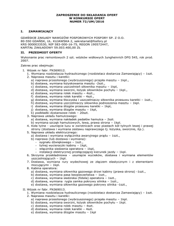 ZAPROSZENIE DO SKŁADANIA OFERT W KONKURSIE OFERT NUMER 72/UM/2016 I. ZAMAWIAJĄCY GDAŃSKIE ZAKŁADY NAWOZÓW FOSFOROWYCH FOSFORY SP. Z O.O. 80-550 GDAŃSK, UL. KUJAWSKA 2, [email protected] KRS 0000033530, NIP 583-000-16-75, REGON 190572447, KAPITAŁ ZAKŁADOWY 59.003.400,00 ZŁ II. PRZEDMIOT OFERTY Wykonanie prac remontowych 2 szt. wózków widłowych Jungheinrich DFG 545, rok prod. 2007. Zakres prac obejmuje: I. Wózek nr fabr. FN369012. 1. Wymiana rozdzielacza hydraulicznego (rozdzielacz dostarcza Zamawiający) – 1szt. 2. Naprawa masztu i karetki: a) naprawa przesilonego (wybrzuszonego) przęsła masztu – 1kpl., b) dostawa, wymiana łożyskowania masztu -2szt., c) dostawa, wymiana uszczelnień siłownika masztu – 1kpl, d) dostawa, wymiana sworzni, łożysk siłowników pochyłu – 1kpl., e) dostawa, wymiana rolek masztu – 4szt., f) dostawa, wymiana rolek karetki – 4szt., g) dostawa, wymiana tłoczyska i uszczelniaczy siłownika przesuwu karetki – 1szt., h) dostawa, wymiana uszczelniaczy siłownika podnoszenia masztu – 1kpl. i) dostawa, wymiana ślizgów przesuwu karetki – 1kpl, j) dostawa, wymiana ślizgów masztu – 1kpl, k) podkładki dystansowe rolek – 20szt. 3. Naprawa układu hamulcowego: a) dostawa, wymiana nakładek pedałów hamulca – 2szt. b) wymiana szczęk hamulcowych, lewa, prawa strona – 1kpl. 4. Koła tylne - usunięcie luzu w zwrotnicach oraz piastach kół tylnych lewej i prawej strony (dostawa i wymiana zestawu naprawczego tj. łożyska, sworznie, itp.). 5. Naprawa układu elektrycznego: a) dostawa i wymiana wyłącznika awaryjnego prądu – 1szt., b) naprawa (lub dostawa i wymiana): sygnału dźwiękowego – 1szt., tylnej wycieraczki kabiny – 1kpl, włącznika siedzenia operatora – 1kpl, instalacji elektrycznej przełączającej kierunek jazdy – 1kpl. 6. Skrzynia przekładniowa - usunięcie wycieków, dostawa i wymiana elementów uszczelniających – 1kpl. 7. Dostawa, wymiana rury wydechowej ze złączem elastycznym i z elementami mocującymi – 1kpl. 8. Kabina operatora: a) dostawa, wymiana siłownika gazowego drzwi kabiny (prawa strona) -1szt., b) dostawa, wymiana pasa bezpieczeństwa – 1szt., c) dostawa, wymiana siedziska (fotela) operatora – 1szt., d) dostawa, wymiana rygla zamka pokrywy silnika – 1szt., e) dostawa, wymiana siłownika gazowego pokrywy silnika -1szt., II. Wózek nr fabr. FN369013. 1. Wymiana rozdzielacza hydraulicznego (rozdzielacz dostarcza Zamawiający) – 1szt. 2. Naprawa masztu i karetki: a) naprawa przesilonego (wybrzuszonego) przęsła masztu – 1kpl. b) dostawa, wymiana sworzni, łożysk siłowników pochyłu – 1kpl. c) dostawa, wymiana rolek masztu – 4szt. d) dostawa, wymiana rolek karetki – 4szt. e) dostawa, wymiana ślizgów masztu – 1kpl f) dostawa, wymiana ślizgów przesuwu karetki – 1kpl. g) dostawa, wymiana tłoczyska i uszczelniaczy siłownika przesuwu karetki – 1szt. 3. Skrzynia przekładniowa - usunięcie wycieków, dostawa, wymiana elementów uszczelniających – 1kpl. 4. Naprawa układu elektrycznego: a) dostawa, wymiana wyłącznika awaryjnego prądu – 1szt. b) naprawa (lub dostawa i wymiana): sygnału dźwiękowego wstecznego biegu – 1szt. tylnej wycieraczki kabiny – 1kpl włącznika siedzenia operatora – 1kpl c) naprawa zaśniedziałych przewodów elektrycznych – 1kpl. 5. Kabina operatora: a) dostawa, wymiana siłownika gazowego drzwi kabiny –2szt. b) dostawa, wymiana rygla zamka pokrywy silnika – 1szt. c) naprawa (lub dostawa i wymiana) dźwigni regulacji kierownicy – 1kpl. III. Przygotowanie do odbioru i udział w odbiorze UDT po remoncie. Uwagi: Prace remontowe mogą zostać wykonane na terenie Zamawiającego; w przypadku remontu na terenie Wykonawcy – wszelkie koszty związane z transportem po stronie Wykonawcy. Wykonawca zapewnia oryginalne lub autoryzowane części zamienne, materiały oraz sprzęt niezbędny do wykonania prac. Oferenci muszą posiadać niezbędną wiedzę i doświadczenie oraz pozwolenie na dokonywanie napraw urządzeń poddozorowych. Przed złożeniem oferty konieczne jest dokonanie oględzin wózków przez Oferenta. III. INFORMACJE DOTYCZĄCE TERMINU I MIEJSCA SKŁADANIA OFERT IV. Oferty należy składać w zamkniętej kopercie w Kancelarii GZNF „FOSFORY” Sp. z o.o.,80-550 Gdańsk ul. Kujawska 2, budynek biurowca II piętro z dopiskiem na kopercie „Remont wózków widłowych. Konkurs ofert nr 72/UM/2016”. Osobą uprawnioną do kontaktów z oferentami jest Pan Paweł Sawicki tel. /58/ 34 38 239 lub 669 600 401. Termin składania ofert upływa w dniu 14.11.2016 r. Za datę terminowego złożenia oferty uważa się datę zarejestrowania oferty w Kancelarii GZNF „FOSFORY” Sp. z o.o. Oferty, które wpłyną po tym terminie nie będą rozpatrywane. KRYTERIA OCENY SPEŁNIENIA DOSTAWCÓW/WYKONAWCÓW L.p. 1. 2. 3. 4. V. VI. WARUNKÓW Kryteria Cena Czas realizacji Referencje Wiarygodność w ocenie członków Komisji WYMAGANYCH OD Znaczenie 70% 10% 10% 10% OFERTA POWINNA ZAWIERAĆ Szczegółowy zakres robót. Termin wykonania robót. Cenę ofertową za wykonanie kompletnego zakresu robót. Warunki płatności. Warunki gwarancyjne. Informację o kwalifikacjach posiadanej kadry technicznej. Referencje lub informacje o wykonanych pracach podobnego typu. WYMAGANE ZAŁĄCZNIKI Kserokopia dokumentu rejestrowego oferenta. Kserokopia numeru NIP, REGON. Dokumenty pozwalające ocenić wiarygodność techniczną i ekonomiczną oferenta (np. kadra techniczna, sprzęt itp.) Oświadczenie o sytuacji finansowej zapewniającej wykonanie zamówienia. Oświadczenie o braku wszczęcia w stosunku do oferenta postępowania upadłościowego lub układowego. Oświadczenie o nie zaleganiu z uiszczaniem podatków, opłat lub składek na ubezpieczenia społeczne. VII. UWAGI KOŃCOWE Wszystkie dokumenty ofertowe muszą być podpisane przez osoby uprawnione do reprezentowania firmy. W przypadku zawarcia umowy deklarowane parametry rozliczeń nie będ