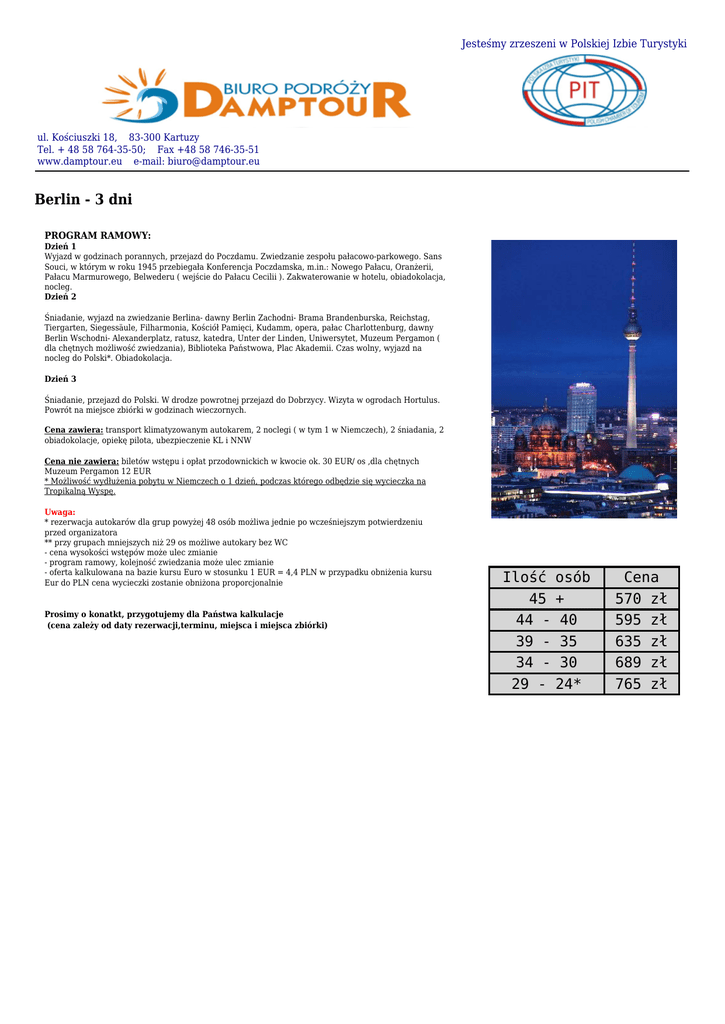 Jesteśmy zrzeszeni w Polskiej Izbie Turystyki ul. Kościuszki 18, 83-300 Kartuzy Tel. + 48 58 764-35-50; Fax +48 58 746-35-51 www.damptour.eu e-mail: [email protected] Berlin - 3 dni PROGRAM RAMOWY: Dzień 1 Wyjazd w godzinach porannych, przejazd do Poczdamu. Zwiedzanie zespołu pałacowo-parkowego. Sans Souci, w którym w roku 1945 przebiegała Konferencja Poczdamska, m.in.: Nowego Pałacu, Oranżerii, Pałacu Marmurowego, Belwederu ( wejście do Pałacu Cecilii ). Zakwaterowanie w hotelu, obiadokolacja, nocleg. Dzień 2 Śniadanie, wyjazd na zwiedzanie Berlina- dawny Berlin Zachodni- Brama Brandenburska, Reichstag, Tiergarten, Siegessäule, Filharmonia, Kościół Pamięci, Kudamm, opera, pałac Charlottenburg, dawny Berlin Wschodni- Alexanderplatz, ratusz, katedra, Unter der Linden, Uniwersytet, Muzeum Pergamon ( dla chętnych możliwość zwiedzania), Biblioteka Państwowa, Plac Akademii. Czas wolny, wyjazd na nocleg do Polski*. Obiadokolacja. Dzień 3 Śniadanie, przejazd do Polski. W drodze powrotnej przejazd do Dobrzycy. Wizyta w ogrodach Hortulus. Powrót na miejsce zbiórki w godzinach wieczornych. Cena zawiera: transport klimatyzowanym autokarem, 2 noclegi ( w tym 1 w Niemczech), 2 śniadania, 2 obiadokolacje, opiekę pilota, ubezpieczenie KL i NNW Cena nie zawiera: biletów wstępu i opłat przodownickich w kwocie ok. 30 EUR/ os ,dla chętnych Muzeum Pergamon 12 EUR * Możliwość wydłużenia pobytu w Niemczech o 1 dzień, podczas którego odbędzie się wycieczka na Tropikalną Wyspę. Uwaga: * rezerwacja autokarów dla grup powyżej 48 osób możliwa jednie po wcześniejszym potwierdzeniu przed organizatora ** przy grupach mniejszych niż 29 os możliwe autokary bez WC - cena wysokości wstępów może ulec zmianie - program ramowy, kolejność zwiedzania może ulec zmianie - oferta kalkulowana na bazie kursu Euro w stosunku 1 EUR = 4,4 PLN w przypadku obniżenia kursu Eur do PLN cena wycieczki zostanie obniżona proporcjonalnie Prosimy o konatkt, przygotujemy dla Państwa kalkulacje (cena zależy od daty rezerwacji,terminu, miejsca i miejsca zbiórki) Ilość 45 44 39 34 29 - osób + 40 35 30 24* Cena 570 zł 595 zł 635 zł 689 zł 765 zł