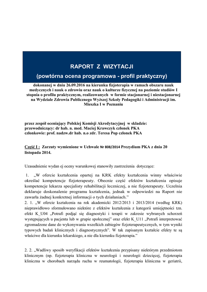 RAPORT Z WIZYTACJI (powtórna ocena programowa - profil praktyczny) dokonanej w dniu 26.09.2016 na kierunku fizjoterapia w ramach obszaru nauk medycznych i nauk o zdrowiu oraz nauk o kulturze fizycznej na poziomie studiów I stopnia o profilu praktycznym, realizowanych w formie stacjonarnej i niestacjonarnej na Wydziale Zdrowia Publicznego Wyższej Szkoły Pedagogiki i Administracji im. Mieszka I w Poznaniu przez zespół oceniający Polskiej Komisji Akredytacyjnej w składzie: przewodniczący: dr hab. n. med. Maciej Krawczyk członek PKA członkowie: prof. nadzw.dr hab. n.o zdr. Teresa Pop członek PKA Część I : Zarzuty wymienione w Uchwale Nr 808/2014 Prezydium PKA z dnia 20 listopada 2014. Uzasadnienie wydan ej oceny warunkowej stanowiły zastrzeżenia dotyczące: 1. „W ofercie kształcenia opartej na KRK efekty kształcenia winny właściwie określać kompetencje fizjoterapeuty. Obecnie część efektów kształcenia opisuje kompetencje lekarza specjalisty rehabilitacji leczniczej, a nie fizjoterapeuty. Uczelnia deklaruje doskonalenie programu kształcenia, jednak w odpowiedzi na Raport nie zawarła żadnej konkretnej informacji o tych działaniach.” 2. 1. „W ofercie kształcenia na rok akademicki 2012/2013 i 2013/2014 (według KRK) nieprawidłowo sformułowano niektóre z efektów kształcenia z kategorii umiejętności tzn. efekt K_U04 „Potrafi podjąć się diagnostyki i terapii w zakresie wybranych schorzeń występujących u pacjenta lub w grupie społecznej” oraz efekt K_U11 „Potrafi interpretować zgromadzone dane do wykonywania wszelkich zabiegów fizjoterapeutycznych, w tym wyniki typowych badań klinicznych i diagnostycznych”. W tak zapisanym kształcie efekty te są właściwe dla kierunku lekarskiego, a nie dla kierunku fizjoterapia.” 2. 2. „Wadliwy sposób weryfikacji efektów kształcenia przypisany niektórym przedmiotom klinicznym (np. fizjoterapia kliniczna w neurologii i neurologii dziecięcej, fizjoterapia kliniczna w chorobach narządu ruchu w reumatologii, fizjoterapia kliniczna w geriatrii, fizjoterapia kliniczna w onkologii) nie pozwala ocenić stopnia osiągnięcia tych efektów, co w rezultacie może spowodować, że absolwent nie będzie posiadał wszystkich kompetencji właściwych fizjoterapeucie, zwłaszcza odnosząc się do umiejętności praktycznych.” 2. 3. „Uczelnia nie stosuje zasady prawidłowej numeracji efektów kierunkowych i przedmiotowych, co wprowadza nieporządek informacyjny.” 3. Sposób zawierania umów i prowadzenia dokumentacji związanej z praktykami zawodowymi nie pozwala na ocenę, jaka grupa studentów kierunku „fizjoterapia” faktycznie realizuję praktyki zawodowe w wymaganej liczbie godzin we właściwie dobranej bazie dydaktycznej. W przedstawionych umowach dotyczących kształcenia praktycznego brak jest informacji, dla jakiego kierunku studiów są zawarte oraz jaką liczbę osób placówka może przyjąć na praktyki.” 4. „Obsada niektórych przedmiotów nie gwarantuje realizacji założonych efektów kształcenia. Dotyczy to w szczególności: „Podstaw diagnostyki obrazowej”, „Fizjoterapii klinicznej w chorobach narządów wewnętrznych”, „Fizjoterapii klinicznej w psychiatrii”, „Fizjoterapii klinicznej w pediatrii”.” 5. „Informacje zawarte w porozumieniach z jednostkami ochrony zdrowia na realizację praktyk zawodowych nie stwarzają możliwości oceny, czy infrastruktura tych jednostek jest właściwa do realizacji założonych dla tej formy kształcenia efektów kształcenia.” 6. „Jednostka nie monitoruje losów absolwentów, nie w pełni zabezpiecza warunki do nabywania i doskonalenia niezbędnych umiejętności praktycznych, a także studenckiej działalności naukowej. Nie aktywizuje studentów do krajowej i międzynarodowej mobilności.” 7. „Jednostka nie wypracowała przejrzystej struktury zarządzania kierunkiem studiów oraz nie dokonuje systematycznej, kompleksowej oceny efektów kształcenia. Brak wyników oceny nie pozwala na rewizję programu studiów oraz metod jego realizacji zorientowanej na doskonalenie jakości jego końcowych efektów.” Część II : Ocena efektów działań naprawczych odnoszących się do poszczególnych zastrzeżeń i zarzutów wymienionych w części I – należy przedstawić podjęte przez jednostkę działania naprawcze oraz ocenić ich skuteczność Ad 1. Uczelnia przedstawiła nowe, poprawione efekty kształcenia w których odniesiono się do zarzutów PKA. Obecne efekty kształcenia nie budzą poprzednich wątpliwości. Zarzut zostaje uchylony. Ad. 2. 1. Zarzut zostaje uchylony z powodów wymienionych w punkcie nr 1. Ad. 2. 2. Uczelnia przedstawiła nowe sylabusy przedmiotów. ZW PKA zapoznał się z sylabusami przedmiotów, które w czasie poprzedniej wizytacji były poddane krytycznej ocenie. „Fizjoterapia kliniczna w chorobach narządów wewnętrznych w geriatrii”. Należy stwierdzić, że weryfikacja efektów kształcenia jest prawidłowa. Przyjęto następujące metody weryfikacji dla umiejętności: plan pracy, arkusz diagnostyczny, dyskusja, obserwacja, zaliczenie praktyczne. Z zakresu wiedzy: plan pracy, dyskusja. Z zakresu kompetencji społecznych: dyskusja. „Fizjoterapia kliniczna w neurologii i neurologii dziecięcej”. Przyjęto następujące sposoby weryfikacji: egzamin. Wiedza: egzamin kolokwium. Umiejętności: zaliczenie praktyczne na sobie i zaliczenie na pacjencie, prezentacja artykułu na ćwiczeniach. Z zakresu kompetencji społecznych: przedstawienie artykułu na ćwiczeniach, kolokwium. „Fizjoterapia kliniczna w chorobach narządów wewnętrznych w onkologii”. Metody weryfikacji efektów kształcenia w zakresie wykładów i ćwiczeń - zaliczenie na ocenę. Wiedza: obserwacja, zaliczenie, Umiejętności: zaliczenie praktyczne na pacjencie. aktywność, obserwacja. Z zakresu kompetencji społecznych: dyskusja, obserwacja. „Fizjoterapia kliniczna w chorobach narządu ruchu w reumatolo