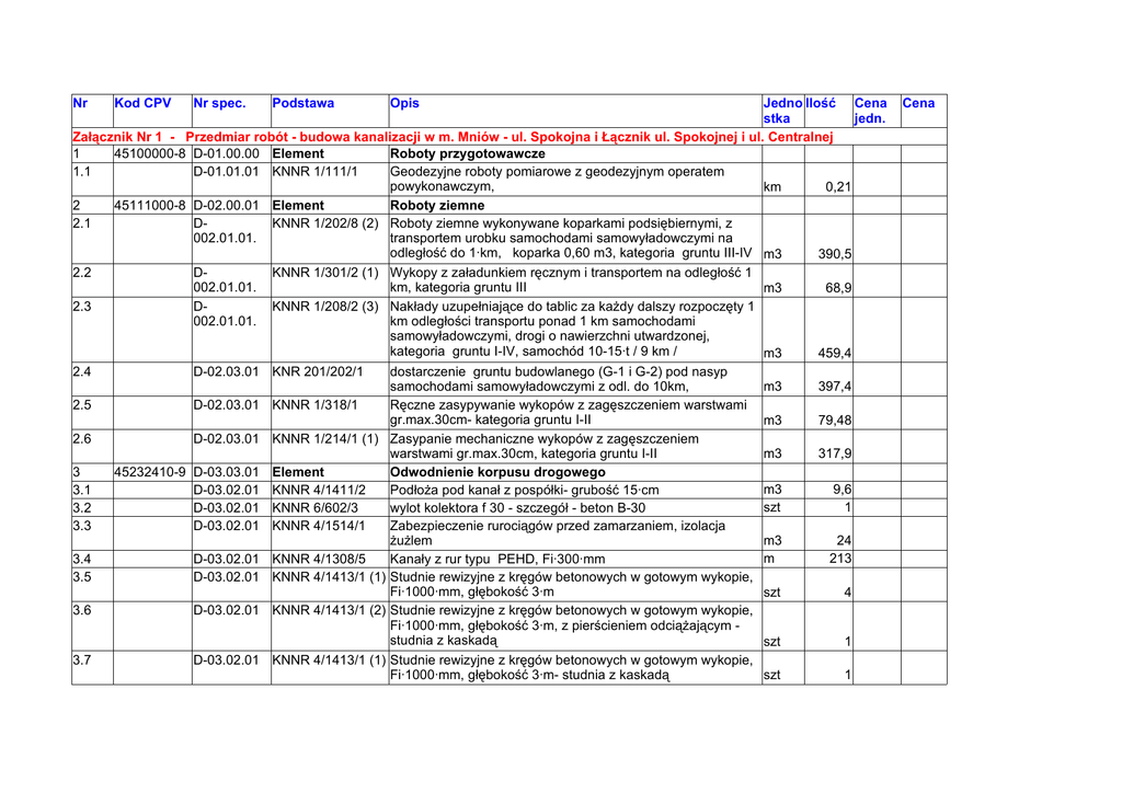 Nr Kod CPV Nr spec. Podstawa Opis Jedno Ilość Cena stka jedn. Załącznik Nr 1 - Przedmiar robót - budowa kanalizacji w m. Mniów - ul. Spokojna i Łącznik ul. Spokojnej i ul. Centralnej 1 45100000-8 D-01.00.00 Element Roboty przygotowawcze 1.1 D-01.01.01 KNNR 1/111/1 Geodezyjne roboty pomiarowe z geodezyjnym operatem powykonawczym, km 0,21 2 45111000-8 D-02.00.01 Element Roboty ziemne 2.1 DKNNR 1/202/8 (2) Roboty ziemne wykonywane koparkami podsiębiernymi, z 002.01.01. transportem urobku samochodami samowyładowczymi na odległość do 1·km, koparka 0,60 m3, kategoria gruntu III-IV m3 390,5 2.2 DKNNR 1/301/2 (1) Wykopy z załadunkiem ręcznym i transportem na odległość 1 002.01.01. km, kategoria gruntu III m3 68,9 2.3 DKNNR 1/208/2 (3) Nakłady uzupełniające do tablic za każdy dalszy rozpoczęty 1 002.01.01. km odległości transportu ponad 1 km samochodami samowyładowczymi, drogi o nawierzchni utwardzonej, kategoria gruntu I-IV, samochód 10-15·t / 9 km / m3 459,4 2.4 D-02.03.01 KNR 201/202/1 dostarczenie gruntu budowlanego (G-1 i G-2) pod nasyp samochodami samowyładowczymi z odl. do 10km, m3 397,4 2.5 D-02.03.01 KNNR 1/318/1 Ręczne zasypywanie wykopów z zagęszczeniem warstwami gr.max.30cm- kategoria gruntu I-II m3 79,48 2.6 D-02.03.01 KNNR 1/214/1 (1) Zasypanie mechaniczne wykopów z zagęszczeniem warstwami gr.max.30cm, kategoria gruntu I-II m3 317,9 3 45232410-9 D-03.03.01 Element Odwodnienie korpusu drogowego m3 9,6 3.1 D-03.02.01 KNNR 4/1411/2 Podłoża pod kanał z pospółki- grubość 15·cm szt 1 3.2 D-03.02.01 KNNR 6/602/3 wylot kolektora f 30 - szczegół - beton B-30 3.3 D-03.02.01 KNNR 4/1514/1 Zabezpieczenie rurociągów przed zamarzaniem, izolacja żużlem m3 24 m 213 3.4 D-03.02.01 KNNR 4/1308/5 Kanały z rur typu PEHD, Fi·300·mm 3.5 D-03.02.01 KNNR 4/1413/1 (1) Studnie rewizyjne z kręgów betonowych w gotowym wykopie, Fi·1000·mm, głębokość 3·m szt 4 3.6 D-03.02.01 KNNR 4/1413/1 (2) Studnie rewizyjne z kręgów betonowych w gotowym wykopie, Fi·1000·mm, głębokość 3·m, z pierścieniem odciążającym studnia z kaskadą szt 1 3.7 D-03.02.01 KNNR 4/1413/1 (1) Studnie rewizyjne z kręgów betonowych w gotowym wykopie, Fi·1000·mm, głębokość 3·m- studnia z kaskadą szt 1 Cena 3.8 D-03.02.01 KNNR 4/1413/1 (2) Studnie rewizyjne z kręgów betonowych w gotowym wykopie, Fi·1000·mm, głębokość 3·m, z pierścieniem odciążającym szt VAT Wartość netto Wartość brutto 1