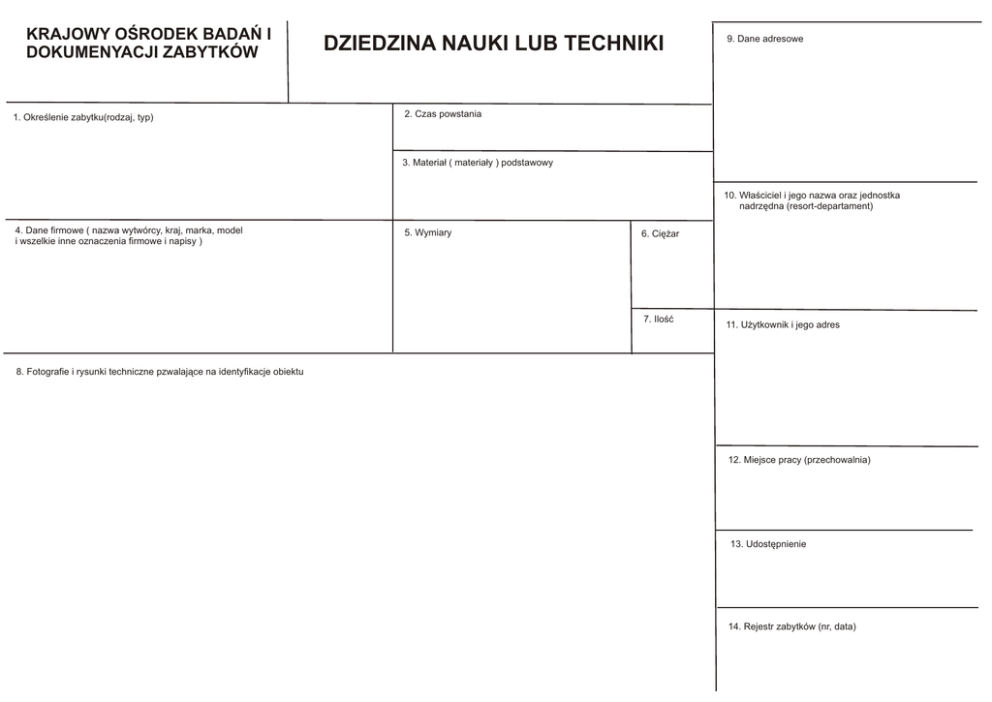 KRAJOWY OŒRODEK BADAÑ I DOKUMENYACJI ZABYTKÓW 1. Okreœlenie zabytku(rodzaj, typ) DZIEDZINA NAUKI LUB TECHNIKI 9. Dane adresowe 2. Czas powstania 3. Materia³ ( materia³y ) podstawowy 10. W³aœciciel i jego nazwa oraz jednostka nadrzêdna (resort-departament) 4. Dane firmowe ( nazwa wytwórcy, kraj, marka, model i wszelkie inne oznaczenia firmowe i napisy ) 5. Wymiary 6. Ciê¿ar 7. Iloœæ 11. U¿ytkownik i jego adres 8. Fotografie i rysunki techniczne pzwalaj¹ce na identyfikacje obiektu 12. Miejsce pracy (przechowalnia) 13. Udostêpnienie 14. Rejestr zabytków (nr, data) 21. Akta archiwalne (rodzaj akt, numer, miejsce przechowywania) 24. Uwagi ró¿ne 25. Opracowa³ tekst plany, rysunki zdiêcia 22. Bibliografie miejsce przechowywania negatywów: kopia karty Karta po wype³nieniu podlega ochronie na podstawie przepisów prawa autorskiego 26. Adnotacje o inspekcjach, informacje o zmianach (daty, imiona i nazwiska wype³niaj¹cych) 23. ród³a ikonograficzne i fotografie (rodzaj, miejsce przechowywania, sygnatury) 27. Za³¹czniki 15. Historia obiektu 19. Opis i charakterystyka techniczna (parametry i cechy techniczne, konstrukcja i budowa, rodzaj napêdu i sterowania, materia³ i technika wykonania, elementy sk³adowe decyduj¹ce o charakterze i funkcji) 16. Przeznaczenie pierwotne 17. U¿ytkowanie obecne i przewidywane w przysz³oœci 18. Remonty, zmiany konstrukcyjne, modernizacje 20. Stan zachowania i potrzeby konserwatorskie WK£ADKA DO KARTY EWIDENCYJNEJ ZABYTKÓW RUCHOMYCH TECHNIKI 1. Miejscowoœæ 2. Obiekt (nazwa jak w karcie) 3. Zawartoœæ wk³adki (nazwa obiektu lub materia³ uzupe³niaj¹cy) ZA£¥CZNIK NR 1