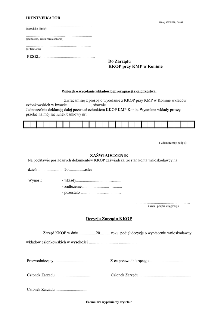 IDENTYFIKATOR:……………….……….… ………………………... (miejscowość, data) ………………………………………………………….. (nazwisko i imię) …………………………………..……………………… (jednostka, adres zamieszkania) …………………………………………….…………… (nr telefonu) PESEL:……………………………………………….. Do Zarządu KKOP przy KMP w Koninie Wniosek o wycofanie wkładów bez rezygnacji z członkostwa. Zwracam się z prośbą o wycofanie z KKOP przy KMP w Koninie wkładów członkowskich w kwocie ………..................., słownie …………………………………………………………………………… Jednocześnie deklaruję dalej pozostać członkiem KKOP KMP Konin. Wycofane wkłady proszę przelać na mój rachunek bankowy nr: …………………………. ( własnoręczny podpis) ZAŚWIADCZENIE Na podstawie posiadanych dokumentów KKOP zaświadcza, że stan konta wnioskodawcy na dzień………………..………20..………..…..roku Wynosi: - wkłady………………………………..………. - zadłużenie………………………..….……… - pozostało ……………………..……………. ……………………………………………….. ( data i podpis księgowej) Decyzja Zarządu KKOP Zarząd KKOP w dniu………………20…..…… roku podjął decyzję o wypłaceniu wnioskodawcy wkładów członkowskich w wysokości ………………………… ………………. Przewodniczący…………………………………. Z-ca przewodniczącego ………………………….………… Członek Zarządu………………………………. Członek Zarządu ………………………..…………………… Członek Zarządu ……………………………. Formularz wypełniamy czytelnie
