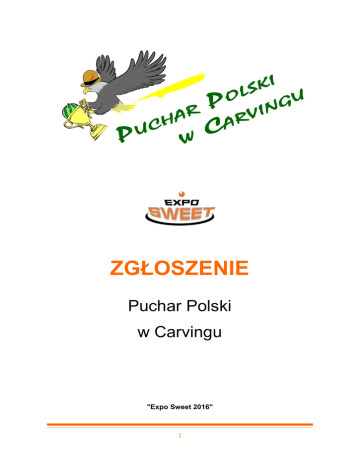 ZGŁOSZENIE Puchar Polski w Carvingu "Expo Sweet 2016" 1 Zgłoszenie: Puchar Polski w Carvingu EXPO SWEET 2015 PROSIMY WYPEŁNIAĆ DRUKOWANYMI LITERAMI. KAŻDA LITERA W OSOBNEJ KRATCE DANE UCZESTNIKA imię: nazwisko: Nazwa drużyny: Kapitan drużyny: Adres: Kod-pocztowy - Miejscowość Ulica i nr domu Adres e-mail Nr telefonu Poniżej proszę wpisać wymiary zawodnika w celu przygotowania ubrań roboczych: Opis Dane zawodnika Wzrost Obwód klatki piersiowej Obwód pasa Zwykle noszony rozmiar ubrania (nr) Podpisy i oświadczenie Podpisując zgłoszenie akceptuję postanowienia Regulaminu Pucharu Polski w Carvingu „Expo Sweet 2016” miejscowość ....................................., data;…………………………… Formularz należy przesłać na adres; [email protected] Termin nadsyłania zgłoszeń do dnia 1luty 2016 r. 2