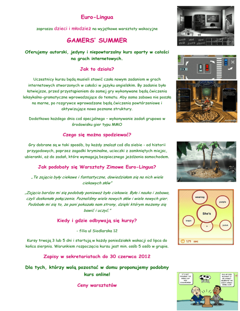Euro-Lingua zaprasza dzieci i młodzież na wyjątkowe warsztaty wakacyjne GAMERS’ SUMMER Oferujemy autorski, jedyny i niepowtarzalny kurs oparty w całości na grach internetowych. Jak to działa? Uczestnicy kursu będą musieli stawić czoła nowym zadaniom w grach internetowych stworzonych w całości w języku angielskim. By zadanie było łatwiejsze, przed przystąpieniem do samej gry wykonywane będą ćwiczenia leksykalno-gramatyczne wprowadzające do tematu. Aby sama zabawa nie poszła na marne, po rozgrywce wprowadzane będą ćwiczenia powtórzeniowe i aktywizujące nowo poznane struktury. Dodatkowo każdego dnia coś specjalnego – wykonywanie zadań grupowo w środowisku gier typu MMO Czego się można spodziewać? Gry dobrane są w taki sposób, by każdy znalazł coś dla siebie - od historii przygodowych, poprzez zagadki kryminalne, ucieczki z zamkniętych miejsc, ubieranki, aż do zadań, które wymagają bezpiecznego jeżdżenia samochodem. Jak podobały się Warsztaty Zimowe Euro-Lingua? „Te zajęcia były ciekawe i fantastyczne, dowiedziałam się na nich wiele ciekawych słów” „Zajęcia bardzo mi się podobały ponieważ było ciekawie. Była i nauka i zabawa, czyli doskonałe połączenie. Poznaliśmy wiele nowych słów i wiele nowych gier. Podobało mi się to, że pani pokazała nam strony, dzięki którym możemy się bawić i uczyć.” Kiedy i gdzie odbywają się kursy? - filia ul Siodlarska 12 Kursy trwają 3 lub 5 dni i startują w każdy poniedziałek wakacji od lipca do końca sierpnia. Warunkiem rozpoczęcia kursu jest min. osób 5 osób w grupie. Zapisy w sekretariatach do 30 czerwca 2012 Dla tych, którzy wolą pozostać w domu proponujemy podobny kurs online! Ceny warsztatów