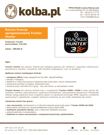 Roczna licencja oprogramowania Tracker Hunter Producent: Tracker Kod produktu: 234-002 Cena: 249,00 zł Opis: Tracker Hunter dla systemu Android jest najlepszą aplikacją dla myśliwych, organizacji ratowniczych, poszukiwaczy skarbów i wszystkich osób aktywnie spędzających czas na powietrzu. Aplikacja zawiera następujące funkcje: ● ● ● ● ● nawigacja offline (mapy topograficzne lub OSM - OpenStreetMap) kompas z nawigacją śledzenie w czasie rzeczywistym nieograniczonej liczby psów i innych użytkowników zaznaczanie punktów na mapach, planowanie trasy tworzenie grup i odcinków linii z grupy - cały czas online i w rzeczywistym czasie. Tracker Hunter dla systemu Android wraz z urządzeniami Tracker G400i i G500 to nowy wymiar dla myśliwych, leśników, psów policyjnych, organizacji humanitarnych i poszukiwawczo-ratowniczych. Przestarzałe metody zostają wypierane przez urządzenia oparte na najnowszej technologii GPRS! Zapomnij o problemie ograniczonych częstotliwości urządzeń radiowychi przekonaj się sam dzięki radiolokacji bez granic. Lokalizacja (psów) bez granic: ● ● ● ● ● czas rzeczywisty: lokalizowanie co 3 sekundy nieograniczonej liczby psów z Tracker G400i lub G500 jednocześnie automatyczne wysyłanie/odbieranie pozycji dzięki GPRS możliwość wywołania obroży, wraz z odsłuchem dźwięków otoczenia wskaźnik głośności na wyświetlaczu śledzenie w czasie rzeczywistym z nieograniczonej liczby użytkowników ● ● ● ● ● ● pełna baza lokalizacji wyświetlanie za pomocą mapy lub kompasu możliwość ściągnięcia map z bazy OSM możliwość ściągnięcia map BKG (skala 1:50 000) (Finlandia i USA) dane dotyczące map są zaprogramowane i działają również bez sieci komórkowej śledzenie w czasie rzeczywistym i odtwarzanie również on-line z komputerem stacjonarnym możliwość ustawienia hasła dla każdego użytkownika Nawigacja i łatwy pomiar: ● ● ● ● ● możliwość oznaczenia punktów na drodze oraz nazwania ich, „miejsce spotkania”, „namiot”, „auto” oraz wiele więcej za pomocą symboli oraz jednoczesnego dzielenia się tym ze znajomymi mały kompas wskazuje kierunek, w widoku mapy. Kliknięcie w duży kompas pokazuje ostatnio wyświetlane punkty zaplanuj swoją trasę i znaleźć miejsca, na podstawie współrzędnych zmierz odległość od dowolnego punktu możliwość narysowania zaplanowanej trasy (np. za pomocą linii) Funkcje grupowe: ● ● ● ● ● proste utworzenie grup wraz z innymi użytkownikami, psami, innymi celami zwiększone bezpieczeństwo podczas polowania lub akcji poszukiwawczych dzielenie się trasą, punktami na drodze i mapie, trasą psa; z grupa w rzeczywistym czasief unkcja czatu wewnątrz grupy zarządzanie grupą Pamiętnik myśliwego (usługa dostępna wkrótce!): ● ● ● zaznacz w swoim pamiętniku miejsce np. zabicia jelenia dokładne informacje: pozycję, czas, komentarze; możliwość podzielenia się ze znajomymi tymi informacjami licznik dzików: zapisuj ich liczbę i obserwacje i wykorzystuj je do planowania polowań itd. Działania ratownicze w nowym wymiarze – nieograniczony zakres, zawsze w kontakcie: ● ● ● ● ● utwórz grupę z opcją śledzenia internetowego w komputerze lub w aplikacji Android oznacz granice obszaru na podstawie dokładnych współrzędnych i podziel się nimi z grupą dodaj poszczególnych członków grupy poszukiwawczej i psów do stałego kontaktu stały pogląd, czy teren został dobrze przeszukany, zgodnie z zasadą „każdy każdego widzi” zgranie całości na telefon, tablet lub PC, intuicyjny interfejs krok po kroku Powtórzenia i statystyki: ● ● ● łatwe odtwarzanie pojedynczych fragmentów z dowolnej aplikacji w telefonie, tablecie lub komputerze PC dostępne statystyki dot. długości drogi, średniej prędkości i więcej dodawanie punktów zatrzymania podobnie jak punkty na drodze, odległość itd. Wymagania techniczne dla urządzeń z systemem Android: ● ● ● ● ● Android 2.1 lub nowszy system operacyjny kompas (zalecany) kart pamięci GSM 900/1800, 3G i LTE (Wi-Fi) aplikacja działa w telefonach komórkowych oraz tabletach z systemem Android