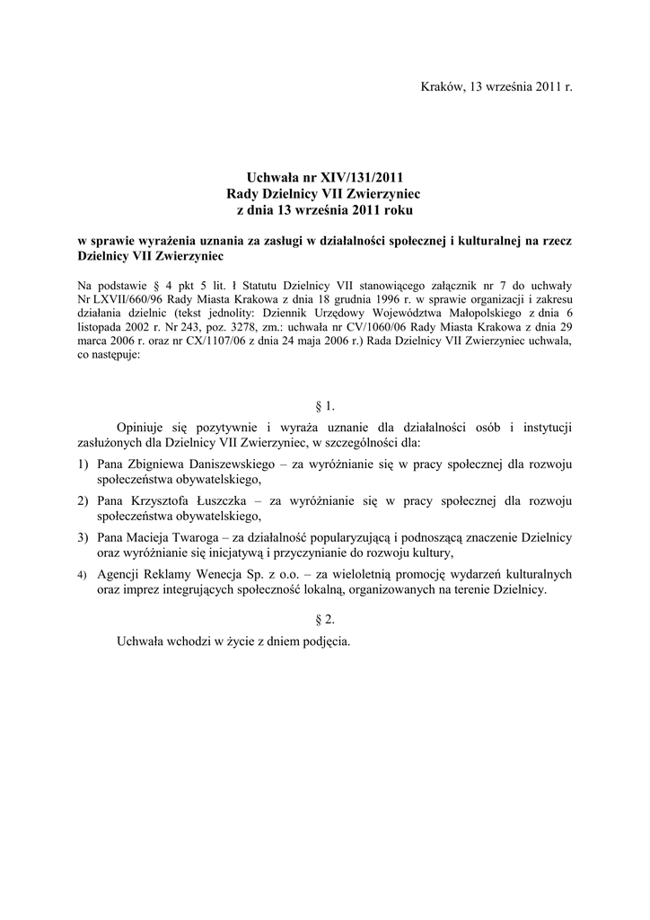 Kraków, 13 września 2011 r. Uchwała nr XIV/131/2011 Rady Dzielnicy VII Zwierzyniec z dnia 13 września 2011 roku w sprawie wyrażenia uznania za zasługi w działalności społecznej i kulturalnej na rzecz Dzielnicy VII Zwierzyniec Na podstawie § 4 pkt 5 lit. ł Statutu Dzielnicy VII stanowiącego załącznik nr 7 do uchwały Nr LXVII/660/96 Rady Miasta Krakowa z dnia 18 grudnia 1996 r. w sprawie organizacji i zakresu działania dzielnic (tekst jednolity: Dziennik Urzędowy Województwa Małopolskiego z dnia 6 listopada 2002 r. Nr 243, poz. 3278, zm.: uchwała nr CV/1060/06 Rady Miasta Krakowa z dnia 29 marca 2006 r. oraz nr CX/1107/06 z dnia 24 maja 2006 r.) Rada Dzielnicy VII Zwierzyniec uchwala, co następuje: § 1. Opiniuje się pozytywnie i wyraża uznanie dla działalności osób i instytucji zasłużonych dla Dzielnicy VII Zwierzyniec, w szczególności dla: 1) Pana Zbigniewa Daniszewskiego – za wyróżnianie się w pracy społecznej dla rozwoju społeczeństwa obywatelskiego, 2) Pana Krzysztofa Łuszczka – za wyróżnianie się w pracy społecznej dla rozwoju społeczeństwa obywatelskiego, 3) Pana Macieja Twaroga – za działalność popularyzującą i podnoszącą znaczenie Dzielnicy oraz wyróżnianie się inicjatywą i przyczynianie do rozwoju kultury, 4) Agencji Reklamy Wenecja Sp. z o.o. – za wieloletnią promocję wydarzeń kulturalnych oraz imprez integrujących społeczność lokalną, organizowanych na terenie Dzielnicy. § 2. Uchwała wchodzi w życie z dniem podjęcia. Uzasadnienie: Zbigniew Daniszewski − urodzony 20.01.1929 w Krakowie, − matura 1949 – II Liceum w Krakowie, − ojciec kpt. WP, uczestnik kampanii wrześniowej, więzień obozu w Starobielsku, zamordowany przez NKWD w Charkowie, − 1949-55 studia w AHG, dyplom mgr inż. Ceramiki, − 1955-89 praca zawodowa w przemyśle i Biurze Projektów przemysłu Cementowego w Krakowie, w tym wieloletnie kontrakty w Libii, Iraku i Nigerii, − 1989-92 ekspert ONZ, praca w krajach Afryki Wschodniej (Zambia, Tanzania, Uganda i Botswana), − 1992-2010 radny Dzielnicy VII, w latach 1994-2006 zastępca przewodniczącego Rady Dzielnicy Krzysztof Łuszczek Pan Krzysztof Łuszczek pracuje w Miejskim Przedsiębiorstwie Wodociągów i Kanalizacji. Od ponad 30-tu lat kieruje Zakładem Uzdatniania Wody „Rudawa”. W Radzie Dzielnicy VII Zwierzyniec działał od 1994 roku. Przez 3 kadencje był członkiem zarządu, a w 4-tej kadencji Rady przewodniczącym komisji infrastruktury i lokalnych inicjatyw inwestycyjnych. Przez 16 lat w Radzie zajmował się sprawami związanymi z infrastrukturą komunalną, a jako członek innych komisji także szeregiem innych spraw bieżących. W latach 1977-1981 jako wiceprzewodniczący Komitetu Osiedlowego Przegorzały zajmował się poszerzeniem i asfaltowaniem ul. Przegorzalskiej, Olchowej, Gajówki i oświetleniem ulic w Przegorzałach. W 1979 roku reaktywował przedwojenny klub sportowy „Przegorzalanka” i był jego prezesem. Doprowadził do odwodnienia i urządzenia boiska. W latach 1990- 1992 był prezesem Społecznego Komitetu Telefonizacji i zajmował się budową sieci telefonicznej w Przegorzałach. Od roku 1993 do chwili obecnej jest wiceprezesem Społecznego Komitetu Budowy Kanalizacji Sanitarnej, zajmującego się skanalizowaniem około 400 obiektów usytuowanych na południowych stokach Sikornika i Lasu Wolskiego od Salwatora po Bielany. Od 2000 roku działa w stowarzyszeniu Ruch Inicjatyw Osiedlowych, zajmującym się wspieraniem inicjatyw mieszkańców krakowskich osiedli peryferyjnych w sprawach budowy kanalizacji, wodociągu, dróg. Jest członkiem zarządu. Jest współzałożycielem powstałego w roku 2005 Stowarzyszenia Przyjaciół Przegorzał i był wiceprezesem pierwszej kadencji. Jest pomysłodawcą i organizatorem cyklicznych imprez plenerowych pod hasłem „30 tysięcy lat Przegorzał”. Angażował się z ogromną determinacją w rozbudowę Klubu Kultury Przegorzały, powstanie tzw. obwodnicy Przegorzał, skanalizowanie obiektów KS Zwierzyniecki i Juvenia, budowę placów zabaw w osiedlach dzielnicy. W trakcie długoletniej pracy otrzymał wiele odznaczeń i nagród, miedzy innymi: - brązową i srebrną odznakę „Za pracę społeczną dla M. Krakowa” - srebrny i złoty „Krzyż zasługi” - w roku 2010 od Prezydenta Miasta otrzymał odznakę „Honoris gratia” Maciej Twaróg Urodzony w 1976 r., historyk, pochodzi z Nowej Huty, od 2009 r. pracuje w Muzeum Historycznym Miasta Krakowa. Prowadzi Dom Zwierzyniecki – nowy projekt i nowy oddział MHK z ul. Królowej Jadwigi 41. W ostatnim okresie był kuratorem trzech dobrze przyjętych wystaw Funio z „Przekroju”. Rysunek i collage Stefana Berdaka 1968-2009, Oblicza Zwierzyńca 1910-2010, oraz Gablenzowie. Wokół octu, musztardy i opery. W liceum jego nauczycielem historii był „chłopok ze Zwierzyńca” – Piotr Boroń, dzięki temu poznawał historię i uroki Zwierzyńca. W Nowej Hucie znany z działań zmierzających do pobudzenia kulturalnego i sportowego najmłodszej części Krakowa. Inicjował przeróżne nowohuckie inicjatywy tożsamościowe, od zawsze wiernie kibicuje Hutnikowi, a od pewnego czasu życzliwym okiem zerka także na wyniki Zwierzynieckiego KS. Od stycznia 2011 roku autor „Blogu drukowaneko” w Kurierze Zwierzynieckim. 14 października br. otwarta zostanie kolejna wystawa przygotowana przez Maćka: Klub z Wielkiej Łąki. 90. lat Zwierzynieckiego Klubu Sportowego, na którą jej kurator serdecznie zaprasza. Mieszka w najstarszej części Nowej Huty, ma dwójkę dzieci: 9.letnią Joannę i rocznego Franciszka. Agencja Reklamy Wenecja sp. z o.o. Od lat 90. marka Wenecja znana jest z realizacji projektów promocyjnych, reklamowych oraz wydarzeń rozrywkowych. W ramach Agencji Wenecja działają trzy niezależne, lecz współpracujące ze sobą działy: Wenecja Plakatowanie, Wenecja Reklama, Wenecja Public Relations. Agencja Wenecja znana jest ze wspierania inst