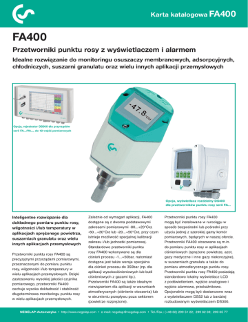 Karta katalogowa FA400 FA400 Przetworniki punktu rosy z wyświetlaczem i alarmem Idealne rozwiązanie do monitoringu osuszaczy membranowych, adsorpcyjnych, chłodniczych, suszarni granulatu oraz wielu innych aplikacji przemysłowych Opcja, rejestrator DS500 dla przyrządów serii FA.../VA..., do 12 wejść pomiarowych Opcja, wyświetlacz rozdzielny DS400 dla przetworników punktu rosy serii FA... Inteligentne rozwiązanie dla dokładnego pomiaru punktu rosy, wilgotności i/lub temperatury w aplikacjach sprężonego powietrza, suszarniach granulatu oraz wielu innych aplikacjach przemysłowych Przetworniki punktu rosy FA400 są precyzyjnymi przyrządami pomiarowymi, przeznaczonymi do pomiaru punktu rosy, wilgotności i/lub temperatury w wielu aplikacjach przemysłowych. Dzięki zastosowaniu wysokiej jakości czujnika pomiarowego, przetworniki FA400 cechuje wysoka dokładność i stabilność długoterminowa monitoringu punktu rosy w wielu aplikacjach przemysłowych. Zależnie od wymagań aplikacji, FA400 dostępne są z dwoma podstawowymi zakresami pomiarowymi -80...+20°Ctd, -60...+30°Ctd lub -20...+50°Ctd, przy czym istnieje możliwość specjalnej kalibracji zakresu i/lub jednostki pomiarowej. Standardowo przetworniki punktu rosy FA400 wykonywane są dla ciśnień procesu -1...+50bar, natomiast dostępna jest także wersja specjalna dla ciśnień procesu do 350bar (np. dla aplikacji wysokociśnieniowych lub butli ciśnieniowych z gazami itp.). Przetworniki FA400 są także idealnym rozwiązaniem dla aplikacji w warunkach atmosferycznych (ciśnienie otoczenia) lub w strumieniu przepływu poza sektorem (powietrze rozprężone). Przetworniki punktu rosy FA400 mogą być instalowane w rurociągu w sposób bezpośredni lub pośredni przy użyciu jednej z szerokiej gamy komór pomiarowych, będących w naszej ofercie. Przetworniki FA400 stosowane są m.in. do pomiaru punktu rosy w aplikacjach ciśnieniowych (sprężone powietrze, azot, gazy medyczne i inne gazy niekorozyjne), w suszarniach granulatu a także do pomiaru atmosferycznego punktu rosy. Przetworniki punktu rosy FA400 posiadają standardowo lokalny wyświetlacz LCD z podświetleniem, wyjście analogowe i wyjście alarmowe, przekaźnikowe. Opcjonalnie mogą być dostarczone wraz z wyświetlaczem DS52 lub z bardziej rozbudowanym wyświetlaczem DS300. NEGELAP-Automatyka • http://www.negelap.com • e-mail: [email protected] • Tel./Fax.: (+48 32) 299 51 22; 299 62 69; 290 65 77 Karta katalogowa FA400 Korzyści w pomiarach punktu rosy Wyjście alarmowe, przekaźnikowe, styk NO (styk otwiera przy aktywacji alarmu lub gdy przerwa w zasilaniu) Wyjście prądowe 4…20mA, skalowanie dla punktu rosy lub wilgotności względnej Przyciski do konfiguracji alarmu i wyboru wyświetlanego parametru Certyfikat kalibracji w dostawie z przyrządem Wyświetlacz LCD z podświetleniem wskazujący max. 3 wartości: • punkt rosy (oCtd, …) • wilgotność (%RH) • temperatura (oC, oF) Stopień ochrony obudowy IP65 Prosty montaż i demontaż przy użyciu standardowej komory pomiarowej z szybkozłączem Filtr spiekany 50µm ze stali nierdzewnej Czujnik nieczuły na kondensację Przyłącze procesowe G1/2", szeroka gama komór pomiarowych Wersja standardowa do 50bar lub wersja specjalna do 350bar Cechy przetworników FA400: Przykładowe aplikacje: • Prosty montaż w istniejącej instalacji, montaż bezpośredni lub pośredni • Pomiar punktu rosy w aplikacjach ciśnieniowych m.in. w instalacjach sprężonego powietrza • Krótki czas odpowiedzi przy użyciu jednej z komór pomiarowych • Jednostki pomiarowe ustawialne z PC m.in. oCtd, oFtd, g/m3, mg/m3, g/kg, ppm V/V, oCtd atm, oFtd atm, %RH itp. • Lokalny wyświetlacz LCD z podświetleniem + przyciski konfiguracyjne, wyjście alarmowe (przekaźnik NO, max. 60VDC/0,5A) • Wyjście analogowe 4...20mA skalowane z PC m.in. zakres pomiarowy, jednostka pomiaru, mierzony parametr (punkt rosy lub wilgotność wzgl.) • Wysoka dokładność pomiaru ±2oC i stabilność długoterminowa • Pomiar atmosferycznego punktu rosy • Pomiar punktu rosy lub wilgotności w suszarniach granulatu, produktów spożywczych, produktów przemysł. itp. • Aplikacje pomiaru punktu rosy gazów niekorozyjnych np. azotu itp. • Możliwość montażu i demontażu podczas procesu (przy zastosowaniu standardowej komory pomiarowej z szybkozłączem) • Monitoring i ciągła kontrola osuszaczy membranowych, adsorpcyjnych lub chłodniczych • Szeroki wybór komór pomiarowych m.in. dla aplikacji ciśnieniowych, dla suszarni granulatu, dla atmosferycznego punktu rosy itp. • Kontrola i monitoring parametrów gazów w instalacjach medycznych lub butlach • Standardowa wersja dla ciśnień procesu do 50bar, opcjonalnie do 350bar • Monitoring instalacji chłodniczych NEGELAP-Automatyka • http://www.negelap.com • e-mail: [email protected] • Tel./Fax.: (+48 32) 299 51 22; 299 62 69; 290 65 77 Karta katalogowa FA400 Wyświetlacze rozdzielne dla przetworników punktu rosy Specyfikacja / porównanie wyświetlaczy Model wyświetlacza DS52 DS300 1 wejście cyfrowe SDI 2 wejścia cyfrowe SDI FA400, FA410, FA415, VA400, VA420, VA420F FA400, FA410, FA415, VA400, VA420, FA420F LED, czerwony, 5-cyfr LCD, graficzny z podświetleniem, 160 x 100 pikseli Wyświetlanie dla FA... punkt rosy punkt rosy, wilgotność, temperatura Wyświetlanie dla VA... przepływ bieżący przepływ bieżący, sumator, prędkość 4 przyciski 4 przyciski lub USB Wyjścia alarmowe 2 wyjścia przekaźnikowe, styki przełączalne, obciążalność wyjść 250VAC/3A 2 wyjścia przekaźnikowe, styki przełączalne, obciążalność wyjść 250VAC/3A Wyjścia analogowe 4...20mA 2 x 4...20mA Wyjścia impulsowe --- 2 x impulsowe, pasywne 24VDC/max. 100mA 2 x 24VDC/max. 100mA uniwersalny, naścienny lub tablicowy uniwersalny, naścienny lub tablicowy 118 x 133 x 93mm (montaż naścienny) 92 x 92mm (montaż tablicowy) 118 x 133 x 93mm (montaż naścienny) 92