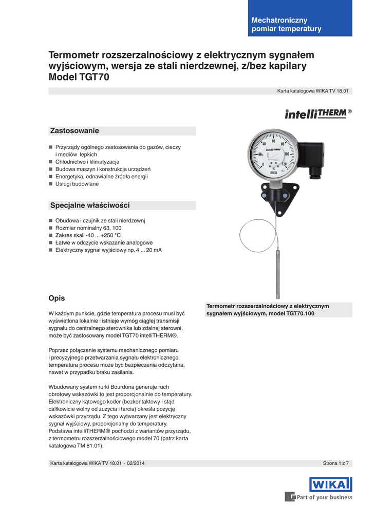 Mechatroniczny pomiar temperatury Termometr rozszerzalnościowy z elektrycznym sygnałem wyjściowym, wersja ze stali nierdzewnej, z/bez kapilary Model TGT70 Karta katalogowa WIKA TV 18.01 Zastosowanie ■■ Przyrządy ogólnego zastosowania do gazów, cieczy i mediów lepkich ■■ Chłodnictwo i klimatyzacja ■■ Budowa maszyn i konstrukcja urządzeń ■■ Energetyka, odnawialne źródła energii ■■ Usługi budowlane Specjalne właściwości ■■ Obudowa i czujnik ze stali nierdzewnj ■■ Rozmiar nominalny 63, 100 ■■ Zakres skali -40 ... +250 °C ■■ Łatwe w odczycie wskazanie analogowe ■■ Elektryczny sygnał wyjściowy np. 4 ... 20 mA Opis W każdym punkcie, gdzie temperatura procesu musi być wyświetlona lokalnie i istnieje wymóg ciągłej transmisji sygnału do centralnego sterownika lub zdalnej sterowni, może być zastosowany model TGT70 intelliTHERM®. Termometr rozszerzalnościowy z elektrycznym sygnałem wyjściowym, model TGT70.100 Poprzez połączenie systemu mechanicznego pomiaru i precyzyjnego przetwarzania sygnału elektronicznego, temperatura procesu może byc bezpieczenia odczytana, nawet w przypadku braku zasilania. Wbudowany system rurki Bourdona generuje ruch obrotowy wskazówki to jest proporcjonalnie do temperatury. Elektroniczny kątowego koder (bezkontaktowy i stąd calłkowicie wolny od zużycia i tarcia) określa pozycję wskazówki przyrządu. Z tego wytwarzany jest elektryczny sygnał wyjściowy, proporcjonalny do temperatury. Podstawa intelliTHERM® pochodzi z wariantów przyrządu, z termometru rozszerzalnościowego model 70 (patrz karta katalogowa TM 81.01). Karta katalogowa WIKA TV 18.01 ∙ 02/2014 Strona 1 z 7 Wersja standardowa Zasada pomiarowa System rurki Bourdona Limity temperatury dla przechowywania i transportu -20 ... +60 °C wg EN 13190 Rozmiar nominalny w mm 63, 100 Dopuszczalna temperatura otoczenia dla obudowy 0 ... +40 °C max. (inne na zapytanie) Ciecz wypełniająca Xylol lub olej silikonowy Dopuszczalne ciśnienie znamionowe dla czujnika max. 25 bar, statyczne Modele Wersja NS Pozycja przyłącza Opcje montażu Przyłącze dolne (LM) (radialne) Przyrząd z kapilarą i tylnym powierchniowym kołnierzem montażowym Przyrząd z kapilarą i powierzchniowym wspornikiem montażowym Przyrząd z kapilarą, pierścieniem trójkątnym i obejmą montażową Połączenie bezpośrednie bez kapilary H 63 100 M 63 100 Przyłącze dolne (LM) (radialne) B 63 Przyłącze tylne (axialne) R 100 Przyłącze dolne (LM) (radialne) Dokładność wskazań Klasa 2, EN 13190 Kapilara Długość zgodnie ze specyfikacją klienta (max. 10 m) Ø 2 mm, stal nierdzewna 1.4571, bending radius nie mniej niż 6 mm Wyjście kapilary Montaż dolny Montaż kapilary Montaż powinien być wolny od drgań Obudowa i bayonet ring Stal nierdzewna Przyłącze Gładkie, stal nierdzewna 1.4571 Czujnik Ø 8 mm, stal nierdzewna 1.4571 Aktywna długość czujnika W zależności od Ød i zakresu skali Stopień ochrony IP 65 wg EN/IEC 60529 Elektronika Sygnał wyjściowy ■■ Wyjście napięciowe Z Us = DC 5 V, ratiometryczny: 0.5 … 4.5 V Z Us = DC 12 … 32 V, nieratiometryczny (tylko NS 100): 0.5 … 4.5 V ■■ Wyjście prądowe 4 … 20 mA, 2-przewodowy ■■ Dokładność elektrycznego sygnału wyjściowego Mechaniczny ±1 % zakresu pomiarowego Zasilanie (Us) DC 5 V / DC 12 … 32 V Zgodność elektromagnetyczna wg standardów kontroli EN 61000-4-6 / EN 61000-4-3 Sygnał wyjściowy i dopuszczalne obciążenie ■■ Wyjście napięciowe (3-przewodowe) RA > 5 kΩ ■■ Wyjście prądowe (2-przewodowe) 4 ... 20 mA RA ≤ (USIG - 10 V) / 0.02 A z RA in Ω i USIG in DC V 4 ... 20 mA, 2-wire Permissible range Podzielnia Plastikowe naklejki, białe z logo Aluminium, białe, czarne napisy Wskazówka Aluminium, czarne USIG Szyba Szkło laminowane bezpieczne Strona 2 z 7 Karta katalogowa WIKA TV 18.01 ∙ 02/2014 Opcje Przyłącze elektryczne NS 100, skrzynka zacisków z boku ■■ Inne konstrukcje przyłączy ■■ Inne zakresy pomiarowe 14031082.01 ■■ Osłona termometryczna wg DIN lub specyfikacji klienta ■■ Kołnierz montażowy przedni panelowy (wersja V), stal nierdzewna, tylko z tylnym wyjściem kablowym lub przyłączem M12 ■■ Przyłącze elektryczne poprzez dławik kablowy, wejście kablowe lub przyłącze M12 ■■ Inne sygnały wyjściowe 0.5 … 2.5 V (ratiometryczne lub nieratiometryczne) 0.5 … 3.5 V (ratiometryczne lub nieratiometryczne) Skrzynka zacisków Sygnał wyjściowy 2-przewodowy (wyjście prądowe) 3-przewodowy (wyjście napięciowe) Kolor UB+ UB- Sygnał 1 2 - 1 2 3 czerwony czarny pomarańczowy Zakresy pomiarowe i skali 1) Zakres skali Zakres pomiarowy Limit w °C w °C błędu ±°C -40 ... +60 -30 ... +50 -20 ... +60 -20 ... +80 0 ... 60 0 ... 80 0 ... 100 0 ... 120 0 ... 160 0 ... 200 0 ... 250 -30 ... +50 -20 ... +40 -10 ... +50 -10 ... +70 10 ... 50 10 ... 70 10 ... 90 10 ... 110 20 ... 140 20 ... 180 30 ... 220 2 2 2 2 2 2 2 4 4 4 5 Podziałka w °C 1 1 1 1 1 1 1 2 2 2 5 Inne zakresy skali na zapytanie 1) Zakres pomiarowy jest zaznaczony na podzielni poprzez dwa trójkątne znaki. Tylko w ramach tego zakresu wyspecyfikowany limit błędu jest obowiązujący zgodnie z EN 13190. Konstrukcje przyłączy 3073300.04-U Złącze 1, czujnik gładki (bez gwintu) Długość czujnika I = 140, 200, 240, 290 mm (Podstawa dla złącza 4, złącze zaciskowe) Legenda: Ød Średnica czujnika Przyłącze procesowe Wymiary w mm G G½B SW 27 3073300.04-V Złącze 2, nakrętka Przyłacze procesowe: G ½ B Długość czujnika I1 = 80, 140, 180, 230 mm i 20 Legenda: G Gwint zewnętrzny i Długość gwintu Karta katalogowa WIKA TV 18.01 ∙ 02/2014 SW Ød Wymiar pod klucz Średnica czujnika Strona 3 z 7 G G½ G¾ M24 x 1.5 SW 27 32 32 i 8.5 10.5 13.5 Legenda: G1 Gwint zewnętrzny i Długość gwintu Złącze 4, złącze zaciskowe (przesuwne na czujniku) Przyłącze procesowe: G ½ B, G ¾ B, M18 x 1.5, ½ NPT, ¾ NPT Długość czujnika I1