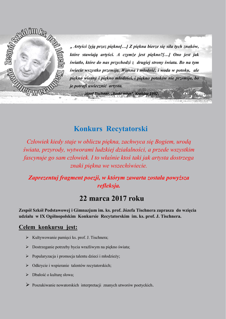 „ Artyści żyją przez piękno[…] Z piękna bierze się siła tych znaków, które stawiają artyści. A czymże jest piękno?[…] Ono jest jak światło, które do nas przychodzi z drugiej strony świata. Bo na tym świecie wszystko przemija. Wiosna i młodość, i woda w potoku, ale piękno wiosny i piękno młodości, i piękno potoków nie przemija, bo je potrafi uwiecznić artysta. Józef Tischner, „Boski młyn”, Kraków 1992. Konkurs Recytatorski Człowiek kiedy staje w obliczu piękna, zachwyca się Bogiem, urodą świata, przyrody, wytworami ludzkiej działalności, a przede wszystkim fascynuje go sam człowiek. I to właśnie ktoś taki jak artysta dostrzega znaki piękna we wszechświecie. Zaprezentuj fragment poezji, w którym zawarta została powyższa refleksja. 22 marca 2017 roku Zespół Szkół Podstawowej i Gimnazjum im. ks. prof. Józefa Tischnera zaprasza do wzięcia udziału w IX Ogólnopolskim Konkursie Recytatorskim im. ks. prof. J. Tischnera. Celem konkursu jest: Kultywowanie pamięci ks. prof. J. Tischnera; Dostrzeganie potrzeby bycia wrażliwym na piękno świata; Popularyzacja i promocja talentu dzieci i młodzieży; Odkrycie i wspieranie talentów recytatorskich; Dbałość o kulturę słowa; Poszukiwanie nowatorskich interpretacji znanych utworów poetyckich. A oto szczegóły regulaminu: Warunkiem uczestnictwa jest zgłoszenie w terminie do 17 marca 2017 r. udziału w konkursie oraz przygotowanie repertuaru odpowiadającego wybranej kategorii konkursowej. Można zgłosić maksymalnie 2 uczestników w każdej kategorii wiekowej i kategorii prezentacji utworów. kategorie prezentacji utworów: 1. gwarowa ; 2. literacka. uczestnicy występować będą w 3 grupach wiekowych: 0 – III Szkoła Podstawowa, IV – VI Szkoła Podstawowa, I – III Gimnazjum. Każdy uczestnik przygotowuje do recytacji jeden wiersz (czas prezentacji nie powinien przekraczać 5 minut). W pracach komisji konkursowej wezmą udział specjaliści współpracujący z organizatorami. Jury oceniać będzie: dobór repertuaru do tematu konkursu oraz do wieku uczestnika, interpretację utworu, kulturę słowa ( dykcja i emisja głosu) ogólny wyraz artystyczny. Miejsca od I do III i dwa wyróżnienia w każdej kategorii i każdej grupie wiekowej nagrodzone będą dyplomami i nagrodami rzeczowymi. Uczestnicy ponoszą koszty dojazdu. Gwarantowany gorący posiłek . Organizator zastrzega sobie prawo do przetwarzania danych osobowych. Termin konkursu: 22 marca 2017 r. godz. 10.00