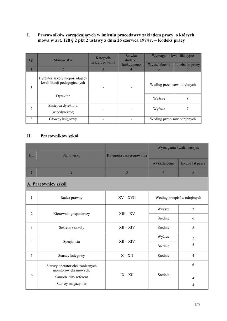 I. Pracowników zarządzających w imieniu pracodawcy zakładem pracy, o których mowa w art. 128 § 2 pkt 2 ustawy z dnia 26 czerwca 1974 r. – Kodeks pracy Lp. Stanowisko Kategoria zaszeregowania 1 2 3 Stawka dodatku funkcyjnego 4 - - Dyrektor szkoły nieposiadąjący kwalifikacji pedagogicznych 1 Dyrektor 2 3 II. Zastępca dyrektora (wicedyrektor) Główny księgowy - - - - Wymagania kwalifikacyjne Wykształcenie 5 Liczba lat pracy 6 Według przepisów odrębnych WyŜsze 8 WyŜsze 7 Według przepisów odrębnych Pracowników szkół Wymagania kwalifikacyjne Lp. Stanowisko 1 Kategoria zaszeregowania 2 3 1 Radca prawny XV – XVII 2 Kierownik gospodarczy XIII – XV Wykształcenie Liczba lat pracy 4 5 A. Pracownicy szkół 3 Sekretarz szkoły XII – XIV 4 Specjalista XII – XIV 5 Starszy księgowy X – XII Według przepisów odrębnych WyŜsze 2 Średnie 6 Średnie 5 WyŜsze 2 Średnie 5 Średnie 4 6 Starszy operator elektronicznych monitorów ekranowych, 6 Samodzielny referent Starszy magazynier IX – XII Średnie 4 4 1/5 Starszy laborant, 7 8 Starszy referent, Starszy intendent, 4 VIII – XI 3 Średnie 3 Kasjer 1 Starszy recepcjonista, 4 Starsza maszynistka, Intendent, VIII – X Średnie - Magazynier 9 Recepcjonista VII – X Średnie Księgowy, 10 Laborant, 1 VI – X Średnie Referent - 11 Maszynistka VII – IX 12 Starszy lekarz XVII – XIX 13 Lekarz XVI – XVIII 14 Starszy felczer, felczer XIV – XVI 15 Starsza pielęgniarka XII – XIV 16 Pielęgniarka XI - XIII 17 Starsza higienistka stomatologiczna, Starsza higienistka szkolna XII – XIV Średnie medyczne 5 18 Asystent wychowawczy w zakładzie poprawczym albo schronisku dla nieletnich XI – XIV Średnie 5 19 Higienistka stomatologiczna, Higienistka szkolna XI - XIII Średnie medyczne - 20 Instruktor terapii uzaleŜnień X – XII Średnie i szkolenie specjalistyczne 1 Średnie - Według przepisów odrębnych B. Pracownicy placówek doskonalenia nauczycieli o zasięgu ogólnokrajowym i komisji egzaminacyjnych 1 Kierownik: wydziału ekonomiczno – administracyjnego, pracowni informatycznej w Centralnej Komisji Egzaminacyjnej XVI – XVIII 2 Radca prawny XV – XVIII WyŜsze 7 Według odrębnych przepisów 2/5 3 Zastępca kierownika wydziału ekonomiczno – administracyjnego w Centralnej Komisji Egzaminacyjnej, kierownik wydziału organizacyjno – administracyjnego w Okręgowej Komisji Egzaminacyjnej XV – XVII WyŜsze 7 4 Główny specjalista w Centralnej Komisji Egzaminacyjnej i w Okręgowej Komisji Egzaminacyjnej, administrator aplikacji komputerowych w Centralnej Komisji Egzaminacyjnej XIV – XVII WyŜsze 7 5 Zastępca kierownika wydziału organizacyjno – administracyjnego w okręgowej komisji egzaminacyjnej 7 XIV – XVI WyŜsze 6 Starszy specjalista 6 Specjalista XIII – XV WyŜsze Samodzielny referent, 7 starszy księgowy, 5 6 XI – XIII Średnie programista 4 6 8 Starszy kasjer X – XIII Średnie 4 9 Starszy referent VIII – XII Średnie 4 10 Kasjer IX – XI Średnie - 11 Referent, księgowy VI – XI Średnie - C. Pracownicy warsztatów szkolnych szkół zawodowych 1 Kierownik biura warsztatowego XVI – XIX WyŜsze 7 2 Główny specjalista XIV – XVI WyŜsze 6 3 Zastępca głównego księgowego, starszy specjalista XIII – XV WyŜsze 5 XII – XV Średnie 7 4 Kierownik robót, Starszy mistrz Kierownik zmiany Kierownik sekcji 5 Mistrz XI – XIV Średnie 6 6 Kierownik magazynu, Samodzielny referent X – XIII Średnie 4 6 7 Samodzielny magazynier, Starszy księgowy IX – XIII Średnie 4 3/5 8 9 Starszy: laborant, referent Księgowy Magazynier, Starsza maszynistka 4 VIII – XII Średnie VIII – XI Średnie - Sekretarz 10 Laborant 1 VI – XI Średnie Referent 11 Maszynistka 3 - - VII – X Średnie - Konserwator maszyn, Konserwator instrumentów muzycznych, Stroiciel instrumentów muzycznych, Konserwator sprzętu i urządzeń sportowych lub elektronicznych , akustycznych, automatycznych, Operator sprzętu audiowizualnego lub urządzeń powielających IX – XIII Średnie 4 Kierowca autobusu X – XI Kierowca samochodu cięŜarowego IX – X Kierowca samochodu osobowego VII – XIII 3 Starszy straŜnik w zakładzie poprawczym albo schronisku dla nieletnich VII – XIII Średnie 4 4 Starszy rzemieślnik VII – XII Średnie 4 D. Pracownicy obsługi 1 2 Rzemieślnik (ślusarz, mechanik, elektrotechnik, murarz, stolarz, ogrodnik, fotograf, montaŜysta wystaw itp.) 5 Palacz c.o. Starszy straŜnik Według przepisów odrębnych Zasadnicze Podstawowe i kurs dla palaczy - VII – XI Podstawowe Starszy woźny Robotnik do pracy cięŜkiej Praczka 2 - 6 StraŜnik w zakładzie poprawczym albo w schronisku dla nieletnich VI – XI Podstawowe - 7 Starszy portier, Woźny, Dozorca, Robotnik do pracy lekkiej, StraŜnik VI – IX Podstawowe - 4/5 8 Szatniarz, Portier, Sprzątaczka, Pomoc kuchenna III – VIII Podstawowe - 9 Goniec I–V Podstawowe - III. Pracowników zatrudnionych w jednostkach organizacyjnych, o których mowa w § 1 ust. 1 pkt 2 rozporzadzenia Wymagania kwalifikacyjne Lp. Stanowisko Kategoria zaszeregowania Wykształcenie Liczba lat pracy 1 2 3 4 5 1 Naczelnik wydziału XIV – XV WyŜsze 6 2 Główny specjalista WyŜsze 6 XII – XIII 3 Radca prawny 4 Starszy specjalista X – XII WyŜsze 4 5 Specjalista IX – XI WyŜsze 2 6 Samodzielny księgowy VIII – X WyŜsze 2 Średnie 4 WyŜsze - Średnie 2 7 Samodzielny referent Według odrębnych przepisów VII – IX 8 Księgowy VI – VIII Średnie - 9 Starszy referent V – VII Średnie 1 10 Sekretarka IV – VI Średnie - 11 Referent III – V Średnie - 12 Sprzątaczka, Portier, Dozorca II – IV Podstawowe - 13 Goniec I – III Podstawowe - 5/5