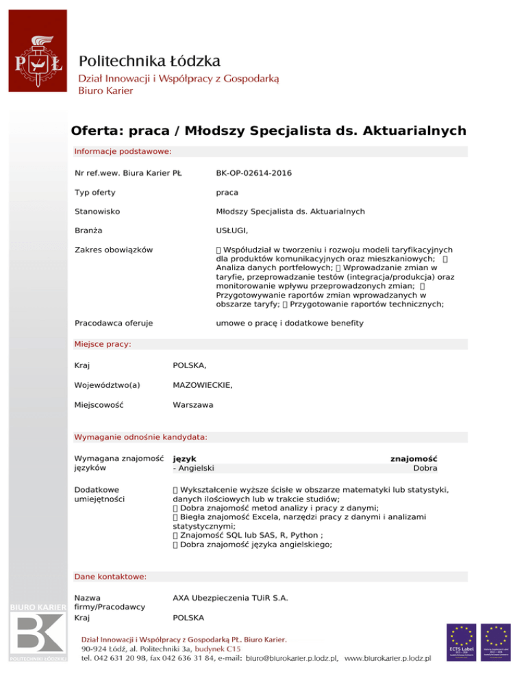 Oferta: praca / Młodszy Specjalista ds. Aktuarialnych Informacje podstawowe: Nr ref.wew. Biura Karier PŁ BK-OP-02614-2016 Typ oferty praca Stanowisko Młodszy Specjalista ds. Aktuarialnych Branża USŁUGI, Zakres obowiązków Współudział w tworzeniu i rozwoju modeli taryfikacyjnych dla produktów komunikacyjnych oraz mieszkaniowych; Analiza danych portfelowych; Wprowadzanie zmian w taryfie, przeprowadzanie testów (integracja/produkcja) oraz monitorowanie wpływu przeprowadzonych zmian; Przygotowywanie raportów zmian wprowadzanych w obszarze taryfy; Przygotowanie raportów technicznych; Pracodawca oferuje umowe o pracę i dodatkowe benefity Miejsce pracy: Kraj POLSKA, Województwo(a) MAZOWIECKIE, Miejscowość Warszawa Wymaganie odnośnie kandydata: Wymagana znajomość języków język - Angielski Dodatkowe umiejętności Wykształcenie wyższe ścisłe w obszarze matematyki lub statystyki, danych ilościowych lub w trakcie studiów; Dobra znajomość metod analizy i pracy z danymi; Biegła znajomość Excela, narzędzi pracy z danymi i analizami statystycznymi; Znajomość SQL lub SAS, R, Python ; Dobra znajomość języka angielskiego; Dane kontaktowe: Nazwa firmy/Pracodawcy Kraj AXA Ubezpieczenia TUiR S.A. POLSKA znajomość Dobra Województwo Miasto Adres Kod pocztowy MAZOWIECKIE Warszawa Chłodna 51 00-867 Warszawa 00-867 Sposób aplikacji: [email protected] Data umieszczenia: Oferta ważna od 08-12-2016 do 28-02-2018 Politechnika Łódzka, jest wpisana pod numerem 2414 do rejestru podmiotów prowadzących agencje zatrudnienia.