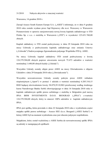 Nabycie aktywów o znacznej wartości 31/2010 Warszawa, 14 grudnia 2010 r. Zarząd Asseco South Eastern Europe S.A. („ASEE”) informuje, że w dniu 9 grudnia 2010 roku zostało wydane przez Sąd Rejonowy dla m.st. Warszawy w Warszawie Postanowienie w sprawie zarejestrowania nowej kwoty kapitału zakładowego w ITD Polska Sp. z o.o. z siedzibą w Warszawie („ITD”) w wysokości 125.651.760,00 złotych. Kapitał zakładowy w ITD został podwyższony w dniu 29 listopada 2010 roku na mocy Uchwały o podwyższeniu kapitału zakładowego oraz zmianie Umowy („Uchwała”) Nadzwyczajnego Zgromadzenia jedynego Wspólnika ITD tj. ASEE. Na mocy Uchwały kapitał zakładowy ITD został podwyższony o kwotę 124.379.504,00 złotych poprzez utworzenie nowych 75.473 udziałów o wartości nominalnej 1.648,00 złotych każdy („Udziały”). Wszystkie Udziały zostały objęte przez ASEE na mocy Oświadczenia o objęciu Udziałów z dnia 29 listopada 2010 roku („Oświadczenie”). Wszystkie nowoutworzone Udziały zostały pokryte przez ASEE wkładem niepieniężnym („Aport”) w postaci 1 udziału o wartości nominalnej 6.205.310,15 RSD będącej ekwiwalentem kwoty 58.079,59 EURO przeliczonej według średniego kursu Narodowego Banku Serbii obowiązującego w dniu 16 listopada 2010 roku w kapitale zakładowym spółki prawa serbskiego z siedzibą w Belgradzie pod nazwą IPSA BHM INVESTMENTS D.O.O. BEOGRAD („IPSA”) o wartości 124.379.504,00 złotych, który to stanowi 100% udziałów w kapitale zakładowym IPSA. IPSA jest spółką, która powstała w dniu 22 listopada 2010 roku z wydzielenia części majątku spółki prawa serbskiego - Asseco SEE d.o.o. Beogard („ASEE Serbia”) w której ASEE był na moment wydzielenia oraz jest obecnie jedynym wspólnikiem. Majątkiem, który został wydzielony z ASEE Serbia do nowoutworzonej spółki IPSA są udziały w następujących spółkach: - 100% udziałów in PEXIM SOLUTIONS, d.o.o. z siedzibą w Banja Luka, Republika Bośni i Hercegowiny; - 100% udziałów w IBIS d.o.o. z siedzibą w Banja Luka, Republika Bośni i Hercegowiny; - 50% udziałów w Cardinfo BDS d.o.o z siedzibą w Sarajewo, Republika of Bośni i Hercegowiny; - 100% udziałów w Asseco SEE d.o.o z siedzibą w Skopje, Republika Macedonii. Wartość rynkowa majątku IPSA zadecydowała o przedstawionej powyżej wycenie wartości rynkowej Aportu. Docelowo transakcja opisana w niniejszym raporcie ma spowodować spłaszczenie struktury właścicielsko-organizacyjnej i zoptymalizować zarządzanie w Grupie Kapitałowej ASEE („Grupa”). Powyższe zmiany nie mają wpływu na sumę oraz wycenę posiadanych aktywów w Grupie. W skład Zarządu ITD wchodzą następujące osoby: Aytac Baybol, Rafał Kozłowski, Hatice Ayas i Coskun Ural, przy czym Rafał Kozłowski jest Wiceprezesem Zarządu ASEE a Hatice Ayas oraz Coskun Ural są członkami Rady Dyrektorów w ITD İletişim Teknoloji Danışmanlık Ticaret A.Ş. z siedzibą w Istambule oraz w EST Elektronik Sanal Ticaret ve Bilisim Hizmetleri A.Ş. z siedzibą w Istambule. Kryterium będące podstawą uznania aktywów za aktywa o znacznej wartości jest wartość rynkowa 100% kapitału zakładowego w IPSA, o którą to wartość został podwyższony kapitał zakładowy w ITD. Podstawa prawna: § 5 ust. 1 pkt 1 Rozporządzenia w sprawie raportów bieżących i okresowych