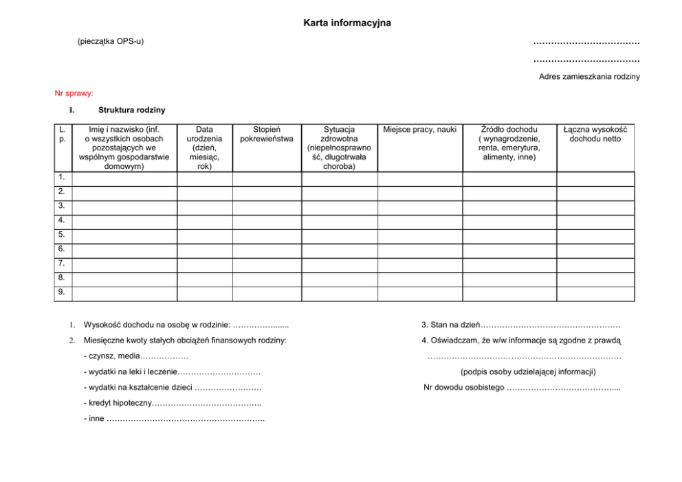 Karta informacyjna ……………………………… (pieczątka OPS-u) ……………………………… Adres zamieszkania rodziny Nr sprawy: I. Struktura rodziny Imię i nazwisko (inf. o wszystkich osobach pozostających we wspólnym gospodarstwie domowym) L. p. Data urodzenia (dzień, miesiąc, rok) Stopień pokrewieństwa Sytuacja zdrowotna (niepełnosprawno ść, długotrwała choroba) Miejsce pracy, nauki Źródło dochodu ( wynagrodzenie, renta, emerytura, alimenty, inne) Łączna wysokość dochodu netto 1. 2. 3. 4. 5. 6. 7. 8. 9. 1. Wysokość dochodu na osobę w rodzinie: ……………....... 3. Stan na dzień……………………………………………. 2. Miesięczne kwoty stałych obciążeń finansowych rodziny: 4. Oświadczam, że w/w informacje są zgodne z prawdą - czynsz, media……………… - wydatki na leki i leczenie…………………………. - wydatki na kształcenie dzieci ……………………. - kredyt hipoteczny………………………………….. - inne ………………………………………………….. ……………………………………………………………… (podpis osoby udzielającej informacji) Nr dowodu osobistego ………………………………….... II. Informacje dotyczące korzystania ze świadczeń pomocy społecznej Korzystanie ze świadczeń pomocy społecznej (zaznaczyć właściwe): rodzina nie korzysta rodzina korzysta : stale okresowo sporadycznie Świadczenia z pomocy społecznej (art. 36 ustawy o pomocy społecznej- Dz. U. 2013 poz.182 j.t.). Ponadto prosimy o wpisanie wysokości poszczególnych świadczeń pieniężnych oraz okresów korzystania z danych form pomocy: Świadczenia pieniężne III. Świadczenia niepieniężne Dane dotyczące udzielonego osobie/rodzinie wsparcia w ramach programów systemowych z POKL : ……………………………………………………………………………………………………………………………………………………………………………………………… ……………………………………………………………………………………………………………………………………………………………………………………………… ……………………………………………………………………………………………………………………………………………………………………………………………… ……………………………………………………………………………………………………………………………………………………………………………………………… ……………………………………………………………………………………………………………………………………………………………………………………………… ……………………………………………………………………………………………………………………………………………………………………………………………… ……………………………………………………………………………………………………………………………………………………………………………………………… ……………………………………………………………………………………………………………………………………………………………………………………………… ……………………………………………………………………………………………………………………………………………………………………………………………… ……………………………………………………………………………………………………………………………………………………………………………………………… IV. Problemy występujące w rodzinie ( bezrobocie, niepełnosprawność, długotrwała choroba, wielodzietność, inne): ……………………………………………………………………………………………………………………………………………………………………………………………… ……………………………………………………………………………………………………………………………………………………………………………………………… ……………………………………………………………………………………………………………………………………………………………………………………………… ……………………………………………………………………………………………………………………………………………………………………………………………… ……………………………………………………………………………………………………………………………………………………………………………………………… ……………………………………………………………………………………………………………………………………………………………………………………………… ……………………………………………………………………………………………………………………………………………………………………………………………… ……………………………………………………………………………………………………………………………………………………………………………………………… ……………………………………………………………………………………………………