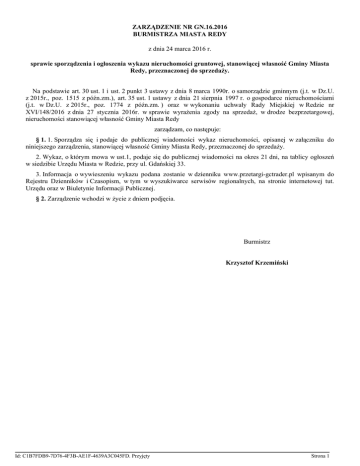 ZARZĄDZENIE NR GN.16.2016 BURMISTRZA MIASTA REDY z dnia 24 marca 2016 r. sprawie sporządzenia i ogłoszenia wykazu nieruchomości gruntowej, stanowiącej własność Gminy Miasta Redy, przeznaczonej do sprzedaży. Na podstawie art. 30 ust. 1 i ust. 2 punkt 3 ustawy z dnia 8 marca 1990r. o samorządzie gminnym (j.t. w Dz.U. z 2015r., poz. 1515 z późn.zm.), art. 35 ust. 1 ustawy z dnia 21 sierpnia 1997 r. o gospodarce nieruchomościami (j.t. w Dz.U. z 2015r., poz. 1774 z późn.zm. ) oraz w wykonaniu uchwały Rady Miejskiej w Redzie nr XVI/148/2016 z dnia 27 stycznia 2016r. w sprawie wyrażenia zgody na sprzedaż, w drodze bezprzetargowej, nieruchomości stanowiącej własność Gminy Miasta Redy zarządzam, co następuje: § 1. 1. Sporządza się i podaje do publicznej wiadomości wykaz nieruchomości, opisanej w załączniku do niniejszego zarządzenia, stanowiącej własność Gminy Miasta Redy, przeznaczonej do sprzedaży. 2. Wykaz, o którym mowa w ust.1, podaje się do publicznej wiadomości na okres 21 dni, na tablicy ogłoszeń w siedzibie Urzędu Miasta w Redzie, przy ul. Gdańskiej 33. 3. Informacja o wywieszeniu wykazu podana zostanie w dzienniku www.przetargi-gctrader.pl wpisanym do Rejestru Dzienników i Czasopism, w tym w wyszukiwarce serwisów regionalnych, na stronie internetowej tut. Urzędu oraz w Biuletynie Informacji Publicznej. § 2. Zarządzenie wchodzi w życie z dniem podjęcia. Burmistrz Krzysztof Krzemiński Id: C1B7FDB9-7D76-4F3B-AE1F-4639A3C045FD. Przyjęty Strona 1 Uzasadnienie do zarządzenia Nr GN.16.2016 Burmistrza Miasta Redy z dnia 24 marca 2016r. w sprawie sporządzenia i ogłoszenia wykazu nieruchomości gruntowej, stanowiącej własność Gminy Miasta Redy, przeznaczonej do sprzedaży. Zgodnie z art. 35 ust. 1 ustawy z dnia 21 sierpnia 1997 r. o gospodarce nieruchomościami właściwy organ sporządza i podaje do publicznej wiadomości wykaz nieruchomości przeznaczonych do sprzedaży, do oddania w użytkowanie wieczyste, użytkowanie, najem lub dzierżawę. W wykazie określa się dane o nieruchomości, odpowiednio do określonych w art. 35 ust. 2 w/w ustawy. Rada Miejska w Redzie uchwałą Nr XVI/148/2016 z dnia 27 stycznia 2016r. wyraziła zgodę na sprzedaż, w drodze bezprzetargowe,j nieruchomości opisanej w wykazie stanowiącym załącznik do niniejszego zarządzenia. W wykonaniu w/w uchwały i w oparciu o powołany art. 35 ust. 1 i ust. 2 ustawy o gospodarce nieruchomościami postanowiono o sporządzeniu i podaniu do publicznej wiadomości wykazu dla nieruchomości objętej niniejszym zarządzeniem, opisanej w załączniku. Wykaz podany zostanie do publicznej wiadomości w sposób określony w § 1 ust. 2 a o wywieszeniu wykazu - w sposób określony w § 1 ust. 3 tego Zarządzenia. informacja Dalsze procedury zmierzające do sprzedaży w/w nieruchomości kontynuowane będą po upływie terminów zawartych w wykazie. Burmistrz Krzysztof Krzemiński Id: C1B7FDB9-7D76-4F3B-AE1F-4639A3C045FD. Przyjęty Strona 1