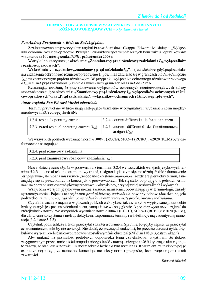 Z listów do i od Redakcji TERMINOLOGIA W OPISIE WYŁĄCZNIKÓW OCHRONNYCH RÓŻNICOWOPRĄDOWYCH – odp. Edward Musiał Pan Andrzej Boczkowski w liście do Redakcji pisze: Z zainteresowaniem przeczytałem artykuł Panów Stanisława Czappa i Edwarda Musiała p.t. „Wyłączniki ochronne różnicowoprądowe. Przegląd i charakterystyka współczesnych konstrukcji” opublikowany w numerze nr 109 miesięcznika INPE z października 2008 r. W artykule autorzy stosują określenie: „Znamionowy prąd różnicowy zadziałania ID n wyłączników różnicowoprądowych”. W określeniu tym użycie słów „znamionowy prąd zadziałania ID n” nie jest właściwe, gdyż prąd zadziałaID nia urządzenia ochronnego różnicowoprądowego ID powinien zawierać się w granicach 0,5 ID n¸ n, gdzie ID n jest znamionowym prądem różnicowym. W przypadku wyłącznika ochronnego różnicowoprądowego o ID zwykle zawiera się w granicach od 18 mA do 25 mA. n = 30 mA prąd zadziałania ID Reasumując uważam, że przy stosowaniu wyłączników ochronnych różnicowoprądowych należy stosować następujące określenia: „Znamionowy prąd różnicowy ID n wyłączników ochronnych różnicowoprądowych”oraz „Prąd zadziałania ID wyłączników ochronnych różnicowoprądowych”. Autor artykułu Pan Edward Musiał odpowiada Terminy przywołane w liście mają następujące brzmienie w oryginalnych wydaniach norm międzynarodowych IEC i europejskich EN: 3.2.4. residual operating current 3.2.4. courant différentiel de fonctionnement 5.2.3. rated residual operating current (IΔn) 5.2.3. courant différentiel de fonctionnement assigné (IΔn) We wszystkich polskich wydaniach norm 61008-1 (RCCB), 61009-1 (RCBO) i 62020 (RCM) były one tłumaczone następująco: 3.2.4. prąd różnicowy zadziałania 5.2.3. prąd znamionowy różnicowy zadziałania (IΔn) Nawet dziecię zauważy, że w porównaniu z terminem 3.2.4 we wszystkich wersjach językowych terminu 5.2.3 dodano określenie znamionowy (rated, assigné) i tylko tym się one różnią. Polskie tłumaczenie jest poprawne, ale można mu zarzucić, że dodane określenie znamionowy rozdziera pierwotny termin, a nie znajduje się na początku lub na końcu, jak w pierwowzorach. Tak się stało, bo przyjęto w polskich terminach na początku umieszczać główny rzeczownik określający, przynajmniej w słownikach i wykazach. Wszystkim wersjom językowym można zarzucić naruszenie, obowiązującej w terminologii, zasady systematyczności. Pojęciu nadrzędnemu prąd różnicowy zadziałania powinny odpowiadać dwa pojęcia podrzędne: znamionowy prąd różnicowy zadziałania oraz rzeczywisty prąd różnicowy zadziałania. Czytelnik, znany z mącenia w głowach polskich elektryków, tak uwierzył w wypisywane przez siebie bzdety, że myli je z postanowieniami norm, zamącił i we własnej głowie. A przecież wystarczyło zajrzeć do którejkolwiek normy. We wszystkich wydaniach norm 61008-1 (RCCB), 61009-1 (RCBO) i 62020 (RCM), dla ułatwienia korzystania z nich dyslektykom, wspomniane terminy i ich definicje mają identyczną numerację (3.2.4 oraz 5.2.3). Czytelnik podkreślił, że artykuł przeczytał z zainteresowaniem. Sprytnie, bo gdyby napisał, że przeczytał ze zrozumieniem, nikt by nie uwierzył. Nie dodał, że przeczytał cudzy list, bo przecież adresaci cyklu artykułów o wyłącznikach różnicowoprądowych zostali wyraźnie określeni (INPE, nr 108, s. 3, ostatni akapit). Aby uniknąć na przyszłość podobnych odpowiedzi temu czytelnikowi, wyjaśniam, że ilekroć w sygnowanym przeze mnie tekście napotka niezgodność z normą – niezgodność faktyczną, a nie urojoną – to znaczy, że błąd jest w normie. I w moim tekście będzie o tym wzmianka. Rozumiem, że trudno to pojąć osobie znanej z tego, że namiętnie komentuje nie teksty norm i przepisów, lecz swoje urojenia o ich zawartości. Edward Musiał Nr 112-113 109 Z listów do i od Redakcji JESZCZE RAZ O ODPORNOŚCI TRASY KABLOWEJ W KORYTKACH KABLOWYCH Pan Józef Wysocki z Wrocławskiego Oddziału SEP pisze: W zeszycie 109 INPE z października 2008 r., na str. 73 ukazała się odpowiedź Jerzego Martyńskiego dotycząca odporności ogniowej trasy kablowej. Odpowiedź nie w pełni jest poprawna, podobnie komentarz do niej. Z odpowiedzi wynika, że każdy przewód lub kabel E 90 może być ułożony w korytku kablowym E 90. Rzecz w tym, że nie zawsze każdy i niekoniecznie kabel E 90. W komentarzu pomylono klasyfikację budowlaną z klasyfikacją elektryczną. Warunki techniczne [1] w § 187 ust. 3 i 4 zawierają wymóg ciągłości dostawy energii i sygnału w warunkach pożaru przez odpowiednio długi czas (90 lub 30 minut), czyli podtrzymania funkcji oprzewodowania w wymaganym czasie, w umownych warunkach pożaru. W Polsce nie ma jeszcze norm obejmujących ten zakres techniki, wobec czego w praktyce projektowej, wykonawczej i produkcyjnej powinno się stosować niemiecką normę DIN 4102 część 12, wydanie z listopada 1998 r. [2], w której występuje klasa podtrzymania funkcji oprzewodowania E 30, E 60 lub E 90. Instalacja spełniająca wymagania normy DIN 4102-12 [2] czyni zadość wymaganiom § 187 ust. 3 i 4 warunków technicznych [1]. Pod pojęciem oprzewodowania rozumie się kable elektroenergetyczne, izolowane przewody elektroenergetyczne, izolowane kable i przewody dla telekomunikacji oraz techniki przetwarzania danych, jak również przewody szynowe, łącznie z właściwymi im listwami, kanałami oraz osłonami, elementami konstrukcji nośnej oraz zamocowaniami. Według tej normy sprawdzane są kable i przewody zawsze razem z ich osłonami i systemami nośnymi. Klasa podtrzymania funkcji E (30, 60, 90) według DIN 4102-12 [2] jest gwarantowana przy wspólnej certyfikacji przewodu bądź kabla oraz systemu nośnego. Certyfikat jest ważny dla poddanych sprawdzeniu kabli (określonego typu i producenta) łącznie z użytą podczas sprawdzenia konstru