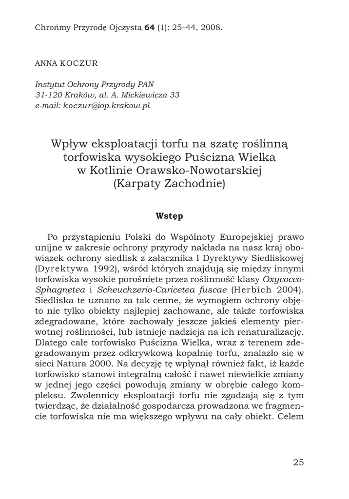 Chrońmy Przyrodę Ojczystą 64 (1): 25–44, 2008. ANNA KOCZUR Instytut Ochrony Przyrody PAN 31-120 Kraków, al. A. Mickiewicza 33 e-mail: [email protected] Wpływ eksploatacji torfu na szatę roślinną torfowiska wysokiego Puścizna Wielka w Kotlinie Orawsko-Nowotarskiej (Karpaty Zachodnie) Wstęp Po przystąpieniu Polski do Wspólnoty Europejskiej prawo unijne w zakresie ochrony przyrody nakłada na nasz kraj obowiązek ochrony siedlisk z załącznika I Dyrektywy Siedliskowej (Dyrektywa 1992), wśród których znajdują się między innymi torfowiska wysokie porośnięte przez roślinność klasy OxycoccoSphagnetea i Scheuchzerio-Caricetea fuscae (Herbich 2004). Siedliska te uznano za tak cenne, że wymogiem ochrony objęto nie tylko obiekty najlepiej zachowane, ale także torfowiska zdegradowane, które zachowały jeszcze jakieś elementy pierwotnej roślinności, lub istnieje nadzieja na ich renaturalizację. Dlatego całe torfowisko Puścizna Wielka, wraz z terenem zdegradowanym przez odkrywkową kopalnię torfu, znalazło się w sieci Natura 2000. Na decyzję tę wpłynął również fakt, iż każde torfowisko stanowi integralną całość i nawet niewielkie zmiany w jednej jego części powodują zmiany w obrębie całego kompleksu. Zwolennicy eksploatacji torfu nie zgadzają się z tym twierdząc, że działalność gospodarcza prowadzona we fragmencie torfowiska nie ma większego wpływu na cały obiekt. Celem 25 A. Koczur pracy jest analiza przemian zachodzących w obrębie roślinności torfowiska wysokiego Puścizna Wielka w wyniku eksploatacji torfu. Charakterystyka terenu Torfowisko Puścizna Wielka jest największym torfowiskiem wysokim w Polskich Karpatach. Znajduje się ono na terenie Kotliny Orawsko-Nowotarskiej, położonej w obrębie Centralnych Karpat Zachodnich, w Obniżeniu Orawsko-Podhalańskim (ryc. 1), oddzielającym łańcuch Tatr od Beskidów Zachodnich (Kondracki 2000). Panujący tu specyficzny klimat charakteryzuje się częstymi inwersjami temperatur, spowodowanymi zastoiskami zimnego powietrza spływającego z otaczających gór, dużym zachmurzeniem, częstymi mgłami i długim zaleganiem Beskid OrawskoDzia³y Orawskie Podhalañski G o 5 km órze Pog 1 2 3 4 c e Beskid Kotlina Orawsko-Nowotarska 0 r S¹dec ki Pieniny Spisko-Guba³owskie 54° Rów Podtatrzañski Tatry Zachodnie Tatry Wschodnie 50° £ a ñ c u c h Ta t r z a ñ s k i 16° 24° Ryc. 1. Położenie torfowiska Puścizna Wielka na tle podziału fizjograficznego Karpat Polskich (wg Kondrackiego 2000): 1 – granice mezoregionów, 2 – granica makroregionów, 3 – granica podprowincji, 4 – granica państwa. Fig. 1. Location of the Puścizna Wielka peat bog (the physiographic division of the Polish Carpathians according to Kondracki 2000): 1 – mesoregion borders, 2 – macroregion borders, 3 – sub-province borders, 4 – state borders. 26 Wpływ eksploatacji torfu na szatę roślinną Puścizny Wielkiej pokrywy śnieżnej (Staszkiewicz, Szeląg 2003). W przeszłości warunki takie sprzyjały powstaniu torfowisk a obecnie umożliwiają ich przetrwanie. Torfowisko Puścizna Wielka, tak jak inne torfowiska Kotliny Orawsko-Nowotarskiej, powstało pod koniec epoki lodowcowej (około 10 tysięcy lat temu) na obszarach stożków fluwioglacjalnych, pozostałych po lodowcach tatrzańskich (Baugmart-Kotarba 1992). Prowadzona w XX wieku eksploatacja torfu spowodowała zmniejszenie powierzchni torfowiska z 620 do 466 ha (o 24,8%). Obecnie ponad 356 ha przypada na kopułę torfowiska, podczas gdy pierwotnie jej powierzchnia wynosiła koło 427,5 ha (Łajczak 2001). Duża część kopuły (ponad 100 ha) została silnie przekształcona w wyniku prowadzonej do dziś wielkopowierzchniowej eksploatacji torfu. Pomimo tych zniszczeń, pozostała część stanowi najlepiej zachowane torfowisko wysokie Polskich Karpat. Charakterystyka flory i roślinności torfowiska Torfowisko Puścizna Wielka jest nie tylko największym torfowiskiem wysokim na terenie Karpat Polskich, ale również najbogatszym i najcenniejszym pod względem porastającej je szaty roślinnej (Koczur 2006a, 2006b). Panujące tu od tysiącleci specyficzne warunki siedliskowe i klimatyczne, a także położenie w sąsiedztwie wysokich pasm górskich, wpłynęły na wykształcenie się tu jedynej w swoim rodzaju, nie spotykanej nigdzie indziej roślinności. Na tę niezwykłą kombinację składają się między innymi liczne relikty glacjalne (tab. 1), czyli rośliny typowe dla obszarów podbiegunowych, które osiedliły się tu w czasie epoki lodowcowej i przetrwały do dzisiaj. Specyfiką roślinności torfowisk Kotliny Orawsko-Nowotarskiej (w tym Puścizny Wielkiej) jest obecność zwykle nie spotykanych głębiej w górach gatunków niżowych. Występuje tu największa w Polskich Karpatach populacja sosny zwyczajnej Pinus sylvestris stanowiąca odrębną rasę – tzw. rasa podhalańska (Madeyski 1956). Obok gatunków niżowych rosną taksony typowo górskie (kosodrzewina Pinus mugo), a także mieszańce, powstałe dzięki zetknięciu się zasięgów tych roślin (sosna błotna Pinus × rhaetica; Staszkiewicz, Tyszkiewicz 1969). 27 28 Gatunki rosnące na kopule torfowiska Species growing on bog dome Bagnica torfowa Scheuchzeria palustris Bagno zwyczajne Ledum palustre Bażyna czarna Empetrum nigrum Malina moroszka Rubus chamaemorus Modrzewnica pospolita Andromeda polifolia Przygiełka biała Rhynchospora alba Rosiczka długolistna Drosera anglica Rosiczka okrągłolistna Drosera rotundifolia Rosiczka owalna Drosera ×obovata Sosna błotna Pinus × rhaetica Sosna kosodrzewina Pinus mugo Turzyca bagienna Carex limosa Żurawina błotna Oxycoccus palustris Żurawina drobnolistkowa Oxycoccus microcarpus V V(LR) V(VU) E V V V(EN) E Kategorie zagrożenia1 Threat categories1 ● ● ● ● ● ● ● ● ● Gatunki chronione2 Protected species2 + + + + + + + + + + + Relikty glacjalne Glacial relicts Tabela 1. Rośliny naczyniowe Puścizny Wie