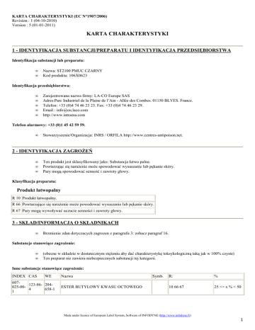 KARTA CHARAKTERYSTYKI (EC N°1907/2006) Revision : 1 (04-10-2010) Version : 5 (01-01-2011) KARTA CHARAKTERYSTYKI 1 - IDENTYFIKACJA SUBSTANCJI/PREPARATU I IDENTYFIKACJA PRZEDSIĘBIORSTWA Identyfikacja substancji lub preparatu: • • Nazwa: ST2100 PMUC CZARNY Kod produktu: 106X0623 Identyfikacja przedsiębiorstwa: • • • • • Zarejestrowana nazwa firmy: LA-CO Europe SAS Adres:Parc Industriel de la Plaine de l’Ain - Allée des Combes. 01150 BLYES. France. Telefon: +33 (0)4 74 46 23 23. Fax: +33 (0)4 74 46 23 29. Email : [email protected] http://www.intrama.com Telefon alarmowy: +33 (0)1 45 42 59 59. • Stowarzyszenie/Organizacja: INRS / ORFILA http://www.centres-antipoison.net. 2 - IDENTYFIKACJA ZAGROŻEŃ • • • Ten produkt jest sklasyfikowany jako: Substancja łatwo palna. Powtarzając się narażenie może spowodować wysuszanie lub pękanie skóry. Pary mogą spowodować senność i zawroty głowy. Klasyfikacja preparatu: Produkt łatwopalny R 10 Produkt łatwopalny. R 66 Powtarzające się narażenie może powodować wysuszanie lub pękanie skóry. R 67 Pary mogą wywoływać uczucie senności i zawroty głowy. 3 - SKŁAD/INFORMACJA O SKŁADNIKACH • Brzmienie zdan dotyczacych zagrozen z paragrafu 3: zobacz paragraf 16. Substancje stanowiące zagrożenie: • • (obecne w składzie w dostatecznym stężeniu aby dać charakterystykę toksykologiczną taką jak w 100% czyste) Ten preparat nie zawiera niebezpiecznych substancji tej kategorii. Inne substancje stanowiące zagrożenie: INDEX CAS WE 607123-86- 204025-004 658-1 1 Nazwa ESTER BUTYLOWY KWASU OCTOWEGO Symb. R: % 10 66 67 25 <= x % < 50 Made under licence of European Label System, Software of INFODYNE (http://www.infodyne.fr) 1 KARTA CHARAKTERYSTYKI (EC N°1907/2006) Revision : 1 (04-10-2010) Version : 5 (01-01-2011) Obecne substancje w ilości poniżej niebezpiecznego stężenia granicznego: • Brak znanych substancji tej kategorii. Inne substancje z określonymi dopuszczalnymi stężeniami w miejscu pracy: INDEX CAS 133386-4 WE Nazwa 215609-9 CARBON BLACK 1 <= x % < 2.5 CALCIUM CARBONATE 25 <= x % < 50 471-34- 2071 439-9 Symb. R: % 4 - PIERWSZA POMOC • • Generalnie, w razie wątpliwości lub jeśli objawy się utrzymują, zawsze należy wezwać lekarza. NIGDY nie wywoływać wymiotów u nieprzytomnej osoby. W wypadku narażenia na inhalację: • W przypadku zainhalowania dużych ilości, wyprowadzić poszkodowanego na świeże powietrze i utrzymywać go w cieple i spokoju. W wypadku zanieczyszczenia oczu: • • Trzymając uniesione powieki, przemywać starannie miękką, czystą wodą przez 15 minut. Skierować poszkodowanego do okulisty, szczególnie gdy występuje jakiekolwiek zaczerwienienie, ból lub pogorszenie widzenia. W wypadku zanieczyszczenia skóry: • • Zdjąć zanieczyszczoną odzież i umyć dokładnie skórę wodą z mydłem lub uznanym środkiem czyszczącym. NIE STOSOWAĆ rozpuszczalników lub rozcieńczalników. W wypadku połknięcia: • • W wypadku połknięcia, jeśli ilość jest mała (nie więcej niż jeden łyk), przepłukać usta wodą i skonsultować się z lekarzem. W razie przypadkowego połknięcia, wezwać lekarza dla oceny konieczności kontrolowania i ewentualnego leczenia szpitalnego. Pokazać lekarzowi etykietę. 5 - POSTĘPOWANIE W PRZYPADKU POŻARU • Proszki chemiczne, dwutlenek węgla i inne gazy gaszące są odpowiednie dla małych pożarów. Stosowne środki gaśnicze: • • Specjalne piany dla cieczy polarnych (znane jako odporne na alkohol), proszki, dwutlenek węgla). W przypadku pożaru, używać wyszczególnionych, odpowiednich środków gaśniczych. Nigdy nie stosować wody. Środki gaśnicze, których nie wolno użyć ze względów bezpieczeństwa: • • Woda nie jest ogólnie zalecana ponieważ możę zostać skażona; jakkolwiek, może być użyta z powodzeniem do chłodzenia pojemników wystawionych na działanie pożaru i do rozpraszania dymów. Czasami, z powodu obecności materiału organicznego, w wyniku pożaru może powstawać czarny dym. Narażenie na działanie produktów rozkładu może stanowić zagrożenie dla zdrowia. Made under licence of European Label System, Software of INFODYNE (http://www.infodyne.fr) 2 KARTA CHARAKTERYSTYKI (EC N°1907/2006) Revision : 1 (04-10-2010) Version : 5 (01-01-2011) • • Nie wdychać dymu. Zabezpieczyć użyte środki przeciwpożarowe przed dostaniem się do ścieków lub dróg wodnych. Specjalne wyposażenie ochronne dla osób walczących z pożarem: • • Osoby gaszące pożar powinny być wyposażone w niezależne izolowane aparaty oddechowe. Z powodu wydzielania tosycznych gazów w wyniku rozkładu termicznego produktu, personel gaszący pożar powinien być wyposażony w niezależne, izolowane aparaty oddechowe. 6 - POSTĘPOWANIE W PRZYPADKU NIEZAMIERZONEGO UWOLNIENIA DO ŚRODOWISKA Indywidualnych środków ostrożności, takich jak: • • • Z powodu organicznych rozpuszczalników zawartych w preparacie, wyeliminować źródła zapalenia i wentylować pomieszczenia. Unikać wdychania pyłu. Zapoznać się ze środkami bezpieczeństwa wymienionymi w punktach 7 i 8. Środków ochrony środowiska takich jak: • • • • Powstrzymać i zebrać wyciek lub rozlany materiał przy pomocy niepalnego absorbującego materiału jak piasek, ziemia, vermiculit, ziemia okrzemkowa, w beczkach do utylizacji. Zabezpieczyć materiał przed dostaniem się do ścieków lub dróg wodnych. Beczki w celu odzyskiwania odpadów stosować zgodnie z odpowiednimi przepisami (punkt 13). W przypadku zanieczyszczenai produktem dróg wodnych, rzek lub ścieków, zawiadomić odpowiednie władze zgodnie z ustawowymi procedurami. Metod oczyszczania takich jak: • Zaleca się czyszczenie przy pomocy detergentów, nie stosować rozpuszczalników. 7 - POSTĘPOWANIE Z SUBSTANCJĄ/PREPARATEM I JEJ/JEGO MAGAZYNOWANIE • Zastosować przepisy dotyczące przechowywania do wydziałów produkcyjnych gdzie produkt jest stos