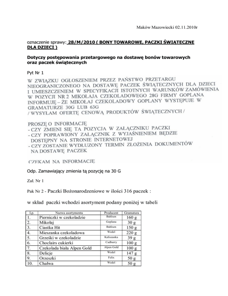Maków Mazowiecki 02.11.2010r oznaczenie sprawy: 28/M/2010 ( BONY TOWAROWE, PACZKI ŚWIĄTECZNE DLA DZIECI ) Dotyczy postępowania przetargowego na dostawę bonów towarowych oraz paczek świątecznych Pyt Nr 1 Odp. Zamawiający zmienia tą pozycję na 30 G Zał. Nr 1 Pak Nr 2 - Paczki Bożonarodzeniowe w ilości 316 paczek : w skład paczki wchodzi asortyment podany poniżej w tabeli Lp. 1. 2. 3. 4. 5. 6. 7. 8. 9. 10. Nazwa asortymentu Pierniczki w czekoladzie Mikołaj Ciastka Hit Mieszanka czekoladowa Grześki w czekoladzie Choclairs cukierki Czekolada biała Alpen Gold Delicje Orzeszki Chałwa Producent Gramatura Bahlsen 160 g 30 g 150 g 220 g 39 g 100 g 100 g 147 g 50 g 50 g Goplana Bahlsen Wedel Kaliszanka Cadburry Alpen Gold Wedel Felix Wedel 11. 12. 13. 14. 15. 16. 17. 18. 19. 20. 21. Milky Way Ptasie mleczko Czekolada duża z orzechami Czekolada nadziewana Czekolada mleczna Żelki z nadzieniem Żelki z nadzieniem Draże Kinder delice Baton 3Bit Mamba owocowa Milky Wedel Wedel Wedel Wedel Jutrzenka Jutrzenka Skawa Ferrero Jacobs Storck 21,5 g 420 g 160 g 100 g 100 g 90 g 90 g 70 g 42 g 41 g 27,5g ogółem wartość netto 316 paczek ..................................... ogółem wartość brutto 316 paczek ..................................... Dostawa przygotowanych w ozdobnych świątecznych opakowaniach paczek na dzień 1 grudnia 2010r. Opakowania oraz dostawa wliczona jest w cenę wartości paczek. Podpis Wykonawcy ………………………………