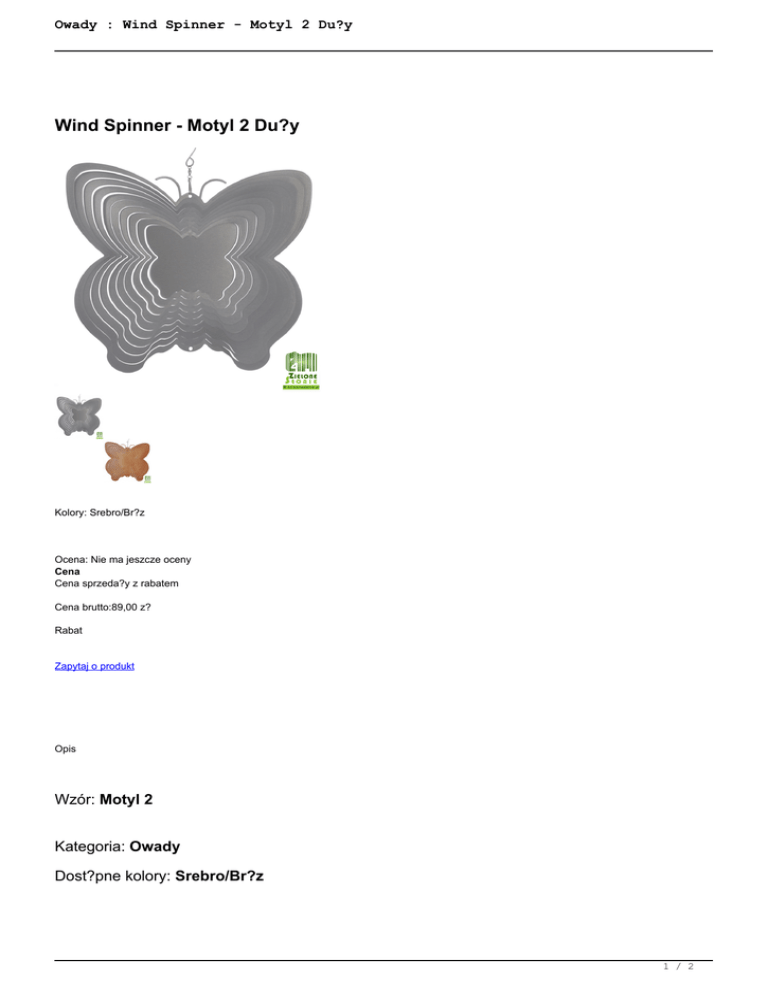Owady : Wind Spinner - Motyl 2 Du?y Wind Spinner - Motyl 2 Du?y Kolory: Srebro/Br?z Ocena: Nie ma jeszcze oceny Cena Cena sprzeda?y z rabatem Cena brutto:89,00 z? Rabat Zapytaj o produkt Opis Wzór: Motyl 2 Kategoria: Owady Dost?pne kolory: Srebro/Br?z 1 / 2 Owady : Wind Spinner - Motyl 2 Du?y Wielko??: Du?y Do ka?dego Wind Spinnera, jeden metalowy haczyk gratis! Wind Spinnery czyli ozdoby ze stali nierdzewnej, które poruszaj?c si? na wietrze lub przy pomocy silniczka, tworz? pi?kn? iluzj? trójwymiarowo?ci. Je?eli chcesz dowiedzie? si? wi?cej na ich temat, kliknij tutaj. Opinie Nikt jeszcze nie recenzowa? tego produktu. 2 / 2 Powered by TCPDF (www.tcpdf.org)
