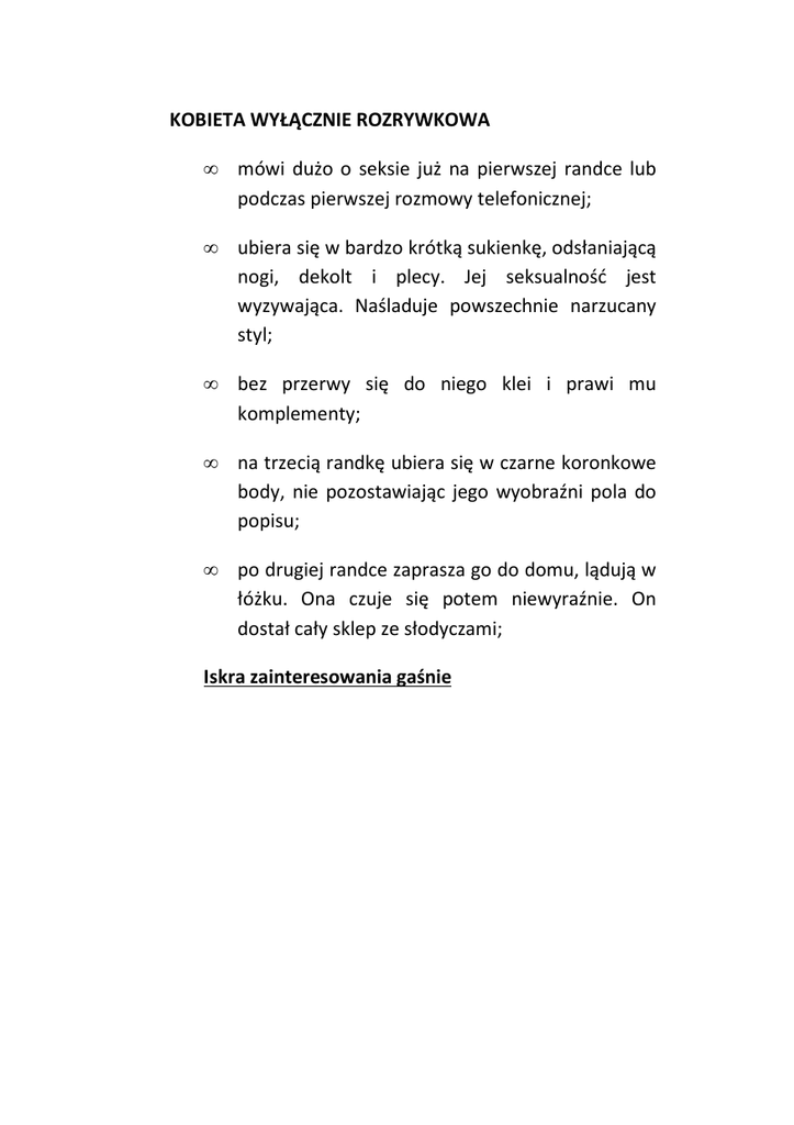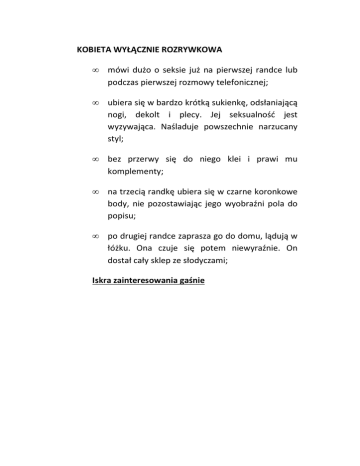 KOBIETA WYŁĄCZNIE ROZRYWKOWA • mówi dużo o seksie już na pierwszej randce lub podczas pierwszej rozmowy telefonicznej; • ubiera się w bardzo krótką sukienkę, odsłaniającą nogi, dekolt i plecy. Jej seksualność jest wyzywająca. Naśladuje powszechnie narzucany styl; • bez przerwy się do niego klei i prawi mu komplementy; • na trzecią randkę ubiera się w czarne koronkowe body, nie pozostawiając jego wyobraźni pola do popisu; • po drugiej randce zaprasza go do domu, lądują w łóżku. Ona czuje się potem niewyraźnie. On dostał cały sklep ze słodyczami; Iskra zainteresowania gaśnie
