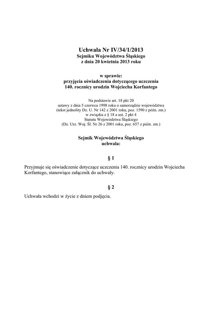 Uchwała Nr IV/34/1/2013 Sejmiku Województwa Śląskiego z dnia 20 kwietnia 2013 roku w sprawie: przyjęcia oświadczenia dotyczącego uczczenia 140. rocznicy urodzin Wojciecha Korfantego Na podstawie art. 18 pkt 20 ustawy z dnia 5 czerwca 1998 roku o samorządzie województwa (tekst jednolity Dz. U. Nr 142 z 2001 roku, poz. 1590 z późn. zm.) w związku z § 18 a ust. 2 pkt 4 Statutu Województwa Śląskiego (Dz. Urz. Woj. Śl. Nr 26 z 2001 roku, poz. 657 z późn. zm.) Sejmik Województwa Śląskiego uchwala: §1 Przyjmuje się oświadczenie dotyczące uczczenia 140. rocznicy urodzin Wojciecha Korfantego, stanowiące załącznik do uchwały. §2 Uchwała wchodzi w życie z dniem podjęcia. Załącznik do uchwały Nr IV/34/1/2013 Sejmiku Województwa Śląskiego z dnia 20 kwietnia 2013 roku Oświadczenie dotyczące uczczenia 140. rocznicy urodzin Wojciecha Korfantego 20 kwietnia bieżącego roku mija 140. rocznica urodzin Wojciecha Korfantego, wielkiego syna Śląskiej Ziemi. Sejmik Województwa Śląskiego składa hołd i wyraża wdzięczność Wojciechowi Korfantemu, wybitnemu Ślązakowi i Polakowi. Wojciech Korfanty urodził się 20 kwietnia 1873 roku jako najstarszy z pięciorga dzieci w rodzinie górniczej w osadzie Sadzawki, na terenie obecnych Siemianowic Śląskich. Naukę pobierał w szkole w Siemianowicach, a następnie w Gimnazjum Królewskim w Katowicach. Za prowadzenie kółka samokształceniowego, którego celem było szerzenie kultury i języka polskiego, został relegowany z gimnazjum. Maturę zdał eksternistycznie. Następnie podjął studia na politechnice w Charlottenburgu w Berlinie, później na Wydziale Filozoficznym Uniwersytetu Wrocławskiego studiował prawo i ekonomię. W 1902 r. objął redakcję "Górnoślązaka" w Katowicach. Za opublikowanie artykułów "Do Niemców" i "Do moich braci Górnoślązaków" osadzony został w więzieniu we Wronkach. Po skutecznej kampanii wyborczej był posłem do Parlamentu Rzeszy w latach 1903-1912 i posłem do Pruskiego Sejmu Krajowego w latach 1903-1918, gdzie reprezentował Koło Polskie. Po ponownym wyborze na posła do Parlamentu Rzeszy Niemieckiej w 1918 roku w Reichstagu zażądał przyłączenia do państwa polskiego wszystkich ziem polskich zaboru pruskiego oraz Górnego Śląska. Po odrodzeniu państwa polskiego był już jednym z czołowych polskich polityków. Najpierw wszedł w skład Naczelnej Rady Ludowej w Poznaniu, stanowiącej rząd Wielkopolski podczas Powstania Wielkopolskiego. W styczniu 1920 roku został Komisarzem Plebiscytowym, stając na czele Polskiego Komisariatu Plebiscytowego z siedzibą w Bytomiu. Po plebiscycie ogłosił wybuch III Powstania Śląskiego, w wyniku którego nastąpiło połączenie części Górnego Śląska z odrodzonym państwem polskim. W 1922 roku został zaś oficjalnym kandydatem na premiera Rządu RP. W okresie demokracji parlamentarnej w II Rzeczypospolitej Wojciech Korfanty związany był z ugrupowaniami centroprawicowymi. Stworzył i stał na czele polskiego Bloku Narodowego w Województwie Śląskim. Jako lider chrześcijańskiej demokracji był zwolennikiem katolicyzmu społecznego, w którym starał się łączyć dążenie do zaprowadzenia sprawiedliwych stosunków społecznych i zaspokajania aspiracji robotników z wartościami chrześcijańskimi. Był posłem Sejmu Śląskiego trzech pierwszych kadencji i posłem Sejmu Rzeczypospolitej Polskiej w latach 1922-1930 oraz Senatu RP do 1935 roku. Od października do grudnia 1923 roku pełnił ponadto funkcję wicepremiera i doradcy politycznego w rządzie Wincentego Witosa. Wojciech Korfanty w 1926 roku stanowczo wystąpił przeciwko zamachowi majowemu. Stał się od tej pory nieprzejednanym przeciwnikiem Józefa Piłsudskiego i rządów sanacji. Jako jeden z przywódców opozycji został w 1930 roku aresztowany i przewieziony do twierdzy brzeskiej, w której przetrzymywany był trzy miesiące. W 1935 roku w obawie przed uwięzieniem wyjechał do Republiki Czechosłowackiej. Na emigracji stał się współtwórcą założonego w 1936 roku pod patronatem Ignacego Paderewskiego antysanacyjnego Frontu Morges wraz z gen. Władysławem Sikorskim, gen. Józefem Hallerem i Wincentym Witosem. W Jego osobie, myśli i dziele odnajdujemy jeden z najpiękniejszych symboli wspólnych tradycji Polski i Śląska. Za wartości najważniejsze w życiu politycznym uznawał Korfanty patriotyzm i jedność narodową, przywiązanie do katolickiej nauki społecznej oraz poszanowanie wolności. Jako polityk i myśliciel społeczny Wojciech Korfanty wyprzedził swoją epokę. Z jego działalności i dokonań płynie przesłanie do dzisiaj zachowujące fundamentalne znaczenie i pełną aktualność w procesie kształtowania jedności europejskiej. Jakże przejmująco i wciąż aktualnie brzmi ostatnie przesłanie Wojciecha Korfantego wypowiedziane przez śmiercią: „Jedyną tylko wypowiadam prośbę do ludu śląskiego, a mianowicie, by został wierny swym zasadom chrześcijańskim i swemu przywiązaniu do Polski, by nie ustawał w pracy i poświeceniu, aby z niej zrobić Polskę, godną naszych marzeń, Polskę wielką, mocarstwową, Polskę katolicką, praworządną i zawsze sprawiedliwą”. Po powrocie do kraju w 1939 roku został aresztowany i zmarł 17 sierpnia 1939 roku w Warszawie. 20 sierpnia 1939 roku odbył się w Katowicach pogrzeb Wojciecha Korfantego bez obecności przedstawicieli rządu Rzeczypospolitej Polskiej. Stał się on w przededniu II wojny światowej wielką manifestacją mieszkańców województwa śląskiego oddających hołd wybitnemu Ślązakowi. Niech pamięć o Wojciechu Korfantym, wielkim przywódcy ludu Śląskiego i Jego postawie wynikającej z umiłowania Ojczyzny będzie zawsze żywa i stanie się wzorem dla wszystkich pokoleń Polaków. Uzasadnienie W 140. rocznicę urodzin Wojciecha Korfantego, Sejmik Województwa Śląskiego postanawia oddać hołd i wyrazić wdzięczność, wybitnemu Ślązakowi i Po