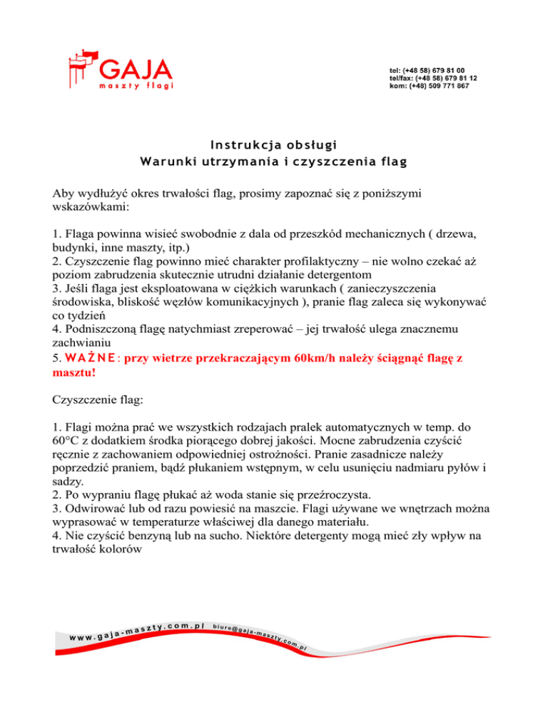 In stru k cja ob słu gi Warun ki utrzy m a nia i czy sz czenia fla g Aby wydłużyć okres trwałości flag, prosimy zapoznać się z poniższymi wskazówkami: 1. Flaga powinna wisieć swobodnie z dala od przeszkód mechanicznych ( drzewa, budynki, inne maszty, itp.) 2. Czyszczenie flag powinno mieć charakter profilaktyczny – nie wolno czekać aż poziom zabrudzenia skutecznie utrudni działanie detergentom 3. Jeśli flaga jest eksploatowana w ciężkich warunkach ( zanieczyszczenia środowiska, bliskość węzłów komunikacyjnych ), pranie flag zaleca się wykonywać co tydzień 4. Podniszczoną flagę natychmiast zreperować – jej trwałość ulega znacznemu zachwianiu 5. W A Ż N E : przy wietrze przekraczającym 60km/h należy ściągnąć flagę z masztu! Czyszczenie flag: 1. Flagi można prać we wszystkich rodzajach pralek automatycznych w temp. do 60°C z dodatkiem środka piorącego dobrej jakości. Mocne zabrudzenia czyścić ręcznie z zachowaniem odpowiedniej ostrożności. Pranie zasadnicze należy poprzedzić praniem, bądź płukaniem wstępnym, w celu usunięciu nadmiaru pyłów i sadzy. 2. Po wypraniu flagę płukać aż woda stanie się przeźroczysta. 3. Odwirować lub od razu powiesić na maszcie. Flagi używane we wnętrzach można wyprasować w temperaturze właściwej dla danego materiału. 4. Nie czyścić benzyną lub na sucho. Niektóre detergenty mogą mieć zły wpływ na trwałość kolorów