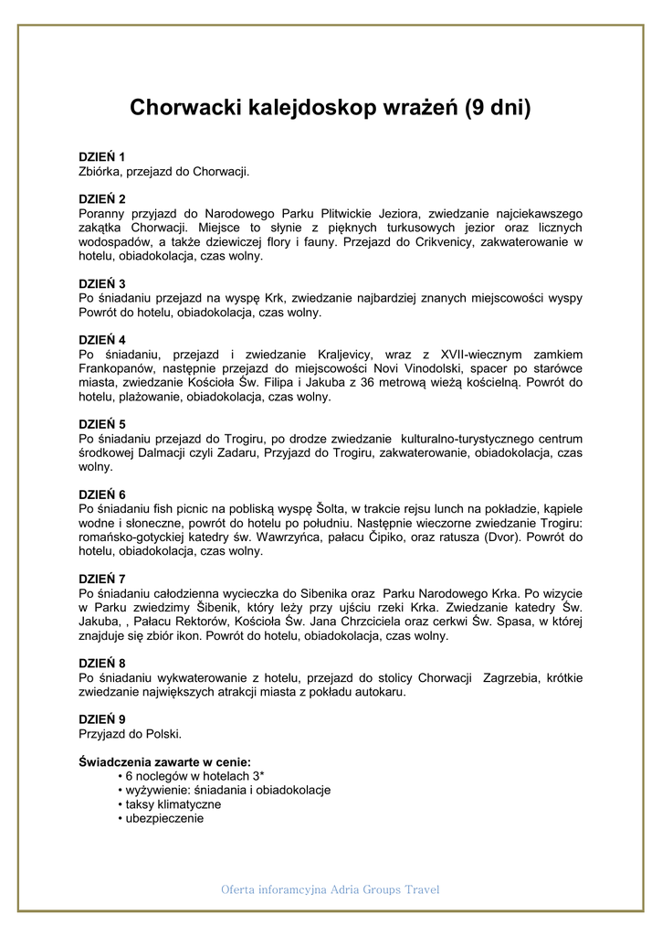 Chorwacki kalejdoskop wrażeń (9 dni) DZIEŃ 1 Zbiórka, przejazd do Chorwacji. DZIEŃ 2 Poranny przyjazd do Narodowego Parku Plitwickie Jeziora, zwiedzanie najciekawszego zakątka Chorwacji. Miejsce to słynie z pięknych turkusowych jezior oraz licznych wodospadów, a także dziewiczej flory i fauny. Przejazd do Crikvenicy, zakwaterowanie w hotelu, obiadokolacja, czas wolny. DZIEŃ 3 Po śniadaniu przejazd na wyspę Krk, zwiedzanie najbardziej znanych miejscowości wyspy Powrót do hotelu, obiadokolacja, czas wolny. DZIEŃ 4 Po śniadaniu, przejazd i zwiedzanie Kraljevicy, wraz z XVII-wiecznym zamkiem Frankopanów, następnie przejazd do miejscowości Novi Vinodolski, spacer po starówce miasta, zwiedzanie Kościoła Św. Filipa i Jakuba z 36 metrową wieżą kościelną. Powrót do hotelu, plażowanie, obiadokolacja, czas wolny. DZIEŃ 5 Po śniadaniu przejazd do Trogiru, po drodze zwiedzanie kulturalno-turystycznego centrum środkowej Dalmacji czyli Zadaru, Przyjazd do Trogiru, zakwaterowanie, obiadokolacja, czas wolny. DZIEŃ 6 Po śniadaniu fish picnic na pobliską wyspę Šolta, w trakcie rejsu lunch na pokładzie, kąpiele wodne i słoneczne, powrót do hotelu po południu. Następnie wieczorne zwiedzanie Trogiru: romańsko-gotyckiej katedry św. Wawrzyńca, pałacu Čipiko, oraz ratusza (Dvor). Powrót do hotelu, obiadokolacja, czas wolny. DZIEŃ 7 Po śniadaniu całodzienna wycieczka do Sibenika oraz Parku Narodowego Krka. Po wizycie w Parku zwiedzimy Šibenik, który leży przy ujściu rzeki Krka. Zwiedzanie katedry Św. Jakuba, , Pałacu Rektorów, Kościoła Św. Jana Chrzciciela oraz cerkwi Św. Spasa, w której znajduje się zbiór ikon. Powrót do hotelu, obiadokolacja, czas wolny. DZIEŃ 8 Po śniadaniu wykwaterowanie z hotelu, przejazd do stolicy Chorwacji Zagrzebia, krótkie zwiedzanie największych atrakcji miasta z pokładu autokaru. DZIEŃ 9 Przyjazd do Polski. Świadczenia zawarte w cenie: • 6 noclegów w hotelach 3* • wyżywienie: śniadania i obiadokolacje • taksy klimatyczne • ubezpieczenie Oferta inforamcyjna Adria Groups Travel Cena od: 215 €/os Do ceny dolicz: • bilety wstępu oraz wycieczki w trakcie pobytu ok. 90 €/os • miejscowych przewodników ok. 12 €/os • pilota • transport Oferta inforamcyjna Adria Groups Travel