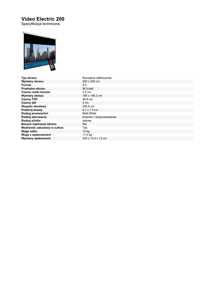 Video Electric 200 Specyfikacja techniczna Typ ekranu Wymiary ekranu Format Przekątna obrazu Czarne ramki boczne Wymiary obrazu Czarny TOP Czarny dół Długość obudowy Przekrój kasety Rodzaj powierzchni Rodzaj sterowania Rodzaj silnika Boczne napinacze ekranu Możliwość zabudowy w suficie Waga netto Waga z opakowaniem Wymiary opakowania Rozwijany elektrycznie 200 x 200 cm 4:3 96 [cale] 2.5 cm 195 x 146.2 cm 48.8 cm 5 cm 205.8 cm 6.7 x 7.5 cm Matt White ścienne + bezprzewodowe tubowy Nie Tak 10 kg 11.4 kg 235 x 13.5 x 13 cm