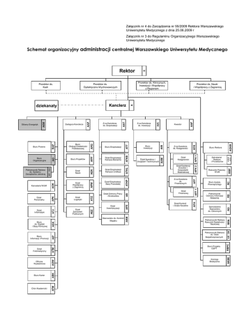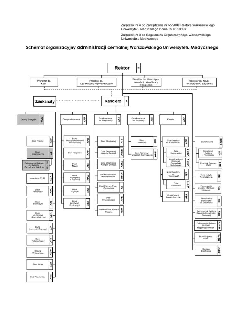Załącznik nr 4 do Zarządzenia nr 55/2009 Rektora Warszawskiego Uniwersytetu Medycznego z dnia 25.06.2009 r Załącznik nr 3 do Regulaminu Organizacyjnego Warszawskiego Uniwersytetu Medycznego Rektor ABK Chór Akademicki Samodzielne Stanowisko ds. Obronnych Pełnomocnik Rektora Rzecznik Rzetelności Naukowej Pełnomocnik Rektora ds. Osób Niepełnosprawnych Biuro Projektu CEPT Komisja Bioetyczna AOKR 1/2/3 RRP RC RD Pełnomocnik Ochrony Informacji Niejawnej RO Dział Kontroli i Analiz Kosztów AFF 1 Dział Finansowy Biuro Audytu Wewnętrznego RRN Rzecznik Prasowy WUM AR - ON Dział Ewidencji Kosztów i Gospodarki Materiałowej Z-ca Kwestora ds. Finansowych AOKR AAF AFK Sekretariat Rektora i Prorektorów AFF Dział Księgowości AFK 1 Biuro Rektora AFK 2 Z-ca Kwestora ds. Księgowości AFA AAI AIB ATT ATKB ATKL ATKP AB Stanowisko ds. Kontroli Majątku AAM AAP APD APP Dział Inwentaryzacji AFE AOK APK ATJ Biuro Karier ATM Oficyna Wydawnicza Dział Zamówień Publicznych Dział Ochrony Pracy i Środowiska Kwestor RBPC Dział Fotomedyczny Dział Logistyki Dział Eksploatacji Kampus Lindleya Dział Eksploatacji Bazy Pozostałej Prorektor ds. Nauki i Współpracy z Zagranicą AKBE Biuro Informacji i Promocji Dział Współpracy z Zagranicą Dział Aparatury i Urządzeń Technicznych AKM Biuro ds. Szpitali i Bazy Klinicznej ASK Dział Informatyki AIP Dział Personalny ATM Kancelaria WUM Dział Nauki AOW Pełnomocnik Rektora ds. Systemu Zarządzania Jakością Dział Eksploatacji Kampus Banacha AEN AO Biuro Projektów Biuro Inwestycji APW Biuro Organizacyjne Z-ca Kanclerza ds. Inwestycji Biuro Eksploatacji ATZ RAP Biuro Obsługi Działalności Podstawowej AR - ISO Biuro Prawne Z-ca Kanclerza ds. Eksploatacji AEZ AGE Zastępca Kanclerza AAT Kanclerz dziekanaty Główny Energetyk Prorektor ds. Klinicznych, Inwestycji i Współpracy z Regionem Prorektor ds. Dydaktyczno-Wychowawczych A Prorektor ds. Kadr R Schemat organizacyjny administracji centralnej Warszawskiego Uniwersytetu Medycznego