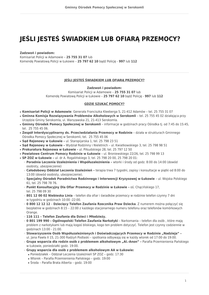Gminny Ośrodek Pomocy Społecznej w Serokomli JEŚLI JESTEŚ ŚWIADKIEM LUB OFIARĄ PRZEMOCY? Zadzwoń i powiadom: Komisariat Policji w Adamowie – 25 755 31 07 lub Komendę Powiatową Policji w Łukowie – 25 797 62 10 bądź Policję - 997 lub 112 JEŚLI JESTEŚ ŚWIADKIEM LUB OFIARĄ PRZEMOCY? Zadzwoń i powiadom: Komisariat Policji w Adamowie – 25 755 31 07 lub Komendę Powiatową Policji w Łukowie – 25 797 62 10 bądź Policję - 997 lub 112 GDZIE SZUKAĆ POMOCY? ● ● ● ● ● ● ● ● ● Komisariat Policji w Adamowie: Generała Franciszka Kleeberga 5, 21-412 Adamów – tel. 25 755 31 07 Gminna Komisja Rozwiązywania Problemów Alkoholowych w Serokomli – tel. 25 755 45 02 działająca przy Urzędzie Gminy Serokomla, ul. Warszawska 21, 21-413 Serokomla. Gminny Ośrodek Pomocy Społecznej w Serokomli – informacje w godzinach pracy Ośrodka tj. od 7:45 do 15:45, tel. 25 755 45 06. Zespół Interdyscyplinarny ds. Przeciwdziałania Przemocy w Rodzinie – działa w strukturach Gminnego Ośrodka Pomocy Społecznej w Serokomli, tel. 25 755 45 06 Sąd Rejonowy w Łukowie – ul. Staropijarska 1, tel. 25 798 23 51 Sąd Rejonowy w Łukowie – Wydział Rodzinny i Nieletnich – ul. Kwiatkowskiego 3, tel. 25 798 98 51 Prokuratura Rejonowa w Łukowie - ul. Piłsudskiego 28, tel. 25 797 12 50 Powiatowe Centrum Pomocy Rodzinie w Łukowie – ul. Broniewskiego 22/26, tel. 25 798 99 13 SP ZOZ w Łukowie – ul. dr A. Rogalińskiego 3, tel. 25 798 20 00, 25 798 20 01: Poradnia Leczenia Uzależnienia i Współuzależnienia – wtorki i środy od godz. 8:00 do 14:00 (dowód osobisty, ubezpieczenie) Całodobowy Oddział Leczenia Uzależnień – terapia trwa 7 tygodni, zapisy i konsultacje w piątki od 8:00 do 13:00 (dowód osobisty, ubezpieczenie). Specjalny Ośrodek Poradnictwa Rodzinnego i Interwencji Kryzysowej w Łukowie – ul. Wojska Polskiego 61, tel. 25 798 78 76. Punkt Konsultacyjny Dla Ofiar Przemocy w Rodzinie w Łukowie – oś. Chącińskiego 17, tel. 25 798 09 30 801 12 00 02 Niebieska Linia – telefon dla ofiar i świadków przemocy w rodzinie telefon czynny 7 dni w tygodniu w godzinach 10:00 -22:00. 0 800 12 12 12 – Dziecięcy Telefon Zaufania Rzecznika Praw Dziecka. Z numerem można połączyć się bezpłatnie w godzinach 8:15 – 22:00 z każdego stacjonarnego numeru telefonu oraz telefonów komórkowych Orange. 116 111 – Telefon Zaufania dla Dzieci i Młodzieży. 0 801 199 990 – Ogólnopolski Telefon Zaufania Narkotyki – Narkomania – telefon dla osób , które mają problem z narkotykami lub mają kogoś bliskiego, kogo ten problem dotyczyć. Telefon jest czynny codziennie w godzinach 13:00 - 21:00. Stowarzyszenie Osób Współuzależnionych i Doświadczających Przemocy w Rodzinie „Nadzieja” – ul. Jana Pawła II 15, 21-300 Radzyń Podlaski – spotkania odbywają się w każdy wtorek od 17:00 do 19:00. Grupa wsparcia dla rodzin osób z problemem alkoholowym „Al.-Anon” – Parafia Przemienienia Pańskiego w Łukowie, poniedziałki godz. 19:00. Grupy wsparcia dla osób z problemem alkoholowym AA w Łukowie: Poniedziałek – Oddział Leczenia Uzależnień SP ZOZ – godz. 17:30 Wtorek – Parafia Przemienienia Pańskiego – godz. 19:00 Środa – Parafia Brata Alberta – godz. 19:00 ❍ ❍ ❍ ❍ ❍ ❍ ❍ ❍ ❍ ❍ ❍ ■ ■ ■ 1 Gminny Ośrodek Pomocy Społecznej w Serokomli ■ ■ ■ ■ ■ Czwartek – Parafia Podwyższenia Krzyża Świętego – godz. 19:00 Piątek – Parafia Przemienienia Pańskiego – godz. 19:00 Niedziela – Klub Abstynenta przy szpitalu – godz. 17:00. Grupy Wsparcia AA – „Przystań” – Wojcieszków – godz. 18:00. Policyjny Telefon Zaufania – tel. 800 120 226 (linia bezpłatna przy połączeniu z telefonów stacjonarnych, czynna codziennie w godz. 9:30 – 15:3, od godz. 15:30 do 9:30 włączony jest automat) 2