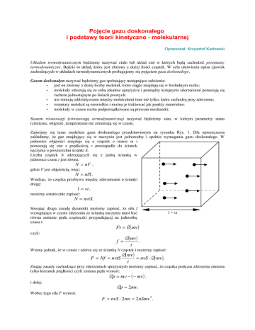Pojęcie gazu doskonałego i podstawy teorii kinetyczno - molekularnej Opracował: Krzysztof Kadowski Układem termodynamicznym będziemy nazywać ciało lub układ ciał w których będą zachodzić przemiany termodynamiczne. Będzie to układ, który jest złożony z dużej ilości cząstek. W celu ułatwienia opisu zjawisk zachodzących w układach termodynamicznych posługujemy się pojęciem gazu doskonałego. Gazem doskonałym nazywać będziemy gaz spełniający następujące założenia: - jest on złożony z dużej liczby molekuł, które ciągle znajdują się w bezładnym ruchu; - molekuły zderzają się ze sobą idealnie sprężyście i pomiędzy kolejnymi zderzeniami poruszają się ruchem jednostajnym po liniach prostych; - nie istnieją oddziaływania między molekułami inne niż tylko, które zachodzą przy zderzeniu; - rozmiary molekuł są niewielkie i można je traktować jak punkty materialne; - molekuły w czasie ruchu podporządkowane są prawom mechaniki; Stanem równowagi (równowagą termodynamiczną) nazywać będziemy stan, w którym parametry stanu (ciśnienie, objętość, temperatura) nie zmieniają się w czasie. Zajmijmy się teraz modelem gazu doskonałego przedstawionym na rysunku Rys. 1. Dla uproszczenia zakładamy, że gaz znajdujący się w naczyniu jest jednorodny i spełnia wymagania gazu doskonałego. W jednostce objętości znajduje się n cząstek o masie m i poruszają się one z prędkością v prostopadle do ścianek naczynia o powierzchni ścianki S. Liczba cząstek N zderzających się z jedną ścianką w jednostce czasu t jest równa: N = nV , gdzie V jest objętością, więc: N = nlS . Wiedząc, że cząstka przebywa między zderzeniami o ścianki drogę: l = vt , możemy ostatecznie zapisać: N = nvtS . Stosując druga zasadę dynamiki możemy zapisać, że siła f występująca w czasie zderzenia ze ścianką naczynia musi być równa zmianie pędu cząsteczki przypadającej na jednostkę czasu t: l = vt Ft = ∆( mv ) czyli: f = ∆( mv ) . t Wiemy jednak, że w czasie t zderza się ze ścianką N cząstek i możemy zapisać: F = Nf = nvtS ∆( mv ) = nvS ⋅ ∆( mv ). t Znając zasady zachodzące przy zderzeniach sprężystych możemy zapisać, że cząstka podczas zderzenia zmienia tylko kierunek prędkości czyli zmiana pędu wynosi: ∆p = mv − ( − mv ) , i dalej: ∆p = 2mv. Wobec tego siła F wynosi: F = nvS ⋅ 2mv = 2nSmv 2 . Wiedząc, że ciśnienie jest to stosunek siły jaka działa na jednostkę powierzchni, możemy zapisać: p= F = 2nmv 2 . S Powyższy opis musimy uogólnić. Wiemy, przecież, że cząstki gazu poruszają się bezładnie i nie wszystkie docierają w jednakowym czasie do ścianki naczynia. Poruszają się one również z różnymi prędkościami. W związku z tym będziemy się posługiwać wartością średnią kwadratu prędkości: v12 + v 22 + v32 + ... + v N2 , v = N 2 która jest sumą kwadratów prędkości poszczególnych cząstek dzieloną przez ich ilość. Drugą wielkością będzie prędkość średnia kwadratowa, która jest pierwiastkiem kwadratowym ze średniej kwadratu prędkości: v śr .kw, = v 2 . Zakładając teraz, że nie ma uprzywilejowanego kierunku ruchu cząstek i w danym kierunku porusza się jedna szósta wszystkich N cząstek możemy zapisać: p= 2nmv 2 , 6 p= 2 mv 2 n . 3 2 lub inaczej: Wynika z tych zapisów, że ciśnienie wywierane przez gaz zależy od średniej energii kinetycznej cząstek i od ich liczby: p= 2 nEk , 3 lub: p= 2 N ⋅ Ek . 3 V Otrzymany wzór jest podstawową zależnością teorii kinetyczno – molekularnej gazów. Domyślamy się już, że energia kinetyczna gazu będzie zależała od temperatury bezwzględnej tego gazu: Ek = C, T gdzie C wynosi: C = 2,07 ⋅ 10 − 23 J . K Możemy więc powiedzieć: Temperatura jest miarą średniej energii kinetycznej ruchu postępowego cząstek gazu. Możemy już teraz zapisać zależność między wyżej obliczonym ciśnieniem gazu a temperaturą: p= 2 NC ⋅ T, 3 V lub: pV 2 = CN . T 3 Dwie trzecie C nazywać będziemy stała Boltzmanna: k= 2 J C = 1,38 ⋅ 10 −23 . 3 K Podstawiając otrzymujemy równanie stanu gazu doskonałego: pV = Nk . T Z równania tego można wywnioskować, że dla danej liczby cząstek gazu iloczyn ciśnienia i objętości podzielony przez jego temperaturę bezwzględną jest stały: pV = const. T Jeśli będziemy się posługiwać 1 molem, jako jednostką ilości substancji, to wiemy, że w warunkach normalnych znajduje się w nim liczba cząstek równa: N = N 0 = 6,023 ⋅ 10 23. Możemy więc zapisać: pV = N 0k, T lub: pV J = 8,31 T K. Dla n moli będziemy mieli: Liczbę R będziemy nazywać stałą gazową: pV J = n ⋅ 8,31 . T mol ⋅ K R = 8,31 J mol ⋅ K . Wiedząc teraz, że liczbę moli gazu obliczamy dzieląc masę m gazu przez jego masę cząsteczkową µ możemy zapisać równanie Clapeyrona: pV = m RT . µ