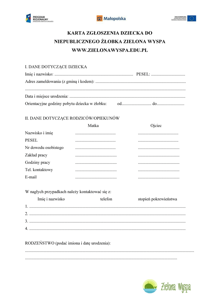 KARTA ZGŁOSZENIA DZIECKA DO NIEPUBLICZNEGO ŻŁOBKA ZIELONA WYSPA WWW.ZIELONAWYSPA.EDU.PL I. DANE DOTYCZĄCE DZIECKA Imię i nazwisko: .......................................................................... PESEL: ................................ Adres zameldowania (z gminą i kodem): ..................................................................................... ....................................................................................................................................................... Data i miejsce urodzenia: ............................................................................................................. Orientacyjne godziny pobytu dziecka w żłobku: od............................ do.......................... II. DANE DOTYCZĄCE RODZICÓW/OPIEKUNÓW Matka Ojciec Nazwisko i imię ...................................... ...................................... PESEL ...................................... ...................................... Nr dowodu osobistego ...................................... ....................................... Zakład pracy ....................................... ....................................... Godziny pracy ....................................... ....................................... Tel. kontaktowy ....................................... ....................................... E-mail ....................................... ....................................... W nagłych przypadkach należy kontaktować się z: Imię i nazwisko telefon stopień pokrewieństwa 1. ................................................................................................................................................... 2. ................................................................................................................................................... 3. ................................................................................................................................................... 4. ................................................................................................................................................... RODZEŃSTWO (podać imiona i datę urodzenia): ............................................................................................................................................................... ............................................................................................................................................... RODZINA: pełna / niepełna III. ZOBOWIĄZUJĘ SIĘ DO: Przestrzegania postanowień statutu żłobka. Podawania do wiadomości żłobka jakichkolwiek zmian w podanych wyżej informacjach. Regularnego uiszczania opłat za żłobek z góry do 10-ego każdego miesiąca. Przyprowadzania i odbierania dziecka ze żłobka osobiście lub przez osobę dorosłą zgłoszoną nauczycielce na piśmie, zapewniającą dziecku bezpieczeństwo. Przyprowadzania do żłobka tylko zdrowego dziecka. IV. OSOBY UPOWAŻNIONE DO ODBIERANIA DZIECKA Imię i nazwisko Nr dowodu osobistego stopień pokrewieństwa .................................... ................................................. ....................................... .................................... ................................................. ....................................... .................................... ................................................. ....................................... ..................................... .................................................. ....................................... Zgodnie z Zarządzeniem MEN nr 5 z dnia 18.03.1993r. w sprawie sposobu prowadzenia przez publiczne placówki oświatowe dokumentacji przebiegu nauczania (Dz. Urz. MEN nr 4/93 poz. 12) są zebrane w celu szybkiego kontaktu w nagłych okolicznościach oraz poznania sytuacji rodzinnej dziecka. Są udostępnione tylko nauczycielom przedszkola, którzy są zobowiązani do zachowania tajemnicy służbowej. Na zebranie powyższych danych o dziecku i jego rodzinie wyrażam zgodę. Data ............................... Podpis czytelny matki: .......................................................... ojca:.............................................