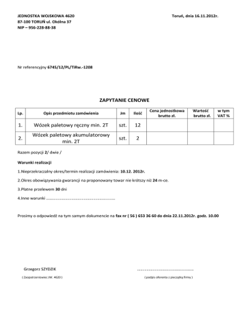 JEDNOSTKA WOJSKOWA 4620 87-100 TORUŃ ul. Okólna 37 NIP – 956-228-88-38 Toruń, dnia 16.11.2012r. Nr referencyjny 6745/12/PL/TiRw.-1208 ZAPYTANIE CENOWE Lp. Opis przedmiotu zamówienia Jm Ilość 1. Wózek paletowy ręczny min. 2T szt. 12 2. Wózek paletowy akumulatorowy min. 2T szt. 2 Cena jednostkowa brutto zł. Wartość brutto zł. w tym VAT % Razem pozycji 2/ dwie / Warunki realizacji 1.Nieprzekraczalny okres/termin realizacji zamówienia: 10.12. 2012r. 2.Okres obowiązywania gwarancji na proponowany towar nie krótszy niż 24 m-ce. 3.Płatne przelewem 30 dni 4.Inne warunki ………………………………………………………… Prosimy o odpowiedź na tym samym dokumencie na fax nr ( 56 ) 653 36 60 do dnia 22.11.2012r. godz. 10.00 Grzegorz SZYDZIK ( Zaopatrzeniowiec JW. 4620 ) ……………………………………………… ( podpis oferenta z pieczątką firmy )