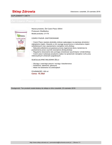 Sklep Zdrowia Utworzono: czwartek, 23 czerwiec 2016 SUPLEMENTY DIETY Żel Czarci Pazur 200ml Nazwa produktu: Żel Czarci Pazur 200ml Producent: EkaMedica Model produktu: 21175 CZARCI PAZUR- ZASTOSOWANIE Czarci Pazur zawiera ekstrakty ziołowe wpływające na poprawę ukrwienia i odprężenie mięśni. Zawarte w nim wyciągi są pomocne w rozluźnianiu mięśni szkieletowych oraz usprawnianiu narządow ruchu. Naturalna allantoina przyspiesza proces regeneracji skory narażonej na podrażnienia przez czynniki zewnętrzne. Regularne stosowanie żelu pomaga zniwelować opuchnięcia i siniaki. Czarci pazur wykazuje pozytywny wpływ na sprawność narządow ruchu przy niekorzystnych zmianach pogodowych. GŁÓWNE SKŁADNIKI ŻELU: Wyciąg z czarciego pazura i wyciąg z kasztanowca Panthenol, allantoina, gliceryna Maść nie testowana na zwierzętach POJEMNOŚĆ- 200 ml Cena: 15.30zł Dostępność: Ten produkt został dodany do sklepu w dniu czwartek, 23 czerwiec 2016 http://www.sklep-zdrowia.eu | [email protected] | | Strona 1/1