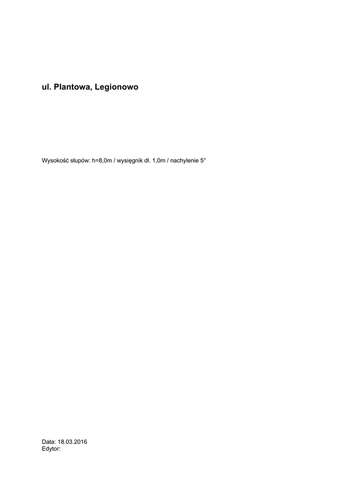 ul. Plantowa, Legionowo Wysokość słupów: h=8,0m / wysięgnik dł. 1,0m / nachylenie 5° Data: 18.03.2016 Edytor: ul. Plantowa, Legionowo 18.03.2016 Edytor Telefon faks e-Mail Spis treści ul. Plantowa, Legionowo Strona tytułowa projektu Spis treści Ulica 1 Dane planowania Lista opraw Wyniki szczegółowe Pola oszacowania Pole oszacowania Jezdnia 1 Izolinie (E) Pole oszacowania Chodnik 1 Izolinie (E) 1 2 3 4 5 7 8 Strona 2 ul. Plantowa, Legionowo 18.03.2016 Edytor Telefon faks e-Mail Ulica 1 / Dane planowania Profil ulicy Chodnik 1 Jezdnia 1 (Szerokość: 2.500 m) (Szerokość: 6.500 m, Liczba pasów jezdni: 2, Nawierzchnia: R3, q0: 0.070) Współczynnik konserwacji: 0.80 Rozmieszczenia opraw Oprawa: Strumień świetlny (Oprawa): Strumień świetlny (Lampy): Moc opraw: Rozmieszczenie: Odstęp słupa: Wysokość montażu (1): Wysokość punktu świetlnego: Nawis (2): Nachylenie wysięgnika (3): Długość wysięgnika (4): SCHREDER AMBAR 2 / 2005 / HPS 70W / 280744 5085 lm Wartości maksymalne mocy oświetleniowej 6600 lm przy 70°: 392 cd/klm przy 80°: 123 cd/klm 70.0 W jednostronnie u góry przy 90°: 7.40 cd/klm W każdym kierunku tworzącym podany kąt z dolną linią pionową przy 35.000 m zainstalowanym i gotowym do użytku oświetleniu. 8.000 m 8.010 m Rozmieszczenie spełnia wymagania klasy mocy 0.230 m oświetleniowej G2. 5.0 ° Rozmieszczenie spełnia wymagania klasy indeksu 1.000 m oślepiania D.6. Strona 3 ul. Plantowa, Legionowo 18.03.2016 Edytor Telefon faks e-Mail Ulica 1 / Lista opraw SCHREDER AMBAR 2 / 2005 / HPS 70W / 280744 Numer artykułu: Strumień świetlny (Oprawa): 5085 lm Strumień świetlny (Lampy): 6600 lm Moc opraw: 70.0 W Klasyfikacja oświetleń CIE: 100 Kod Flux CIE: 44 74 96 100 77 Wyposażenie: 1 x HPS 70W (Czynnik korekcyjny 1.000). Strona 4 ul. Plantowa, Legionowo 18.03.2016 Edytor Telefon faks e-Mail Ulica 1 / Wyniki szczegółowe Współczynnik konserwacji: 0.80 Skala 1:294 Lista pól oszacowania 1 Pole oszacowania Jezdnia 1 Długość: 35.000 m, Szerokość: 6.500 m Siatka: 12 x 6 Punkty Przynależne elementy uliczne: Jezdnia 1. Nawierzchnia: R3, q0: 0.070 Wybrana klasa oświetleniowa: ME5 Wartości rzeczywiste według obliczenia: Wartości zadane według klasy: Spełnione/nie spełnione: (Wszystkie wymagania fotometryczne zostały spełnione.) Lm [cd/m²] 0.60 ≥ 0.50 U0 0.35 ≥ 0.35 Ul 0.68 ≥ 0.40 TI [%] 13 ≤ 15 SR 0.52 ≥ 0.50 Strona 5 ul. Plantowa, Legionowo 18.03.2016 Edytor Telefon faks e-Mail Ulica 1 / Wyniki szczegółowe Lista pól oszacowania 2 Pole oszacowania Chodnik 1 Długość: 35.000 m, Szerokość: 2.500 m Siatka: 12 x 3 Punkty Przynależne elementy uliczne: Chodnik 1. Wybrana klasa oświetleniowa: S4 (Wszystkie wymagania fotometryczne zostały spełnione.) Wartości rzeczywiste według obliczenia: Wartości zadane według klasy: Spełnione/nie spełnione: Em [lx] 6.35 ≥ 5.00 Emin [lx] 2.35 ≥ 1.00 Strona 6 ul. Plantowa, Legionowo 18.03.2016 Edytor Telefon faks e-Mail Ulica 1 / Pole oszacowania Jezdnia 1 / Izolinie (E) Wartości Lux, Skala 1 : 294 Siatka: 12 x 6 Punkty Em [lx] 8.59 Emin [lx] 3.24 Emax [lx] 22 Emin / Em 0.377 Emin / Emax 0.147 Strona 7 ul. Plantowa, Legionowo 18.03.2016 Edytor Telefon faks e-Mail Ulica 1 / Pole oszacowania Chodnik 1 / Izolinie (E) Wartości Lux, Skala 1 : 294 Siatka: 12 x 3 Punkty Em [lx] 6.35 Emin [lx] 2.35 Emax [lx] 15 Emin / Em 0.370 Emin / Emax 0.154 Strona 8