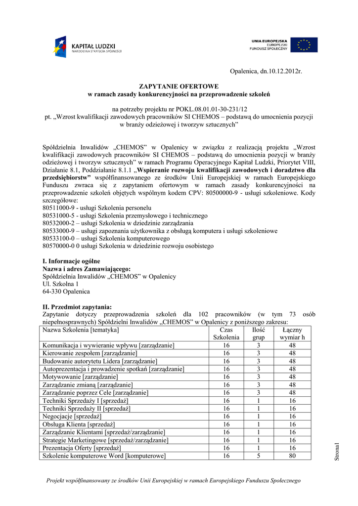 Opalenica, dn.10.12.2012r. ZAPYTANIE OFERTOWE w ramach zasady konkurencyjności na przeprowadzenie szkoleń na potrzeby projektu nr POKL.08.01.01-30-231/12 pt. „Wzrost kwalifikacji zawodowych pracowników SI CHEMOS – podstawą do umocnienia pozycji w branŜy odzieŜowej i tworzyw sztucznych” Spółdzielnia Inwalidów „CHEMOS” w Opalenicy w związku z realizacją projektu „Wzrost kwalifikacji zawodowych pracowników SI CHEMOS – podstawą do umocnienia pozycji w branŜy odzieŜowej i tworzyw sztucznych” w ramach Programu Operacyjnego Kapitał Ludzki, Priorytet VIII, Działanie 8.1, Poddziałanie 8.1.1 „Wspieranie rozwoju kwalifikacji zawodowych i doradztwo dla przedsiębiorstw” współfinansowanego ze środków Unii Europejskiej w ramach Europejskiego Funduszu zwraca się z zapytaniem ofertowym w ramach zasady konkurencyjności na przeprowadzenie szkoleń objętych wspólnym kodem CPV: 80500000-9 - usługi szkoleniowe. Kody szczegółowe: 80511000-9 - usługi Szkolenia personelu 80531000-5 - usługi Szkolenia przemysłowego i technicznego 80532000-2 – usługi Szkolenia w dziedzinie zarządzania 80533000-9 – usługi zapoznania uŜytkownika z obsługą komputera i usługi szkoleniowe 80533100-0 – usługi Szkolenia komputerowego 80570000-0 0 usługi Szkolenia w dziedzinie rozwoju osobistego II. Przedmiot zapytania: Zapytanie dotyczy przeprowadzenia szkoleń dla 102 pracowników (w tym 73 osób niepełnosprawnych) Spółdzielni Inwalidów „CHEMOS” w Opalenicy z poniŜszego zakresu: Nazwa Szkolenia [tematyka] Czas Ilość Łączny Szkolenia grup wymiar h Komunikacja i wywieranie wpływu [zarządzanie] 16 3 48 Kierowanie zespołem [zarządzanie] 16 3 48 Budowanie autorytetu Lidera [zarządzanie] 16 3 48 Autoprezentacja i prowadzenie spotkań [zarządzanie] 16 3 48 Motywowanie [zarządzanie] 16 3 48 Zarządzanie zmianą [zarządzanie] 16 3 48 Zarządzanie poprzez Cele [zarządzanie] 16 3 48 Techniki SprzedaŜy I [sprzedaŜ] 16 1 16 Techniki SprzedaŜy II [sprzedaŜ] 16 1 16 Negocjacje [sprzedaŜ] 16 1 16 Obsługa Klienta [sprzedaŜ] 16 1 16 Zarządzanie Klientami [sprzedaŜ/zarządzanie] 16 1 16 Strategie Marketingowe [sprzedaŜ/zarządzanie] 16 1 16 Prezentacja Oferty [sprzedaŜ] 16 1 16 Szkolenie komputerowe Word [komputerowe] 16 5 80 Projekt współfinansowany ze środków Unii Europejskiej w ramach Europejskiego Funduszu Społecznego Strona1 I. Informacje ogólne Nazwa i adres Zamawiającego: Spółdzielnia Inwalidów „CHEMOS” w Opalenicy Ul. Szkolna 1 64-330 Opalenica Szkolenie komputerowe Excel [komputerowe] Szkolenie komputerowe Power Point [komputerowe] Szkolenie Zarządzanie Produkcją [techniczne] Komunikacja zespołowa i adaptacyjność do zmian [rozwoju osobistego] 32 16 32 16 5 5 1 8 160 80 32 128 RAZEM 928 III. Wymogi formalne: 1. Oferta szkoleniowa musi zawierać: a) Proponowany ramowy program kaŜdego Szkolenia wymienionego w przedmiocie zapytania. b) Cenę za jeden dzień Szkolenia (1 dzień Szkolenia = 8h) dla kaŜdego Szkolenia osobno z wymienionych w Przedmiocie zapytania szkoleń. Podana cena 1 dnia szkoleniowego musi zawierać: − opracowanie programu szkolenia dostosowanego do indywidualnych potrzeb SI „CHEMOS” w Opalenicy uwzględniający specyfikę firmy − wizyty wstępne w SI „CHEMOS” w Opalenicy, niezbędne do merytorycznego opracowania programu szkolenia − koszt przeprowadzenia szkolenia (wynagrodzenie trenera, nocleg, dojazd, wyŜywienie); − koszt materiałów szkoleniowych (techniczne przygotowanie skryptów, długopisy oznakowane zgodnie z wytycznymi POKL, dyplomy dla uczestników, itp.); − koszt opracowania i przeprowadzenia testów wiedzy wśród uczestników szkolenia przed i po szkoleniu, mających na celu pomiar wskaźników rezultatów oraz przygotowanie raportu z osiągniętych wyników; c) Łączną cenę za wszystkie oferowane Szkolenia. d) Opis doświadczenia Oferenta e) CV trenerów, którzy realizowali będą poszczególne Szkolenia. f) Oświadczenie o braku powiązań kapitałowych i osobowych z Zamawiającym (wzór w załączeniu). Projekt współfinansowany ze środków Unii Europejskiej w ramach Europejskiego Funduszu Społecznego Strona2 Czas szkolenia: Szkolenia odbywać się będą w okresie od stycznia 2013r. do listopada 2014 roku. Liczebność grup szkoleniowych: od 7 do 15 osób Miejsce i forma przeprowadzenia szkolenia: Szkolenia realizowane będą w siedzibie Spółdzielni Inwalidów „CHEMOS” w Opalenicy. Oferent zobowiązany jest do: − przeprowadzenia Szkolenia w terminie wskazanym przez Zamawiającego w dni robocze, − opracowania programów szkoleń dostosowanych do specyfiki branŜy i Zamawiającego oraz jego indywidualnych potrzeb, − technicznego przygotowania i dostarczenia materiałów szkoleniowych, − prowadzenia monitoringu nabytej wiedzy i umiejętności z zakresu odbytego szkolenia poprzez przygotowanie i przeprowadzenie testów wiedzy przed i po szkoleniu oraz ankiety oceny Szkolenia − zapewnienia noclegów i wyŜywienia dla trenerów prowadzących szkolenie − przygotowania raportu zbiorczego z osiągniętych wyników przez uczestników szkolenia. Metody szkolenia: Szkolenia prowadzone w formie interaktywnej w oparciu o realne sytuacje z pracy na podstawie analizy potrzeb: − Wykłady − ćwiczenia, − dyskusje − analiza studium przypadków g) Zamawiający dopuszcza moŜliwość składania ofert częściowych, tj. na wybrane tematy wskazane w Przedmiocie zapytania. 2. Termin i sposób składania ofert: Ofertę moŜna składać w terminie od 10.12.2012r. do 24.12.2012r. Termin składania ofert mija dnia 24.12.2012r. o godzinie 1200. Ofertę naleŜy przesłać pocztą lub dostarczyć osobiście na adres ul. Szkolna 1; 64-330 Opalenica oraz obligatoryjnie przesłać drogą elektroniczną (w formie skanu dokumentów) na adres [email protected]. Osobą uprawnioną do kontaktu jest Halina Werner, Tel. 61/44-77-351. IV. Wymagania wobec wykonawcy: 1. Posiadanie doświ