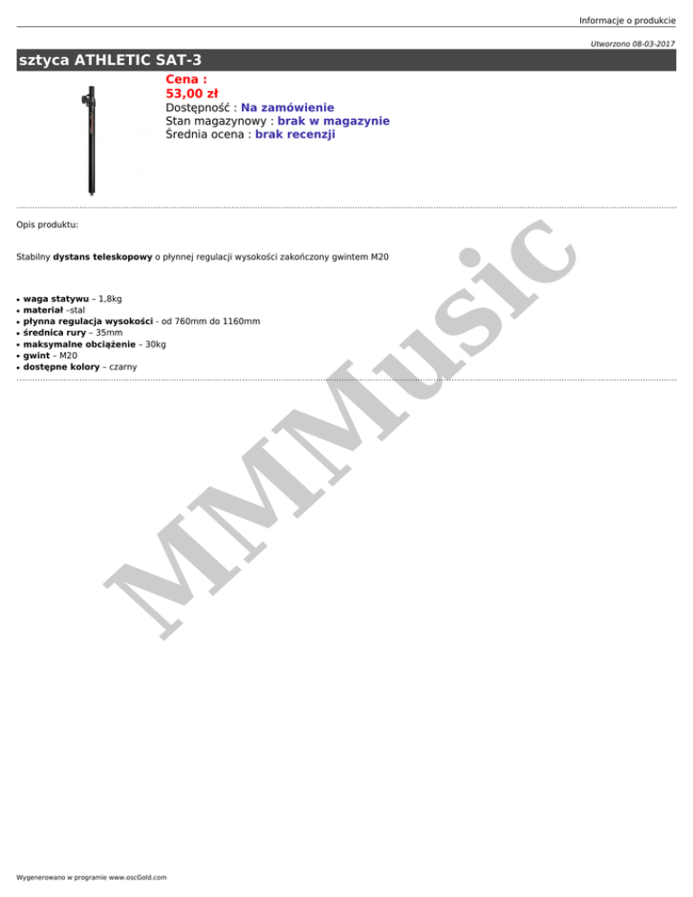 Informacje o produkcie Utworzono 08-03-2017 sztyca ATHLETIC SAT-3 Cena : 53,00 zł Dostępność : Na zamówienie Stan magazynowy : brak w magazynie Średnia ocena : brak recenzji ● ● ● ● ● ● M M M ● waga statywu – 1,8kg materiał –stal płynna regulacja wysokości - od 760mm do 1160mm średnica rury – 35mm maksymalne obciążenie – 30kg gwint – M20 dostępne kolory – czarny us Stabilny dystans teleskopowy o płynnej regulacji wysokości zakończony gwintem M20 Wygenerowano w programie www.oscGold.com ic Opis produktu: