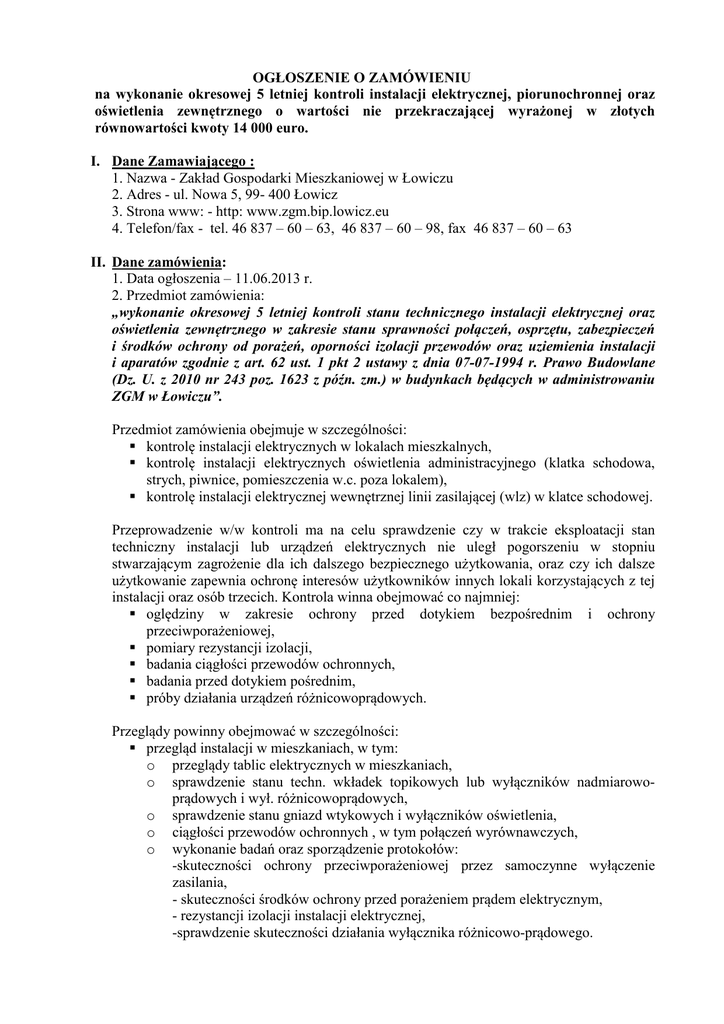OGŁOSZENIE O ZAMÓWIENIU na wykonanie okresowej 5 letniej kontroli instalacji elektrycznej, piorunochronnej oraz oświetlenia zewnętrznego o wartości nie przekraczającej wyrażonej w złotych równowartości kwoty 14 000 euro. I. Dane Zamawiającego : 1. Nazwa - Zakład Gospodarki Mieszkaniowej w Łowiczu 2. Adres - ul. Nowa 5, 99- 400 Łowicz 3. Strona www: - http: www.zgm.bip.lowicz.eu 4. Telefon/fax - tel. 46 837 – 60 – 63, 46 837 – 60 – 98, fax 46 837 – 60 – 63 II. Dane zamówienia: 1. Data ogłoszenia – 11.06.2013 r. 2. Przedmiot zamówienia: „wykonanie okresowej 5 letniej kontroli stanu technicznego instalacji elektrycznej oraz oświetlenia zewnętrznego w zakresie stanu sprawności połączeń, osprzętu, zabezpieczeń i środków ochrony od porażeń, oporności izolacji przewodów oraz uziemienia instalacji i aparatów zgodnie z art. 62 ust. 1 pkt 2 ustawy z dnia 07-07-1994 r. Prawo Budowlane (Dz. U. z 2010 nr 243 poz. 1623 z późn. zm.) w budynkach będących w administrowaniu ZGM w Łowiczu”. Przedmiot zamówienia obejmuje w szczególności: kontrolę instalacji elektrycznych w lokalach mieszkalnych, kontrolę instalacji elektrycznych oświetlenia administracyjnego (klatka schodowa, strych, piwnice, pomieszczenia w.c. poza lokalem), kontrolę instalacji elektrycznej wewnętrznej linii zasilającej (wlz) w klatce schodowej. Przeprowadzenie w/w kontroli ma na celu sprawdzenie czy w trakcie eksploatacji stan techniczny instalacji lub urządzeń elektrycznych nie uległ pogorszeniu w stopniu stwarzającym zagrożenie dla ich dalszego bezpiecznego użytkowania, oraz czy ich dalsze użytkowanie zapewnia ochronę interesów użytkowników innych lokali korzystających z tej instalacji oraz osób trzecich. Kontrola winna obejmować co najmniej: oględziny w zakresie ochrony przed dotykiem bezpośrednim i ochrony przeciwporażeniowej, pomiary rezystancji izolacji, badania ciągłości przewodów ochronnych, badania przed dotykiem pośrednim, próby działania urządzeń różnicowoprądowych. Przeglądy powinny obejmować w szczególności: przegląd instalacji w mieszkaniach, w tym: o przeglądy tablic elektrycznych w mieszkaniach, o sprawdzenie stanu techn. wkładek topikowych lub wyłączników nadmiarowoprądowych i wył. różnicowoprądowych, o sprawdzenie stanu gniazd wtykowych i wyłączników oświetlenia, o ciągłości przewodów ochronnych , w tym połączeń wyrównawczych, o wykonanie badań oraz sporządzenie protokołów: -skuteczności ochrony przeciwporażeniowej przez samoczynne wyłączenie zasilania, - skuteczności środków ochrony przed porażeniem prądem elektrycznym, - rezystancji izolacji instalacji elektrycznej, -sprawdzenie skuteczności działania wyłącznika różnicowo-prądowego. przegląd instalacji na klatkach schodowych, strychach, w piwnicach oraz w.c. poza lokalem (instalacje oświetl. administracyjnego), w tym: o przegląd i ocena sprawności wyłączników, przycisków oraz opraw oświetleniowych, o sprawdzenie stanu techn. wkładek topik. lub wyłączników nadmiarowoprądowych w tabl. administracyjnych, o wykonanie badań oraz sporządzenie protokołów: - skuteczności ochrony przeciwporażeniowej przez samoczynne wyłączenie zasilania, - rezystancji izolacji instalacji elektrycznej. przegląd instalacji wewnętrznej linii zasilania (wlz) w klatce schodowej, w tym: o sprawdzenie stanu technicznego zabezpieczenia budynku (przegląd, ocena sprawności techn. od strony mechanicznej), o przegląd tablic rozdzielczych piętrowych, o sprawdzenie stanu techn. wkładek topik. lub wyłączników nadmiarowoprądowych, o sprawdzenie tablic licznikowych i liczników (obwodów administracyjnych), o sprawdzenie ciągłości przewodów ochronnych, w tym połączeń wyrównawczych, o wykonanie badań i sporządzenie protokołów: - skuteczności ochrony przeciwporażeniowej przez samoczynne wyłączenie zasilania, - rezystancji izolacji instalacji elektrycznej, - sprawdzenie rozdzielnic tablicowych, - sporządzenie schematu ideowego 1-kreskowego wlz instalacji elektrycznej budynku (wg potrzeb, zgodnie z załącznikiem nr 1 do umowy, stanowiącym wykaz budynków) - od zewnętrznego przyłącza kablowego do tablic w mieszkaniach - z opisem rodzaju i przekrojów przewodów oraz stosowanego osprzętu i zabezpieczeń. 3. Zakres zamówienia – budynki mieszkalne zgodnie z załączonym wykazem. 4. Termin realizacji zamówienia do: 31 sierpnia 2013 r. 5. Warunki uczestnictwa; O udzielenie zamówienia mogą ubiegać się Wykonawcy, którzy: posiadają uprawnienia lub dysponują osobami zdolnymi do wykonania, albo będą dysponować osobami posiadającymi następujące uprawnienia: uprawnienia budowlane do wykonywania samodzielnych funkcji technicznych w budownictwie o specjalności elektrycznej oraz świadectwo kwalifikacyjne uprawniające do zajmowania się eksploatacją urządzeń, instalacji i sieci na stanowisku eksploatacji i pomiarów kontrolnych (E i D) i należą do właściwej okręgowej izby samorządu zawodowego: Izby Inżynierów Budownictwa, posiadają niezbędna wiedzę i doświadczenie do wykonania zamówienia oraz dysponują potencjałem technicznym i osobami zdolnymi do wykonania zamówienia, wykonanie usługi musi spełniać warunki określone w: ustawie z dn. 7 lipca 1994 r. Prawo budowlane (tekst jednolity: Dz. U. z 2010 r. Nr 243, poz. 1623 ze zm.) i rozporządzeniach wykonawczych do wyżej wymienionej ustawy, złożą w wymaganym terminie pisemną ofertę. III. Pracownicy upoważnieni do kontaktów: Pani : Agnieszka Michalak, Jolanta Papuga Tel. kontaktowy - 46 837 60 63, 606 66 82 45 Godziny udzielania informacji dotyczących zamówienia: 08.00 – 15.00 IV. Miejsce i termin składania ofert/wniosków: 1. Sposób składania – w siedzibie Zamawiającego 2. Siedziba Zamawiającego: Łowicz, ul. Nowa 5 - sekretariat 3. Termin składania ofert – 26.06.2013 r. do godz. 11:00 V. Atrybuty przetargu: 1. Wartość zamówien