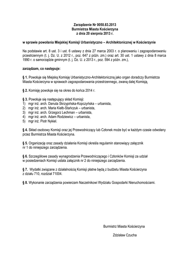 Zarządzenie Nr 0050.83.2013 Burmistrza Miasta Kościerzyna z dnia 20 sierpnia 2013 r. w sprawie powołania Miejskiej Komisji Urbanistyczno – Architektonicznej w Kościerzynie Na podstawie art. 8 ust. 3 i ust. 6 ustawy z dnia 27 marca 2003 r. o planowaniu i zagospodarowaniu przestrzennym (t. j. Dz. U. z 2012 r., poz. 647 z późn. zm.) oraz art. 30 ust. 1 ustawy z dnia 8 marca 1990 r. o samorządzie gminnym (t. j. Dz. U. z 2013 r., poz. 594 z późn. zm.), zarządzam, co następuje: § 1. Powołuje się Miejską Komisję Urbanistyczno-Architektoniczną jako organ doradczy Burmistrza Miasta Kościerzyna w sprawach zagospodarowania przestrzennego, zwaną dalej Komisją. § 2. Komisję powołuje się na okres do końca 2014 r. § 3. Powołuje się następujący skład Komisji: 1) mgr inż. arch. Danuta Skrzypińska-Kopczyńska – urbanista, 2) mgr inż. arch. Maria Kiełb-Stańczuk – urbanista, 3) mgr inż. arch. Grzegorz Lechman – urbanista, 4) mgr inż. arch. Adam Rodziewicz – urbanista, 5) mgr inż. Piotr Nykiel. § 4. Skład osobowy Komisji oraz jej Przewodniczący lub Członek może być w każdym czasie odwołany przez Burmistrza Miasta Kościerzyna. § 5. Organizację oraz zasady działania Komisji określa regulamin stanowiący załącznik nr 1 do niniejszego zarządzenia. § 6. Szczegółowe zasady wynagrodzenia Przewodniczącego i Członków Komisji za udział w posiedzeniach Komisji ustala załącznik nr 2 do niniejszego zarządzenia. § 7. Wydatki związane z działalnością Komisji płatne będą z budżetu Miasta Kościerzyna z działu 710, rozdział 71004. § 8. Wykonanie zarządzenia powierzam Naczelnikowi Wydziału Gospodarki Nieruchomościami. Burmistrz Miasta Kościerzyna Zdzisław Czucha Załącznik Nr 1 do Zarządzenia Nr 0050.83.2013 Burmistrza Miasta Kościerzyna z dnia 20 sierpnia 2013 r. REGULAMIN MIEJSKIEJ KOMISJI URBANISTYCZNO-ARCHITEKTONICZNEJ W KOŚCIERZYNIE ROZDZIAŁ I Postanowienia ogólne § 1. Miejska Komisja Urbanistyczno-Architektoniczna, zwana dalej Komisją jest organem doradczym Burmistrza Miasta Kościerzyna, powołanym w oparciu o art. 8 ust. 3 ustawy z dnia 27 marca 2003 r. o planowaniu i zagospodarowaniu przestrzennym, zwanej dalej ustawą i działa w oparciu o postanowienia niniejszego regulaminu. § 2. 1.Komisja opracowuje opinie w sprawach dotyczących: 1) projektów studium uwarunkowań i kierunków zagospodarowania przestrzennego lub projektów zmiany studium - zgodnie z art. 11 pkt 5 ustawy, 2) projektów miejscowych planów zagospodarowania przestrzennego lub projektów ich zmian – zgodnie z art. 17 pkt 6a ustawy, 3) analizy zmian w zagospodarowaniu przestrzennym gminy, oceny postępów w opracowaniu planów miejscowych oraz wieloletnich programów ich sporządzania – zgodnie z art. 32 ust. 2 ustawy. 2. W razie konieczności Komisja opracowuje opinie w innych sprawach związanych z gospodarką przestrzenną miasta na wniosek Burmistrza Miasta, w tym w sprawach dotyczących projektów decyzji o lokalizacji inwestycji celu publicznego lub ustaleniu warunków zabudowy w odniesieniu do inwestycji mających istotne znaczenie dla wizerunku i funkcjonowania miasta. ROZDZIAŁ II Organizacja i tryb pracy Komisji § 3. 1. W skład Komisji wchodzą: Przewodniczący Komisji oraz jej Członkowie, imiennie powołani przez Burmistrza Miasta. 2. Prawo udziału w posiedzeniach Komisji z głosem doradczym przysługuje: 1) Burmistrzowi Miasta i jego Zastępcy, 2) Naczelnikowi Wydziału Gospodarki Nieruchomościami, 3) Sekretarzowi Komisji, 4) radnym Rady Miejskiej – zaproszonym na posiedzenie, 5) pracownikom Urzędu Miasta – zaproszonym na posiedzenie, 6) ekspertom zaproszonym na posiedzenie. 3. Przewodniczący ma prawo zaprosić przedstawicieli autora opracowania projektowego stanowiącego przedmiot prac Komisji. § 4. 1. Pracą Komisji kieruje Przewodniczący Komisji lub wskazany przez Przewodniczącego jeden z Członków Komisji. 2. Sekretarz Komisji prowadzi obsługę administracyjno-techniczną Komisji. 3. Do obowiązków Przewodniczącego Komisji należy kierowanie pracą Komisji, a w szczególności: 1) zwoływanie posiedzeń Komisji, 2) przewodniczenie obradom Komisji, 3) ustalenie treści opinii, 4) powoływanie ekspertów, 5) wnioskowanie do Burmistrza Miasta w sprawie zmian osobowych w składzie Komisji. 4. Do zadań Sekretarza Komisji należy: 1) obsługa organizacyjno-techniczna Komisji, 2) zawiadamianie członków Komisji oraz zaproszonych osób o terminie i tematyce posiedzeń Komisji, 3) sporządzanie protokołów posiedzeń Komisji oraz przekazywanie zainteresowanym kopii protokołu, 4) sporządzanie opinii Komisji oraz przekazanie jej Burmistrzowi Miasta oraz Naczelnikowi Wydziału Gospodarki Nieruchomościami Urzędu Miasta w terminie 14 dni od daty posiedzenia, 5) prowadzenie archiwum dokumentów związanych z pracą Komisji. 5. Obecni na posiedzeniu Komisji podpisują listę obecności. 6. Protokół z posiedzenia oraz opinię Komisji podpisuje Przewodniczący i Sekretarz. § 5. 1. Sprawy do zaopiniowania kierowane są na Komisję przez Burmistrza Miasta bądź Naczelnika Wydziału Gospodarki Nieruchomościami Urzędu Miasta. 2. Komisja obraduje na posiedzeniach zwoływanych przez Przewodniczącego Komisji stosownie do potrzeb wynikających ze zgłoszonych spraw. 3. Posiedzenie Komisji przygotowuje Przewodniczący przy pomocy Sekretarza. 4. Członkowie Komisji oraz osoby zaproszone o terminie posiedzeń powiadamiani są indywidualnie co najmniej 7 dni przed ustalonym terminem posiedzenia wraz z powiadomieniem przekazywane są informacje dotyczące przedmiotu obrad Komisji. 5. W razie uzasadnionej nieobecności Członkowi Komisji przysługuje prawo do złożenia na piśmie przed planowanym posiedzeniem, własnego stanowiska, co do omawianych spraw. 6. Komisja zobowiązana jest do przedstawienia pisemnej opinii prezentującej stanowisko Komisji dotyczące przedstawionych na posiedzeniu opracowań. 7. Przygotowana opinia podl