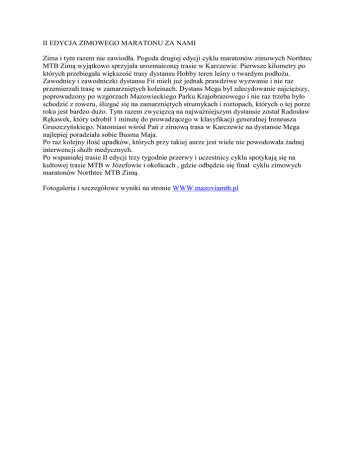 II EDYCJA ZIMOWEGO MARATONU ZA NAMI Zima i tym razem nie zawiodła. Pogoda drugiej edycji cyklu maratonów zimowych Northtec MTB Zimą wyjątkowo sprzyjała urozmaiconej trasie w Karczewie. Pierwsze kilometry po których przebiegała większość trasy dystansu Hobby teren leśny o twardym podłożu. Zawodnicy i zawodniczki dystansu Fit mieli już jednak prawdziwe wyzwanie i nie raz przemierzali trasę w zamarzniętych koleinach. Dystans Mega był zdecydowanie najcięższy, poprowadzony po wzgórzach Mazowieckiego Parku Krajobrazowego i nie raz trzeba było schodzić z roweru, ślizgać się na zamarzniętych strumykach i roztopach, których o tej porze roku jest bardzo dużo. Tym razem zwycięzcą na najważniejszym dystansie został Radosław Rękawek, który odrobił 1 minutę do prowadzącego w klasyfikacji generalnej Ireneusza Gruszczyńskiego. Natomiast wśród Pań z zimową trasa w Karczewie na dystansie Mega najlepiej poradziała sobie Busma Maja. Po raz kolejny ilość upadków, których przy takiej aurze jest wiele nie powodowała żadnej interwencji służb medycznych. Po wspaniałej trasie II edycji trzy tygodnie przerwy i uczestnicy cyklu spotykają się na kultowej trasie MTB w Józefowie i okolicach , gdzie odbędzie się finał cyklu zimowych maratonów Northtec MTB Zimą. Fotogaleria i szczegółowe wyniki na stronie WWW.mazoviamtb.pl