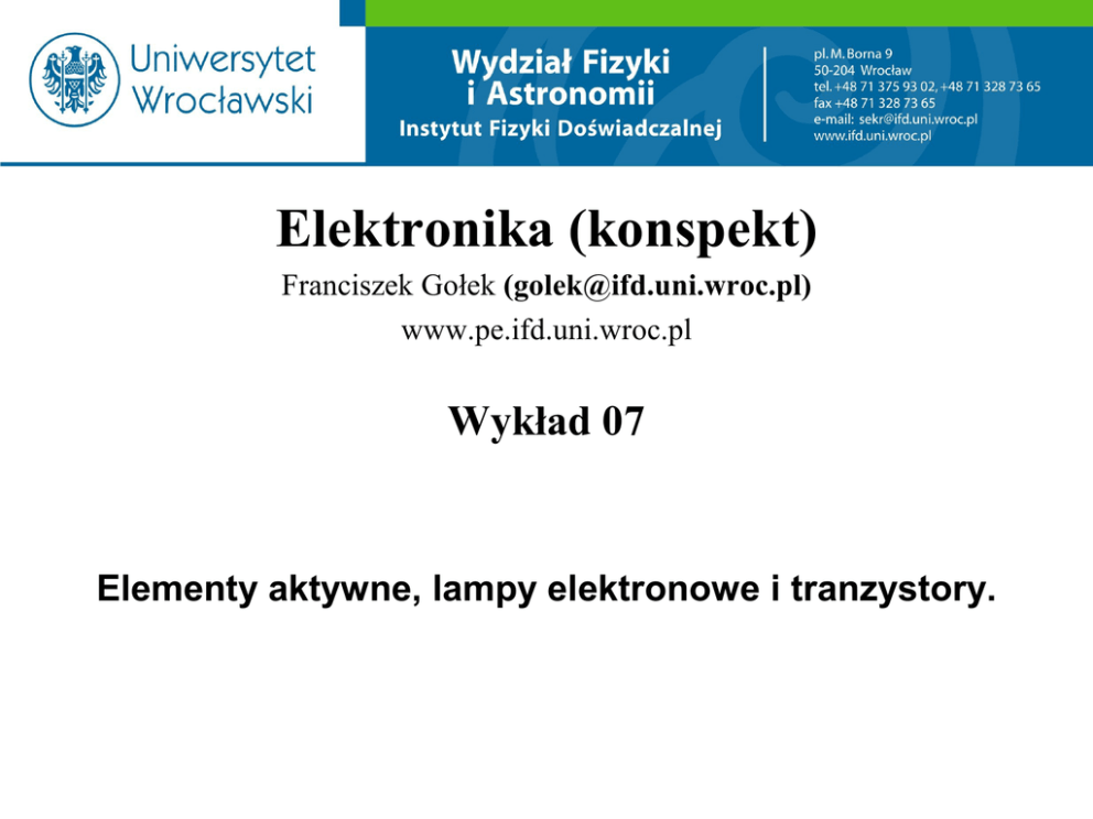Elektronika (konspekt) Franciszek Gołek ([email protected]) www.pe.ifd.uni.wroc.pl Wykład 07 Elementy aktywne, lampy elektronowe i tranzystory. Lampy próżniowe i tranzystory Lampa trioda Tranzystor jest elementem, który zmieniając swoją oporność może wzmacniać sygnały elektryczne w sprzęcie audio albo jako tzw. 0-1 przełącznik realizować funkcje logiczne w obwodach cyfrowych. Znacznie wcześniej przed powstaniem tranzystora wynaleziono Lampę (J.A. Fleming 1904 – dioda próżniowa, Lee De Forest 1906 – trioda próżniowa, I. Langmiur 1912 - wysokopróżniowe lampy radiowe). Poczynając od lampy triody, złożonej z katody, anody oraz umieszczonej między nimi siatki, stało się możliwe sterowanie prądem anoda-katoda przy pomocy pola elektrycznego siatki i małego prądu siatka-katoda. Ten swoisty „zawór” (w którym potencjał siatki przymyka prąd anodowy) zapewnił efekt wzmacniania sygnałów elektrycznych. Dla wielu badaczy efekt wzmocnienia sygnału sterującego triodą był inspiracją w pracach nad otrzymaniem tranzystora. www.angelfire.com/planet/funwithtransistors/Book CHAP-4A.html www.daheiser.info/VTT/TEXT/vacuum%20tube%20characteristic%20equations.pdf Wzmacnianie sygnałów elektrycznych na zasadzie dzielnika napięcia zawierającego jeden sterowalny, zmienny rezystor. Rozważmy układ szeregowo połączonych: sterowanego rezystora zmiennego Rz i rezystora stałego – odbiornika Ro połączonych z zasilaczem tak jak dzielnik napięcia. Mamy tu URo = Ro × U/(Ro + Rz) – napięcie na Ro URz = Rz × U/(Ro + Rz) – napięcie na Rz. Przy zmianie Rz od wartości Rz>>Ro do Rz <<Ro moc wydzielana w Ro zmieni się w przybliżeniu od Pmin = 0 do Pmax = U2/Ro. Zatem impuls mocy wyjściowej wydzielanej w odbiorniku osiągnie wartość Pwy ≈ Pmax = U2/Ro. Jeżeli moc sygnału sterującego Ps, który „pokręcił” rezystorem Rz była mniejsza od Pmax to otrzymaliśmy wzmocnienie sygnału KP = Pwy /Ps. Taki trick można wykonać zarówno przy pomocy lampy jak i tranzystora. Zdolność wpływania sygnału elektrycznego na inny sygnał elektryczny to podstawowa cecha tzw. elementów aktywnych. Obecnie w układach elektronicznych elementy aktywne w postaci tranzystorów występują wyjątkowo obficie. Trioda jako element dzielnika napięcia dającego wzmocnienie sygnału elektrycznego. Dzięki dużej przeźroczystości siatki S wielokrotnie mniej elektronów trafia w siatkę niż zostaje przez nią przepuszczonych do anody co już powodując wzmocnienie prądowe. Z rodziny charakterystyk statycznych na poniższym rysunku widać, że ∆US < ∆Ua (8V<90V) co daje wzmocnienia napięciowe. Dodatkowo mamy: Ia>IS oraz ∆Ia> ∆IS co w rezultacie daje znaczne wzmocnienie mocy. ∆Ua × ∆Ia >> ∆Ua × ∆IS ∆PRa >> ∆PSterujące http://ecclab.com/start.php3?ID=6. Parametry lampy. Oznaczenia: Ua - Napięcie anodowe (względem katody). Ia - Prąd anodowy Us - Napięcie siatka – katoda, ∆ – symbol małej zmiany (przyrostu), Ra - rezystor anodowy (obciążenie). ra (lub ρa) - dynamiczna rezystancja anodowa: ra = ∆Ua/∆Ia przy stałym napięciu siatki US gm - transkonduktancja (lub Sa - nachylenie charakterystyki): gm = ∆Ia/∆US przy stałym napięciu anody Ua. µ (lub ka) - współczynnik amplifikacji: µ = I∆Ua/∆USI przy stałym prądzie anodowym Ia. Występuje związek między współczynnikiem amplifikacji µ, rezystancją dynamiczną anodową ra i transkonduktancją gm (nachyleniem charakterystyki Sa): µ = ra × gm (lub ka= ρa × Sa) Wzmocnienie napięciowe kU = µ × Ra/( ra+Ra) kU = ka × Ra/(ρa +Ra) Zanim przejdziemy do omawiania tranzystora warto wspomnieć oprócz triody, o takich lampach jak tetroda czy pentoda. Trioda jest lampą trójelektrodową i najprostszą zapewniającą efekt wzmocnienia. Poprawiając charakterystyki wzmacniacza w lampie dodano drugą siatkę (o stałym potencjale dodatnim) aby zmniejszyć pojemność pasożytniczą między anodą a siatką pierwszą „sterującą” – tak powstała tetroda. Tetroda miała jednak poważną wadę polegającą na tym, że część elektronów wtórnych, wybijanych z anody była przechwytywana przez dodaną siatkę drugą. Taki efekt, zwany dynatronowym, powodował wklęśnięcia na charakterystykach anodowych lampy (Ia=Ia(Ua)) a przez to poważne zniekształcenia wzmacnianego sygnału. Aby tego uniknąć dodano jeszcze jedną, trzecią siatkę – tak powstała pentoda. Siatka trzecia w pentodzie zwykle ma potencjał zerowy (czyli jest zwarta z katodą) i dzięki temu stanowi barierę dla elektronów wtórnych z anody. Elektrony wtórne są zawracane do anody i efekt dynatronowy tu nie występuje. Oprócz pentod z siatką zerową (antydynatronową) stosowane były również pentody z podwójnym sterowaniem, tzw. pentody mieszające. W takich pentodach siatka trzecia była drugą siatką sterującą. Takie pentody można było stosować w układach koincydencyjnych i antykoincydencyjnych jak również do przemiany częstotliwości (czy modulacji sygnałów w.cz.). Ich wadą znowu była duża pojemność między anodą a siatką trzecią (S3) ograniczając od góry częstotliwość sygnałów doprowadzanych do siatki S3. W heptodzie mamy dwie dodatkowe siatki ekranujące (S1 i S3 sterujące a S2 i S4 ekranujące albo S1 i S4 sterujące a S3 i S5 ekranujące z S2 jako specjalnej siatki-anody dla heterodyny – lokalnego generatora). TRANZYSTORY W 1926r. Julius Lilienfeld (autor wielu patentów) opatentował ideę, że słabo przewodzący materiał umieszczany w polu elektrycznym będzie zmieniał swoje przewodnictwo pozwalając na uzyskanie efektu wzmocnienia (i może też efektu przełączenia). Poszukiwania realizacji tej idei trwały wiele lat. Przemysł telekomunikacyjny stosował w tym czasie niedogodne lampy próżniowe i przełączniki. Po wojnie w roku 1946 Mervin Kelly dyrektor laboratoriów Bell’a powołał grupę badawczą dla opracowania stałociałowych substyt